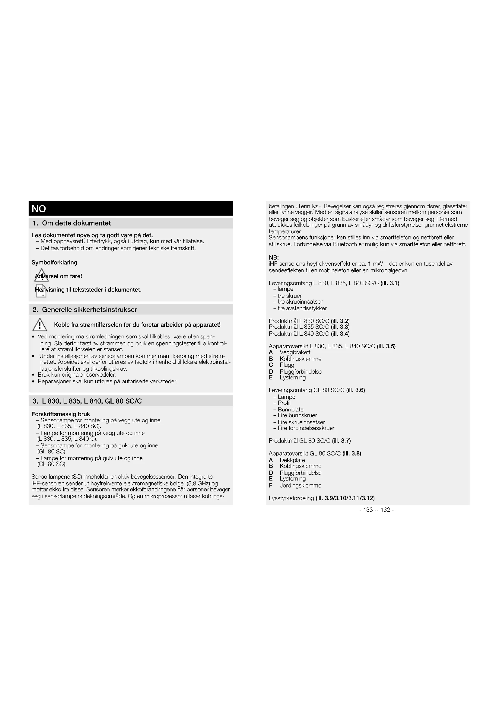 Forskriftsmessig bruk – Sensorlampe for montering på vegg ute og inne (L 830, L 835, L 840 SC). – Lampe for montering på vegg ute og inne (L 830, L 835, L 840 C). – Sensorlampe for montering på gulv ute og inne (GL 80 SC). – Lampe for montering på gulv ute og inne (GL 80 SC). Sensorlampene (SC) inneholder en aktiv bevegelsessensor. Den integrerte iHF-sensoren sender ut høyfrekvente elektromagnetiske bølger (5,8GHz) og mottar ekko fra disse. Sensoren merker ekkoforandringene når personer beveger seg i sensorlampens dekningsområde. Og en mikroprosessor utløser koblings-