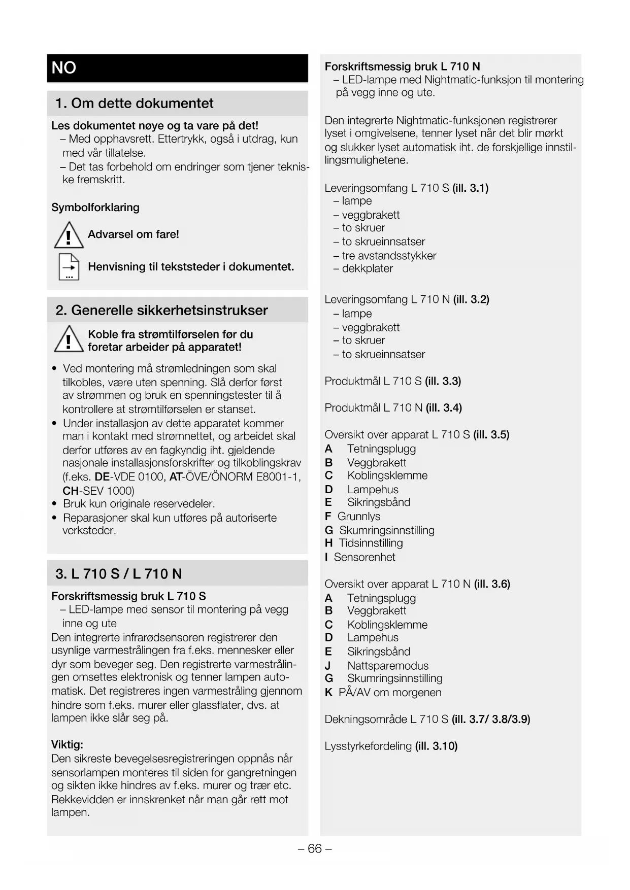 Forskriftsmessig bruk L 710 S – LED-lampe med sensor til montering på vegg inne og ute Den integrerte infrarødsensoren registrerer den usynlige varmestrålingen fra f.eks. mennesker eller dyr som beveger seg. Den registrerte varmestrålin- gen omsettes elektronisk og tenner lampen auto- matisk. Det registreres ingen varmestråling gjennom hindre som f.eks. murer eller glassflater, dvs. at lampen ikke slår seg på. Viktig: Den sikreste bevegelsesregistreringen oppnås når sensorlampen monteres til siden for gangretningen og sikten ikke hindres av f.eks. murer og trær etc. Rekkevidden er innskrenket når man går rett mot lampen. Forskriftsmessig bruk L 710 N – LED-lampe med Nightmatic-funksjon til montering på vegg inne og ute. Den integrerte Nightmatic-funksjonen registrerer lyset i omgivelsene, tenner lyset når det blir mørkt og slukker lyset automatisk iht. de forskjellige innstil- lingsmulighetene. Leveringsomfang L 710 S (ill.3.1) – lampe – veggbrakett – to skruer – to skrueinnsatser – tre avstandsstykker – dekkplater Leveringsomfang L 710 N (ill.3.2) – lampe – veggbrakett – to skruer – to skrueinnsatser Produktmål L 710 S (ill.3.3) Produktmål L 710 N (ill.3.4) Oversikt over apparat L 710 S (ill.3.5) A Tetningsplugg B Veggbrakett C Koblingsklemme D Lampehus E Sikringsbånd F Grunnlys G Skumringsinnstilling H Tidsinnstilling I Sensorenhet Oversikt over apparat L 710 N (ill.3.6) A Tetningsplugg B Veggbrakett C Koblingsklemme D Lampehus E Sikringsbånd J Nattsparemodus G Skumringsinnstilling K PÅ/AV om morgenen Dekningsområde L 710 S (ill.3.7/ 3.8/3.9) Lysstyrkefordeling (ill.3.10)– 67 –