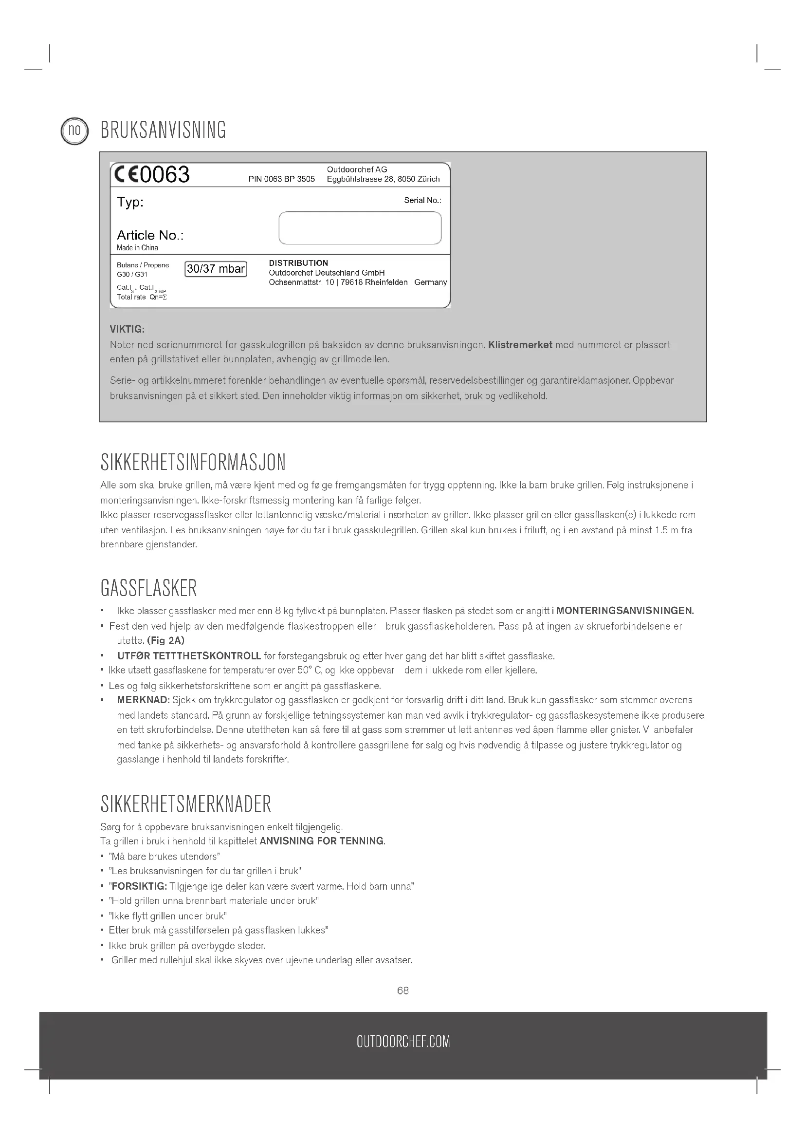 - MERKNAD: Sjekk om trykkregulator og gassflasken er godkjent for forsvarlig drift i ditt land. Bruk kun gassflasker som stemmer overens med landets standard. På grunn av forskjellige tetningssystemer kan man ved avvik i trykkregulator- og gassflaskesystemene ikke produsere en tett skruforbindelse. Denne utettheten kan så føre til at gass som strømmer ut lett antennes ved åpen flamme eller gnister. Vi anbefaler med tanke på sikkerhets- og ansvarsforhold å kontrollere gassgrillene før salg og hvis nødvendig å tilpasse og justere trykkregulator og gasslange i henhold til landets forskrifter. SIKKERHETSMERKNADER Sørg for å oppbevare bruksanvisningen enkelt tilgjengelig.Ta grillen i bruk i henhold til kapittelet ANVISNING FOR TENNING.• ”Må bare brukes utendørs”• ”Les bruksanvisningen før du tar grillen i bruk”• ”FORSIKTIG: Tilgjengelige deler kan være svært varme. Hold barn unna”• ”Hold grillen unna brennbart materiale under bruk”• ”Ikke flytt grillen under bruk”• Etter bruk må gasstilførselen på gassflasken lukkes”• Ikke bruk grillen på overbygde steder.• Griller med rullehjul skal ikke skyves over ujevne underlag eller avsatser.VIKTIG: Noter ned serienummeret for gasskulegrillen på baksiden av denne bruksanvisningen. Klistremerket med nummeret er plassert enten på grillstativet eller bunnplaten, avhengig av grillmodellen. Serie- og artikkelnummeret forenkler behandlingen av eventuelle spørsmål, reservedelsbestillinger og garantireklamasjoner. Oppbevar bruksanvisningen på et sikkert sted. Den inneholder viktig informasjon om sikkerhet, bruk og vedlikehold. Total rate Qn=Σ Typ: PIN 0063 BP 3505Outdoorchef AGEggbühlstrasse 28, 8050 Zürich