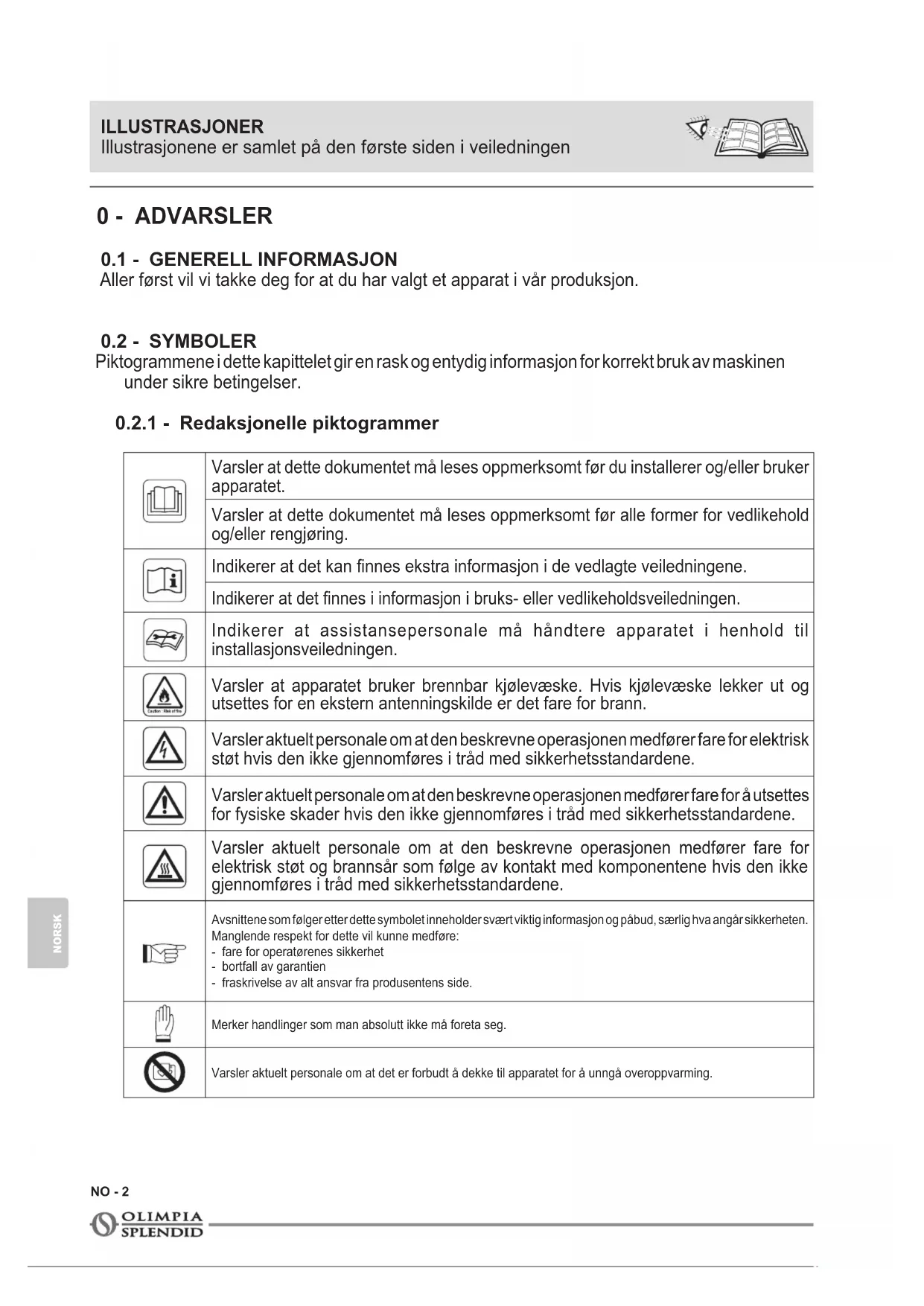 uten uttrykkelig skriftlig tillatelse fra selskapet OLIMPIA SPLENDID. Maskinene kan gjennomgå oppdateringer og derfor ha enkelte andre egenskaper enn dem som vises, uten at dette har noen betydning for teksten i denne veiledningen.