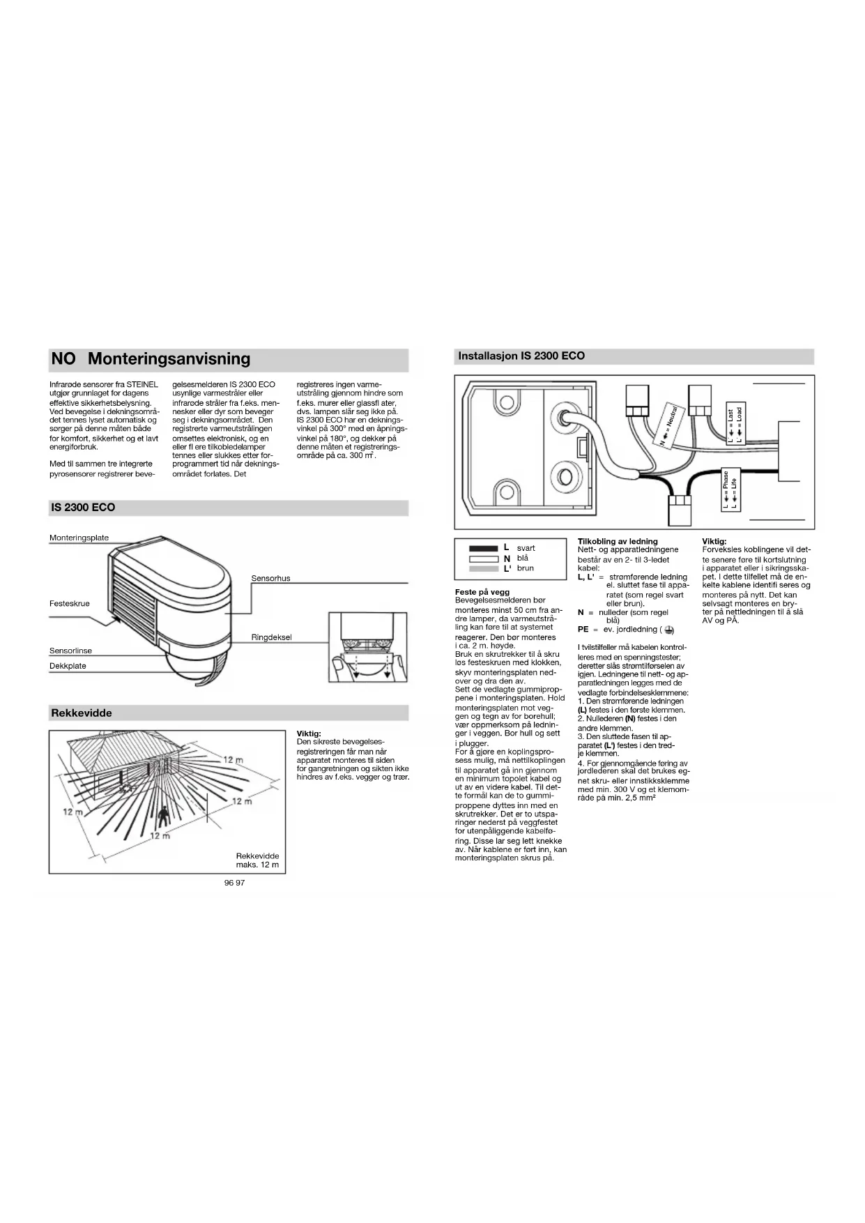 Monteringsanvisning Infrarøde sensorer fra STEINEL utgjør grunnlaget for dagens effektive sikkerhetsbelysning. Ved bevegelse i dekningsområ- det tennes lyset automatisk og sørger på denne måten både for komfort, sikkerhet og et lavt energiforbruk. Med til sammen tre integrerte pyrosensorer registrerer beve- gelsesmelderen IS2300ECO usynlige varmestråler eller infrarøde stråler fra f.eks. men- nesker eller dyr som beveger seg i dekningsområdet. Den registrerte varmeutstrålingen omsettes elektronisk, og en eller fl ere tilkoblede lamper tennes eller slukkes etter for- programmert tid når deknings- området forlates. Det registreres ingen varme- utstråling gjennom hindre som f.eks. murer eller glassfl ater, dvs. lampen slår seg ikke på. IS2300ECO har en deknings- vinkel på 300° med en åpnings- vinkel på 180°, og dekker på denne måten et registrerings- område på ca. 300 m
