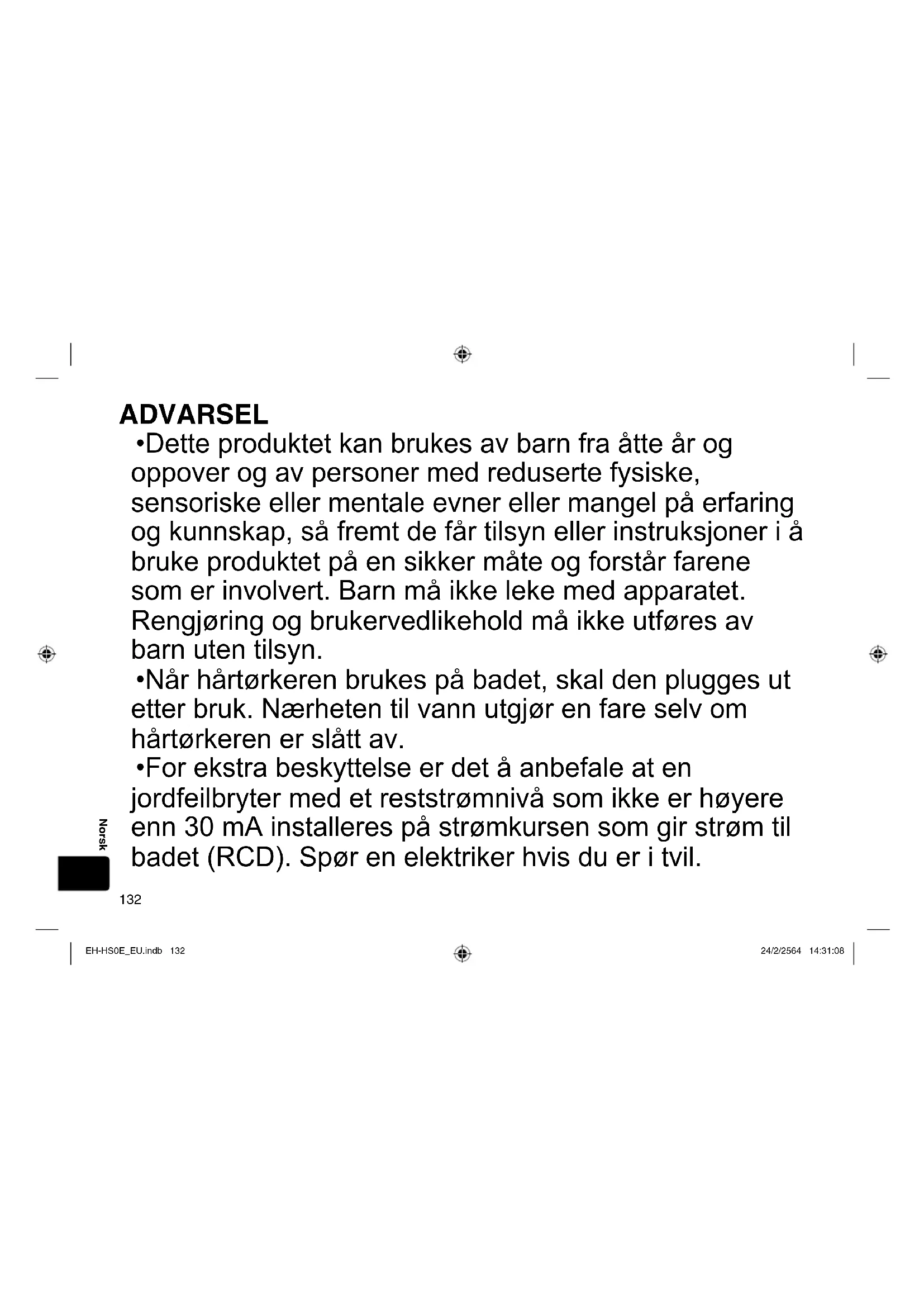 - For ekstra beskyttelse er det å anbefale at en jordfeilbryter med et reststrømnivå som ikke er høyere enn 30 mA installeres på strømkursen som gir strøm til badet (RCD). Spør en elektriker hvis du er i tvil. EH-HS0E_EU.indb 132EH-HS0E_EU.indb 132 24/2/2564 14:31:0824/2/2564 14:31:08133 Norsk