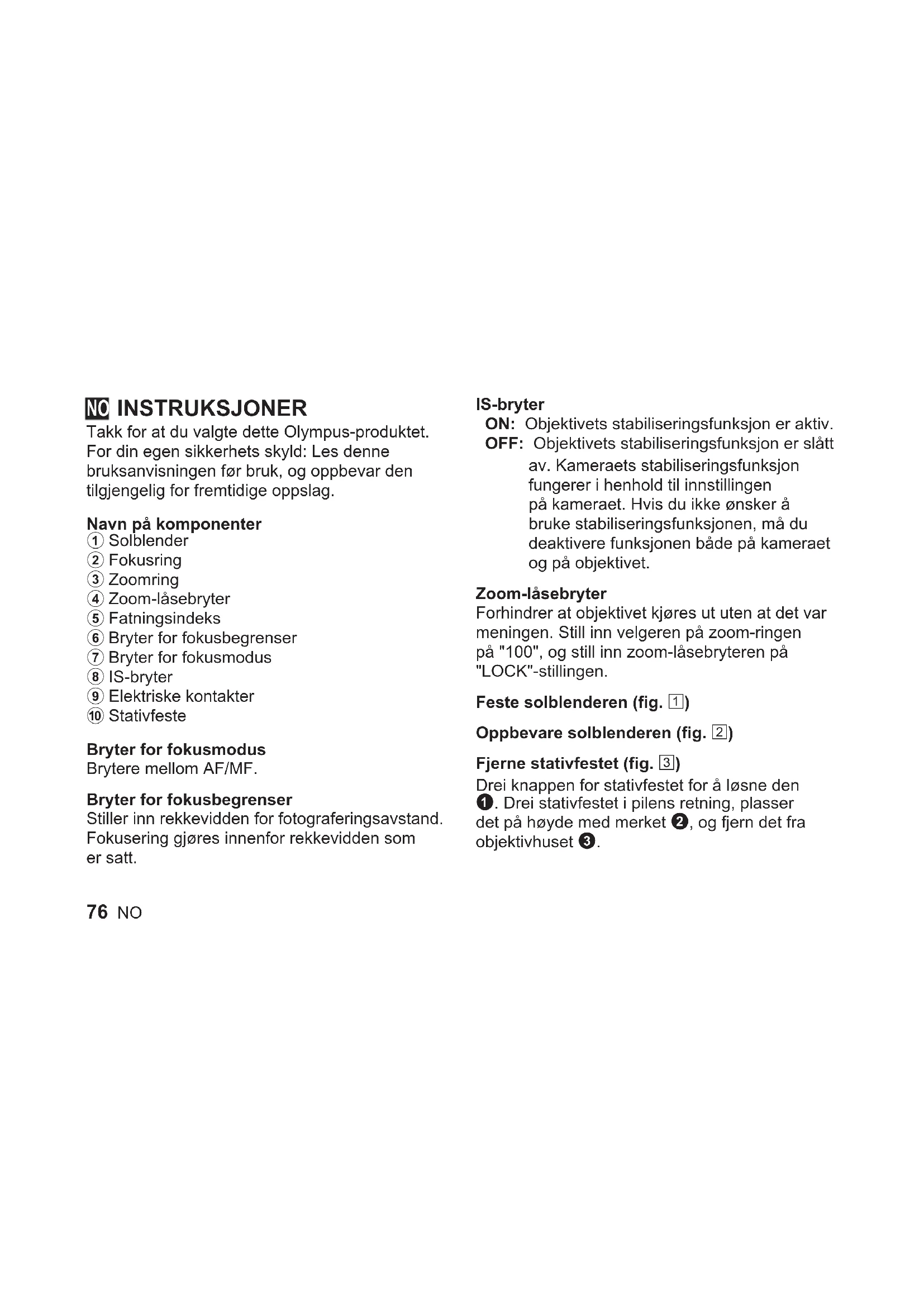 Stativfeste Bryter for fokusmodus Brytere mellom AF/MF. Bryter for fokusbegrenser Stiller inn rekkevidden for fotograferingsavstand. Fokusering gjøres innenfor rekkevidden som er satt. IS-bryter ON: Objektivets stabiliseringsfunksjon er aktiv. OFF: Objektivets stabiliseringsfunksjon er slått av. Kameraets stabiliseringsfunksjon fungerer i henhold til innstillingen på kameraet. Hvis du ikke ønsker å bruke stabiliseringsfunksjonen, må du deaktivere funksjonen både på kameraet og på objektivet. Zoom-låsebryter Forhindrer at objektivet kjøres ut uten at det var meningen. Still inn velgeren på zoom-ringen på "100", og still inn zoom-låsebryteren på "LOCK"-stillingen. Feste solblenderen (fig. 1) Oppbevare solblenderen (fig. 2) Fjerne stativfestet (fig. 3) Drei knappen for stativfestet for å løsne den