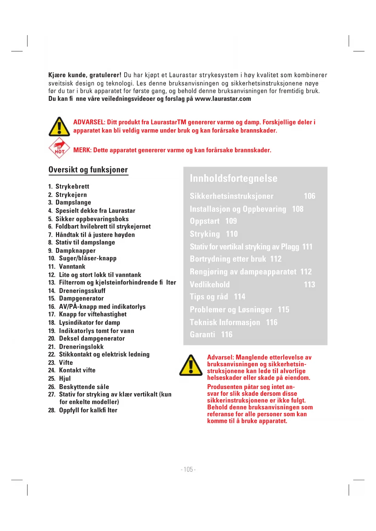 dowej będzie miało miejsce od czerwca 2017. PL- 105 - Advarsel: Manglende etterlevelse av bruksanvisningen og sikkerhetsin- struksjonene kan lede til alvorlige helseskader eller skade på eiendom. Produsenten påtar seg intet an- svar for slik skade dersom disse sikkerinstruksjonene er ikke fulgt. Behold denne bruksanvisningen som referanse for alle personer som kan komme til å bruke apparatet. ADVARSEL: Ditt produkt fra LaurastarTM genererer varme og damp. Forskjellige deler i apparatet kan bli veldig varme under bruk og kan forårsake brannskader. MERK: Dette apparatet genererer varme og kan forårsake brannskader. Innholdsfortegnelse Sikkerhetsinstruksjoner 106 Installasjon og Oppbevaring 108 Oppstart 109 Stryking 110 Stativ for vertikal stryking av Plagg 111 Bortrydning etter bruk 112 Rengjøring av dampeapparatet 112 Vedlikehold 113 Tips og råd 114 Problemer og Løsninger 115 Teknisk Informasjon 116 Garanti 116 Kjære kunde, gratulerer! Du har kjøpt et Laurastar strykesystem i høy kvalitet som kombinerer sveitsisk design og teknologi. Les denne bruksanvisningen og sikkerhetsinstruksjonene nøye før du tar i bruk apparatet for første gang, og behold denne bruksanvisningen for fremtidig bruk. Du kan nne våre veiledningsvideoer og forslag på www.laurastar.com Oversikt og funksjoner