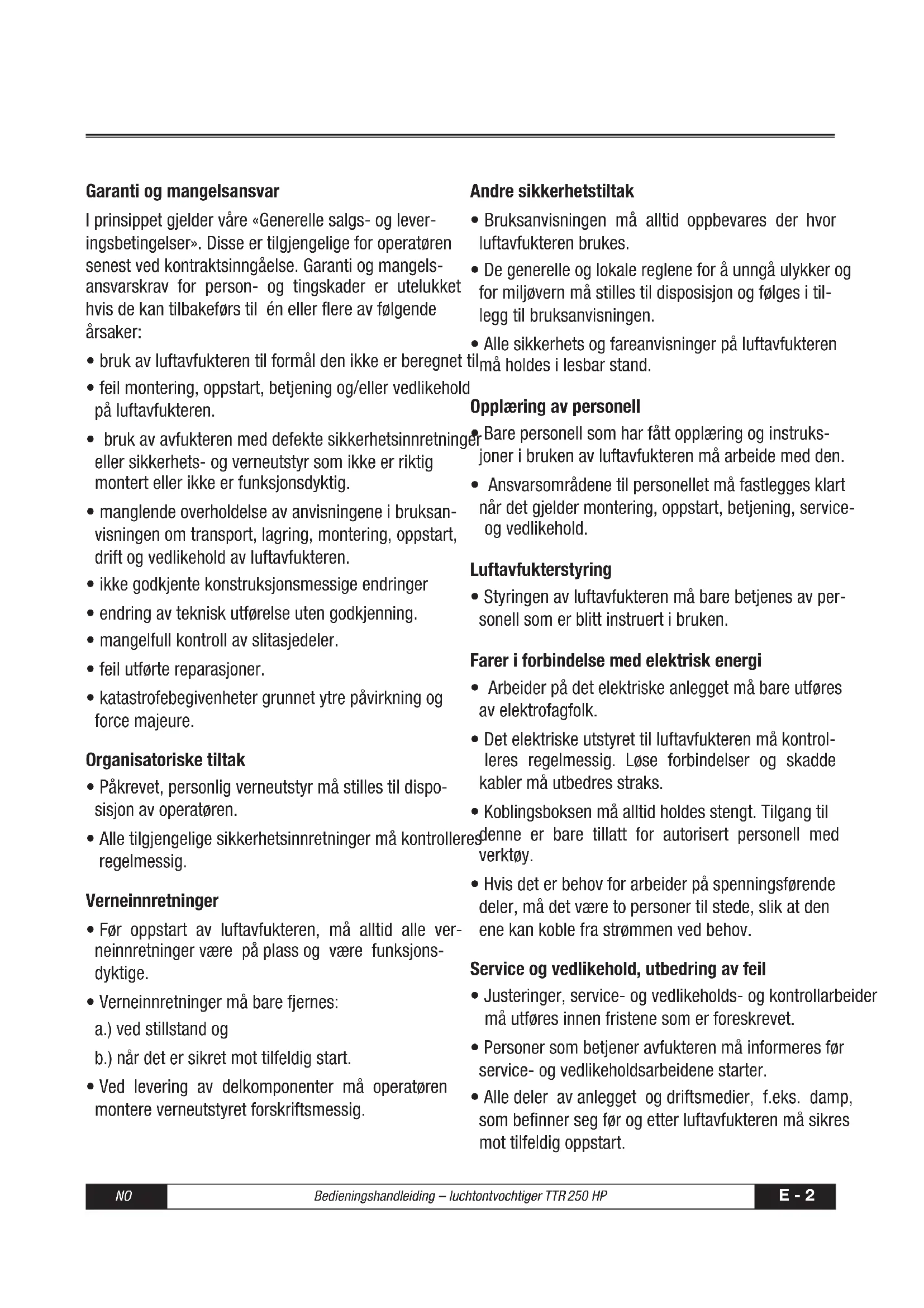 - å overholde kontroll- og service- og vedlikeholdsar- beidene.NO Bedieningshandleiding – luchtontvochtiger TTR 250 HP E - 2 Garanti og mangelsansvar I prinsippet gjelder våre «Generelle salgs- og lever- ingsbetingelser». Disse er tilgjengelige for operatøren senest ved kontraktsinngåelse. Garanti og mangels- ansvarskrav for person- og tingskader er utelukket hvis de kan tilbakeførs til én eller flere av følgende årsaker: