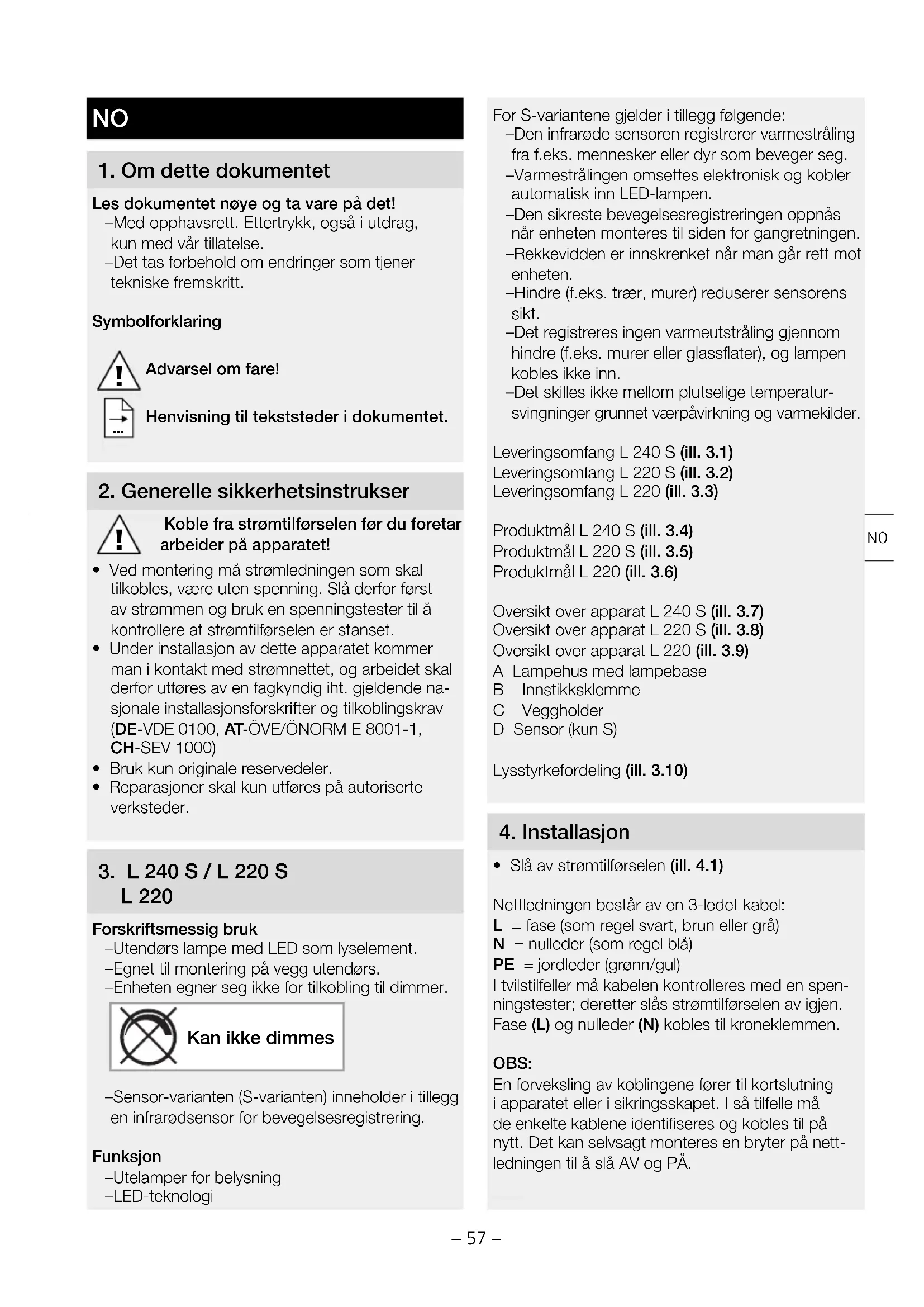 L 220 Forskriftsmessig bruk – Utendørs lampe med LED som lyselement. – Egnet til montering på vegg utendørs. – Enheten egner seg ikke for tilkobling til dimmer. Kan ikke dimmes – Sensor-varianten (S-varianten) inneholder i tillegg en infrarødsensor for bevegelsesregistrering. Funksjon – Utelamper for belysning – LED-teknologi For S-variantene gjelder i tillegg følgende: – Den infrarøde sensoren registrerer varmestråling fra f.eks. mennesker eller dyr som beveger seg. – Varmestrålingen omsettes elektronisk og kobler automatisk inn LED-lampen. – Den sikreste bevegelsesregistreringen oppnås når enheten monteres til siden for gangretningen. – Rekkevidden er innskrenket når man går rett mot enheten. – Hindre (f.eks. trær, murer) reduserer sensorens sikt. – Det registreres ingen varmeutstråling gjennom hindre (f.eks. murer eller glassflater), og lampen kobles ikke inn. – Det skilles ikke mellom plutselige temperatur- svingninger grunnet værpåvirkning og varmekilder. Leveringsomfang L 240 S (ill. 3.1) Leveringsomfang L 220 S (ill. 3.2) Leveringsomfang L 220 (ill. 3.3) Produktmål L 240 S (ill. 3.4) Produktmål L 220 S (ill. 3.5) Produktmål L 220 (ill. 3.6) Oversikt over apparat L 240 S (ill. 3.7) Oversikt over apparat L 220 S (ill. 3.8) Oversikt over apparat L 220 (ill. 3.9) A Lampehus med lampebase B Innstikksklemme C Veggholder D Sensor (kun S) Lysstyrkefordeling (ill. 3.10)