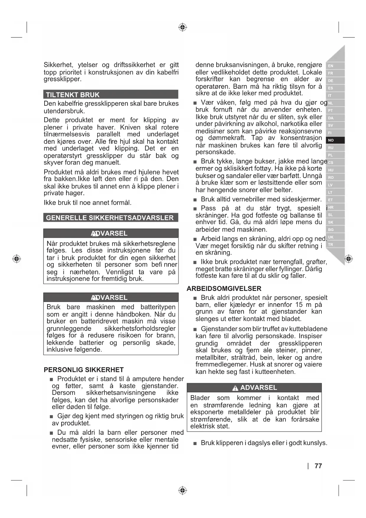 Osat ja lisävarusteet on hankittava erikseen Huom Varoitus 76 | SuomiSikkerhet, ytelser og driftssikkerhet er gitt topp prioritet i konstruksjonen av din kabelfri gressklipper. TILTENKT BRUK Den kabelfrie gressklipperen skal bare brukes utendørsbruk. Dette produktet er ment for klipping av plener i private haver. Kniven skal rotere tilnærmelsesvis parallelt med underlaget den kjøres over. Alle fi re hjul skal ha kontakt med underlaget ved klipping. Det er en operatørstyrt gressklipper du står bak og skyver foran deg manuelt. Produktet må aldri brukes med hjulene hevet fra bakken.Ikke løft den eller ri på den. Den skal ikke brukes til annet enn å klippe plener i private hager. Ikke bruk til noe annet formål. GENERELLE SIKKERHETSADVARSLER ADVARSEL Når produktet brukes må sikkerhetsreglene følges. Les disse instruksjonene før du tar i bruk produktet for din egen sikkerhet og sikkerheten til personer som befi nner seg i nærheten. Vennligst ta vare på instruksjonene for fremtidig bruk. ADVARSEL Bruk bare maskinen med batteritypen som er angitt i denne håndboken. Når du bruker en batteridrevet maskin må visse grunnleggende sikkerhetsforholdsregler følges for å redusere risikoen for brann, lekkende batterier og personlig skade, inklusive følgende. PERSONLIG SIKKERHET ■ Produktet er i stand til å amputere hender og føtter, samt å kaste gjenstander. Dersom sikkerhetsanvisningene ikke følges, kan det ha alvorlige personskader eller døden til følge. ■ Gjør deg kjent med styringen og riktig bruk av produktet. ■ Du må aldri la barn eller personer med nedsatte fysiske, sensoriske eller mentale evner, eller personer som ikke kjenner tid denne bruksanvisningen, å bruke, rengjøre eller vedlikeholdet dette produktet. Lokale forskrifter kan begrense en alder av operatøren. Barn må ha riktig tilsyn for å sikre at de ikke leker med produktet. ■ Vær våken, følg med på hva du gjør og bruk fornuft når du anvender enheten. Ikke bruk utstyret når du er sliten, syk eller under påvirkning av alkohol, narkotika eller medisiner som kan påvirke reaksjonsevne og dømmekraft. Tap av konsentrasjon når maskinen brukes kan føre til alvorlig personskade. ■ Bruk tykke, lange bukser, jakke med lange ermer og sklisikkert fottøy. Ha ikke på korte bukser og sandaler eller vær barføtt. Unngå å bruke klær som er løstsittende eller som har hengende snorer eller belter. ■ Bruk alltid vernebriller med sideskjermer. ■ Pass på at du står trygt, spesielt i skråninger. Ha god fotfeste og ballanse til enhver tid. Gå, du må aldri løpe mens du arbeider med maskinen. ■ Arbeid langs en skråning, aldri opp og ned. Vær meget forsiktig når du skifter retning i en skråning. ■ Ikke bruk produktet nær terrengfall, grøfter, meget bratte skråninger eller fyllinger. Dårlig fotfeste kan føre til at du sklir og faller. ARBEIDSOMGIVELSER ■ Bruk aldri produktet når personer, spesielt barn, eller kjæledyr er innenfor 15 m på grunn av faren for at gjenstander kan slenges ut etter kontakt med bladet. ■ Gjenstander som blir truffet av kuttebladene kan føre til alvorlig personskade. Inspiser grundig området der gressklipperen skal brukes og fjern ale steiner, pinner, metallbiter, stråltråd, bein, leker og andre fremmedlegemer. Husk at snorer og vaiere kan hekte seg fast i kutteenheten. ADVARSEL Blader som kommer i kontakt med en strømførende ledning kan gjøre at eksponerte metalldeler på produktet blir strømførende, slik at de kan forårsake elektrisk støt. ■ Bruk klipperen i dagslys eller i godt kunslys. 77 Norsk