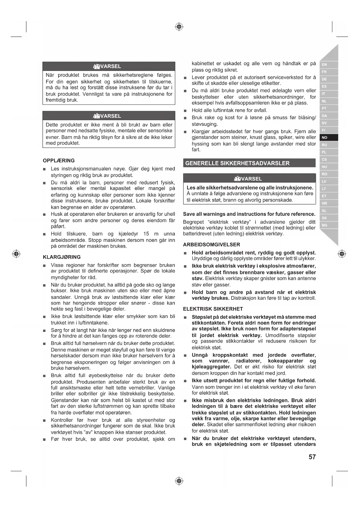 57 Norsk | ADVARSEL Når produktet brukes må sikkerhetsreglene følges. For din egen sikkerhet og sikkerheten til tilskuerne, må du ha lest og forstått disse instruksene før du tar i bruk produktet. Vennligst ta vare på instruksjonene for fremtidig bruk. ADVARSEL Dette produktet er ikke ment å bli brukt av barn eller personer med nedsatte fysiske, mentale eller sensoriske evner. Barn må ha riktig tilsyn for å sikre at de ikke leker med produktet. OPPLÆRING Ŷ Les instruksjonsmanualen nøye. Gjør deg kjent med styringen og riktig bruk av produktet. Ŷ Du må aldri la barn, personer med redusert fysisk, sensorisk eller mental kapasitet eller mangel på erfaring og kunnskap eller personer som ikke kjenner disse instruksene, bruke produktet. Lokale forskrifter kan begrense en alder av operatøren. Ŷ Husk at operatøren eller brukeren er ansvarlig for uhell og farer som andre personer og deres eiendom får påført. Ŷ Hold tilskuere, barn og kjæledyr 15 m unna arbeidsområde. Stopp maskinen dersom noen går inn på området der maskinen brukes. KLARGJØRING Ŷ Visse regioner har forskrifter som begrenser bruken av produktet til definerte operasjoner. Spør de lokale myndigheter for råd. Ŷ Når du bruker produktet, ha alltid på gode sko og lange bukser. Ikke bruk maskinen uten sko eller med åpne sandaler. Unngå bruk av løstsittende klær eller klær som har hengende stropper eller snører - disse kan hekte seg fast i bevegelige deler. Ŷ Ikke bruk løstsittende klær eller smykker som kan bli trukket inn i luftinntakene. Ŷ Sørg for at langt hår ikke når lenger ned enn skuldrene for å hindre at det kan fanges opp av roterende deler. Ŷ Bruk alltid full hørselvern når du bruker dette produktet. Denne maskinen er meget støyfull og kan føre til varige hørselskader dersom man ikke bruker hørselvern for å begrense eksponeringen og følger anvisningen om å bruke hørselvern. Ŷ Bruk alltid full øyebeskyttelse når du bruker dette produktet. Produsenten anbefaler sterkt bruk av en full ansiktsmaske eller helt tette vernebriller. Vanlige briller eller solbriller gir ikke tilstrekkelig beskyttelse. Gjenstander kan når som helst bli kastet ut med stor fart av den sterke luftstrømmen og kan sprette tilbake fra harde overflater mot operatøren. Ŷ Kontroller før hver bruk at alle styreenheter og sikkerhetsanordninger fungerer som de skal. Ikke bruk verktøyet hvis ”av” knappen ikke stanser produktet. Ŷ Før hver bruk, se alltid over produktet, sjekk om kabinettet er uskadet og alle vern og håndtak er på plass og riktig sikret. Ŷ Lever produktet på et autorisert serviceverksted for å skifte ut skadde eller uleselige etiketter. Ŷ Du må aldri bruke produktet med ødelagte vern eller beskyttelser eller uten sikkerhetsanordninger, for eksempel hvis avfallsoppsamleren ikke er på plass. Ŷ Hold alle luftinntak rene for avfall. Ŷ %UXN UDNH RJ NRVWIRU n O¡VQH Sn VPXVV I¡U EOnVLQJ støvsuging. Ŷ Klargjør arbeidsstedet før hver gangs bruk. Fjern alle gjenstander som steiner, knust glass, spiker, wire eller hyssing som kan bli slengt lange avstander med stor fart. GENERELLE SIKKERHETSADVARSLER ADVARSEL Les alle sikkerhetsadvarslene og alle instruksjonene. Å unnlate å følge advarslene og instruksjonene kan føre til elektrisk støt, brann og alvorlig personskade. Save all warnings and instructions for future reference. Begrepet “elektrisk verktøy” i advarslene gjelder ditt elektriske verktøy koblet til strømnettet (med ledning) eller batteridrevet (uten ledning) elektrisk verktøy. ARBEIDSOMGIVELSER Ŷ Hold arbeidsområdet rent, ryddig og godt opplyst. Uryddige og dårlig opplyste områder fører lett til ulykker. Ŷ Ikke bruk elektrisk verktøy i eksplosive atmosfærer, som der det finnes brennbare væsker, gasser eller støv. Elektrisk verktøy skaper gnister som kan antenne støv eller gasser. Ŷ Hold barn og andre på avstand når et elektrisk verktøy brukes. Distraksjon kan føre til tap av kontroll. ELEKTRISK SIKKERHET Ŷ Støpslet på det elektriske verktøyet må stemme med stikkontakten. Foreta aldri noen form for endringer av støpslet. Ikke bruk noen form for adapterstøpsel til jordet elektrisk verktøy. Umodifiserte støpsler og passende stikkontakter vil redusere risikoen for elektrisk støt. Ŷ Unngå kroppskontakt med jordede overflater, som vannrør, radiatorer, kokeapparater og kjøleaggregater. Det er økt risiko for elektrisk støt dersom kroppen din har kontakt med jord. Ŷ Ikke utsett produktet for regn eller fuktige forhold. Vann som trenger inn i et elektrisk verktøy vil øke faren for elektrisk støt. Ŷ Ikke misbruk den elektriske ledningen. Bruk aldri ledningen til å bære det elektriske verktøyet eller trekke støpslet ut av stikkontakten. Hold ledningen vekk fra varme, olje, skarpe kanter eller bevegelige deler. Skadet eller sammenfloket ledning øker risikoen for elektrisk støt. Ŷ Når du bruker det elektriske verktøyet utendørs, bruk en skjøteledning som er tilpasset utendørs58 | Norsk bruk. Bruk av ledning som er tilpasset utendørs bruk reduserer risikoen for elektrisk støt. Ŷ Dersom bruk av elektrisk verktøy i fuktige omgivelser ikke er til å unngå, bruk en strømkrets med sikring som er tilpasset verktøyet. Bruk av strømkrets med sikring reduserer risikoen for elektrisk støt. PERSONLIG SIKKERHET Ŷ Vær våken, se på hva du gjør og bruk fornuft når du arbeider med et elektrisk verktøy. Ikke bruk elektrisk verktøy når du er sliten eller under påvirkning av narkotiske stoffer, alkohol eller medisiner som kan påvirke din reaksjonsevne og/eller dømmekraft. Et øyeblikks uoppmerksomhet når elektrisk verktøy brukes kan føre til alvorlige personskade. Ŷ Bruk personlig verneutstyr. Bruk alltid øyebeskyttelse. Verneutstyr som støvmaske, sklisikre vernesko, hjelm eller hørselsvern brukt i passende sammenhenger vil redusere risikoen for personskade. Ŷ Unngå utilsiktet start. Sørg for at bryteren