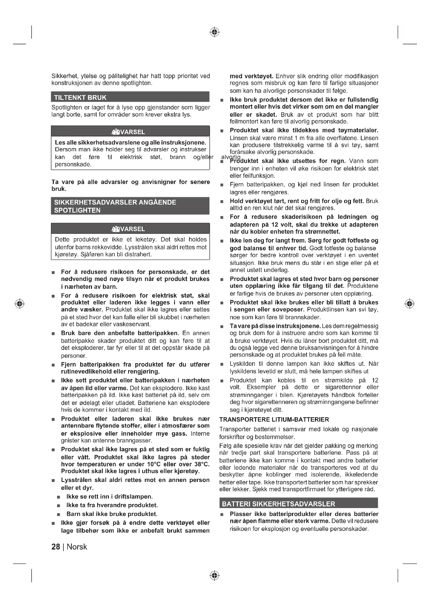 SPOTLIGHTEN ADVARSEL Dette produktet er ikke et leketøy. Det skal holdes utenfor barns rekkevidde. Lysstrålen skal aldri rettes mot kjøretøy. Sjåføren kan bli distrahert. Ŷ For å redusere risikoen for personskade, er det nødvendig med nøye tilsyn når et produkt brukes i nærheten av barn. Ŷ For å redusere risikoen for elektrisk støt, skal produktet eller laderen ikke legges i vann eller andre væsker. Produktet skal ikke lagres eller settes på et sted hvor det kan falle eller bli skubbet i nærheten av et badekar eller vaskeservant. Ŷ Bruk bare den anbefalte batteripakken. En annen batteripakke skader produktet ditt og kan føre til at det eksploderer, tar fyr eller til at det oppstår skade på personer. Ŷ Fjern batteripakken fra produktet før du utfører rutinevedlikehold eller rengjøring. Ŷ Ikke sett produktet eller batteripakken i nærheten av åpen ild eller varme. Det kan eksplodere. Ikke kast batteripakken på ild. Ikke kast batteriet på ild, selv om det er ødelagt eller utladet. Batteriene kan eksplodere hvis de kommer i kontakt med ild. Ŷ Produktet eller laderen skal ikke brukes nær antennbare flytende stoffer, eller i atmosfærer som er eksplosive eller inneholder mye gass. Interne gnister kan antenne branngasser. Ŷ Produktet skal ikke lagres på et sted som er fuktig eller vått. Produktet skal ikke lagres på steder hvor temperaturen er under 10°C eller over 38°C. Produktet skal ikke lagres i uthus eller kjøretøy. Ŷ Lysstrålen skal aldri rettes mot en annen person eller et dyr. Ŷ Ikke se rett inn i driftslampen. Ŷ Ikke ta fra hverandre produktet. Ŷ Barn skal ikke bruke produktet. Ŷ Ikke gjør forsøk på å endre dette verktøyet eller lage tilbehør som ikke er anbefalt brukt sammen med verktøyet. Enhver slik endring eller modifikasjon regnes som misbruk og kan føre til farlige situasjoner som kan ha alvorlige personskader til følge. Ŷ Ikke bruk produktet dersom det ikke er fullstendig montert eller hvis det virker som om en del mangler eller er skadet. Bruk av et produkt som har blitt feilmontert kan føre til alvorlig personskade. Ŷ Produktet skal ikke tildekkes med tøymaterialer. Linsen skal være minst 1 m fra alle overflatene. Linsen kan produsere tilstrekkelig varme til å svi tøy, samt forårsake alvorlig personskade. Ŷ Produktet skal ikke utsettes for regn. Vann som trenger inn i enheten vil øke risikoen for elektrisk støt eller feilfunksjon. Ŷ Fjern batteripakken, og kjøl ned linsen før produktet lagres eller rengjøres. Ŷ Hold verktøyet tørt, rent og fritt for olje og fett. Bruk alltid en ren klut når det skal rengjøres. Ŷ For å redusere skaderisikoen på ledningen og adapteren på 12 volt, skal du trekke ut adapteren når du kobler enheten fra strømnettet. Ŷ Ikke len deg for langt frem. Sørg for godt fotfeste og god balanse til enhver tid.*RGWIRWIHVWHRJEDODQVH sørger for bedre kontroll over verktøyet i en uventet situasjon. Ikke bruk mens du står i en stige eller på et annet ustøtt underlag. Ŷ Produktet skal lagres et sted hvor barn og personer uten opplæring ikke får tilgang til det. Produktene er farlige hvis de brukes av personer uten opplæring. Ŷ Produktet skal ikke brukes eller bli tillatt å brukes i sengen eller soveposer. Produktlinsen kan svi tøy, noe som kan føre til brannskader. Ŷ Ta vare på disse instruksjonene. Les dem regelmessig og bruk dem for å instruere andre som kan komme til å bruke verktøyet. Hvis du låner bort produktet ditt, må du også legge ved denne bruksanvisningen for å hindre personskade og at produktet brukes på feil måte. Ŷ Lyskilden til denne lampen kan ikke skiftes ut. Når lyskildens levetid er slutt, må hele lampen skiftes ut Ŷ Produktet kan kobles til en strømkilde på 12 volt. Eksempler på dette er sigarettenner eller strøminnganger i bilen. Kjøretøyets håndbok forteller deg hvor sigarettenneren og strøminngangene befinner seg i kjøretøyet ditt. TRANSPORTERE LITIUM-BATTERIER Transporter batteriet i samsvar med lokale og nasjonale forskrifter og bestemmelser. Følg alle spesielle krav når det gjelder pakking og merking når tredje part skal transportere batteriene. Pass på at batteriene ikke kan komme i kontakt med andre batterier eller ledende materialer når de transporteres ved at du beskytter åpne koblinger med isolerende, ikkeledende hetter eller tape. Ikke transportert batterier som har sprekker HOOHUOHNNHU6MHNNPHGWUDQVSRUW¿UPDHWIRU\WWHUOLJHUHUnG BATTERI SIKKERHETSADVARSLER Ŷ Plasser ikke batteriprodukter eller deres batterier nær åpen flamme eller sterk varme. Dette vil redusere risikoen for eksplosjon og eventuelle personskader.29 Norsk |