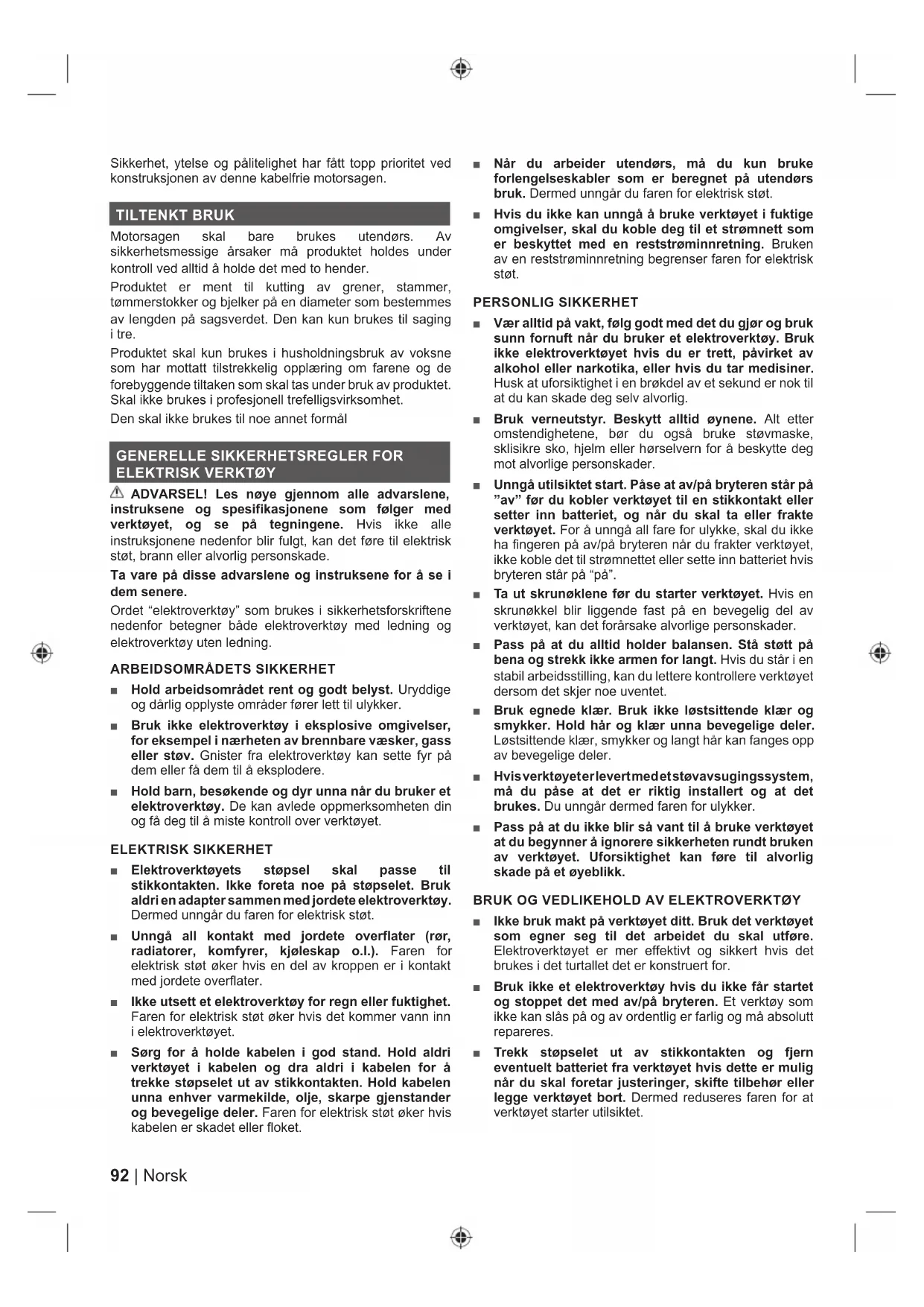TRSikkerhet, ytelse og pålitelighet har fått topp prioritet ved konstruksjonen av denne kabelfrie motorsagen. TILTENKT BRUK Motorsagen skal bare brukes utendørs. Av sikkerhetsmessige årsaker må produktet holdes under kontroll ved alltid å holde det med to hender. Produktet er ment til kutting av grener, stammer, tømmerstokker og bjelker på en diameter som bestemmes av lengden på sagsverdet. Den kan kun brukes til saging i tre. Produktet skal kun brukes i husholdningsbruk av voksne som har mottatt tilstrekkelig opplæring om farene og de forebyggende tiltaken som skal tas under bruk av produktet. Skal ikke brukes i profesjonell trefelligsvirksomhet. Den skal ikke brukes til noe annet formål