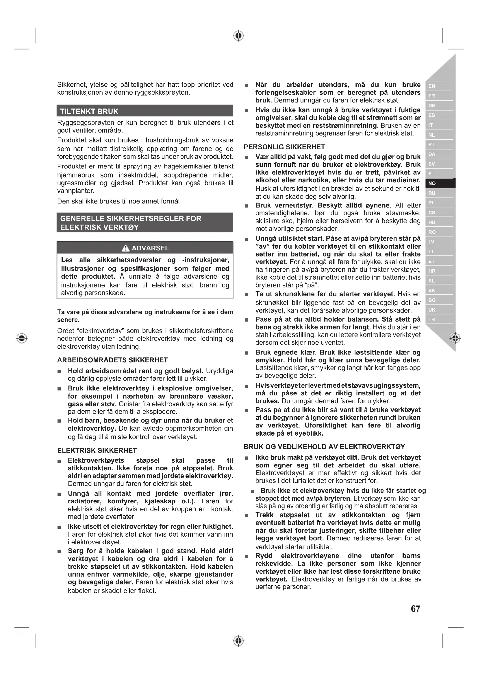 ■ Lad verktøyets batteri kun opp med det ladeapparatet som anbefales av fabrikanten. Et ladeapparat som egner seg til en viss batteritype kan forårsake brann hvis det brukes med en annen batteritype. ■ Det skal bare brukes en bestemt batteritype med et oppladbart verktøy. Bruken av et annet batteri kan forårsake brann. ■ Når batteriet ikke er i bruk, skal det holdes unna metallgjenstander som binders, mynter, nøkler, skruer, spikre og andre små gjenstander som kan koble kontaktene til hverandre. Kortslutning av batteriets kontakter kan medføre brannsår eller brann. ■ Unngå all kontakt med batterivæsken dersom batteriet lekker på grunn av misbruk. Hvis det skulle hende, må det berørte området skylles rikelig med rent vann. Hvis du har fått væske i øynene, må du dessuten oppsøke en lege. Væske som kommer ut av batteriet kan forårsake sår eller brannsår. ■ Ikke bruk et batteri eller et verktøy som er skadet eller endret. Batterier som er skadet eller modifisert, kan forårsake uforutsigbare hendelser og forårsake brann, eksplosjoner eller fare for personskade. ■ Ikke utsett batteriet eller verktøyet for ild eller høy temperatur. Hvis de utsettes for ild eller temperaturer over 130°C, kan dette føre til eksplosjon. ■ Følg alle oppladingsinstruksjoner. Ikke lad batteriet eller verktøyet når temperaturen er utenfor det området som er angitt i bruksanvisningen. Mangelfull lading og lading ved temperaturer utenfor det angitte området kan ødelegge batteriet og øke risikoen for brann. VEDLIKEHOLD ■ Reparasjoner må kun foretas av en kvalifisert tekniker og med originale reservedeler. Da kan du bruke elektroverktøyet trygt. ■ Ikke foreta vedlikehold på et batteri som er skadd. Vedlikehold på batterier skal bare utføres av produsenten eller en autorisert serviceleverandør. SIKKERHETSADVARSLER FOR RYGGSEKKSPRØYTE ■ Les instruksjonsmanualen nøye. Gjør deg kjent med alle kontrollene og korrekt bruk av produktet. ■ Kontroller alltid for og reparer lekkasjer før bruk av produktet. ■ Sjekk nøye både på innsiden og utsiden av produktet og enkeltkomponentene før hver bruk. Kontroller for sprekker og elde på slangene, lekkasjer, tilstoppede dyser og ødelagte eller manglende deler. Ved skade må du få produktet reparert før bruk. Mange ulykker er forårsaket av produkter som er dårlig vedlikeholdt. ■ Ikke bruk utstyret uten verneinnretninger eller skjermer, eller uten at sikkerhetsinnretninger er på plass. Skal aldri brukes i et ufullstendig eller modifisert produkt. Bruken av et defekt, ufullstendig eller modifisert produkt kan føre til en farlig situasjon. ■ Følg kjemikalieprodusentens anvisninger med hensyn til verneutstyret. ■ Bruk følgende personlige verneutstyr ved drift av produktet for å hjelpe til med å redusere risikoen for skade: ● Ansiktsmaske ● Hansker ● Vernefottøy ● Beskyttelse av overkroppen ■ Bruk egnede verneklær og -utstyr ved: ● fylling av sprøytetanken med sprøytematerialer ● sprøyting ● gjennomføring av justeringer ● tømming og rengjøring av sprøytetanken ● utskiftning av sprøytematerialer ● utføring av service på produktet ■ For å redusere risikoen for brann eller eksplosjon, ikke sprøyt med antennelige væsker, slik som bensin. ■ Ikke spray der gnister, flammer, eller annen tennkilde er tilstede. ■ Produktet skal kun brukes med plantevernsprodukter som er godkjent av lokale/nasjonale lovmyndigheter for plantevernprodukter til bruk med ryggsekksprøyter. Følg alltid produsentens instruksjoner som står på produktets merkelapp når det gjelder bruk, rengjøring og lagring. Kjemikalier skal oppbevares utilgjengelig for barn. ■ Ikke spray et middel der du ikke kjenner farene knyttet til det. ■ Slå umiddelbart av og fjern batteripakken i tilfelle en ulykke eller svikt. Ikke bruk redskapen igjen før den er nøye kontrollert av et autorisert servicesenter. ■ Ikke spray i retning av mennesker eller dyr. Unngå sprøyting på vindfulle dager. Spraymidler kan utilsiktet blåses på planter eller objekter som ikke bør sprøytes. Spray alltid med vinden. ■ For å redusere risikoen for ulykker og skade på sprøytemaskinen skal sprøytemaskinen aldri brukes med: ● antennelige væsker ● viskøse eller klebende væsker 68 | Norsk● kaustiske eller korrosive kjemikalier ● væsker som er varmere enn 50 °C ■ Ikke bruk brennbare løsemidler eller slipende rengjøringsmidler for å rengjøre produktet. ■ Hvis det ikke er noen spray som kommer ut fra dysen eller sprøytemengden er redusert, kan det hende at slange- og stavsystemet er blokkert. Skyll og rengjør alle deler av slange- og stavsystemet (sprøytepistol, filter på tanken, sprøytestav, slange) med rent vann. ■ Etter lang tids lagring eller etter vinteren, sprøyt produktet med rent vann. Kontroller om det finnes lekkasjer eller sprekker. ■ Blås aldri gjennom dyser eller andre komponenter med munnen. ■ Unngå kontakt med plantekontrollkjemikalier, skift umiddelbart klær som er kontaminert med plantekontrollkjemikalier. ADVARSEL Hold spraymidler unna øynene. Hvis spraymiddelet kommer i kontakt med øynene, må du skylle umiddelbart med rent vann. Hvis irritasjon fortsatt er tilstede, må du straks oppsøke en lege. SPESIELLE SIKKERHETSADVARSLER ■ Du må aldri la barn, personer med redusert fysisk, sensorisk eller mental kapasitet eller mangel på erfaring og kunnskap eller personer som ikke kjenner disse instruksene, bruke produktet. ■ Hold alle tilskuere, barn og kjæledyr unna området under sprøyting. ■ Vær oppmerksom på eventuelle farer som spraymaterialet kan utgjøre. Før du bruker et hvilken som helst plantevernmiddel eller andre spraymidler med produktet, les nøye etiketten på den opprinnelige beholderen og følg instruksjonene. ■ Kontroller at spraystangen er festet godt til sprayhåndtaket før du bruker produktet. Hvis nødvendig, bruk en tang for å feste s