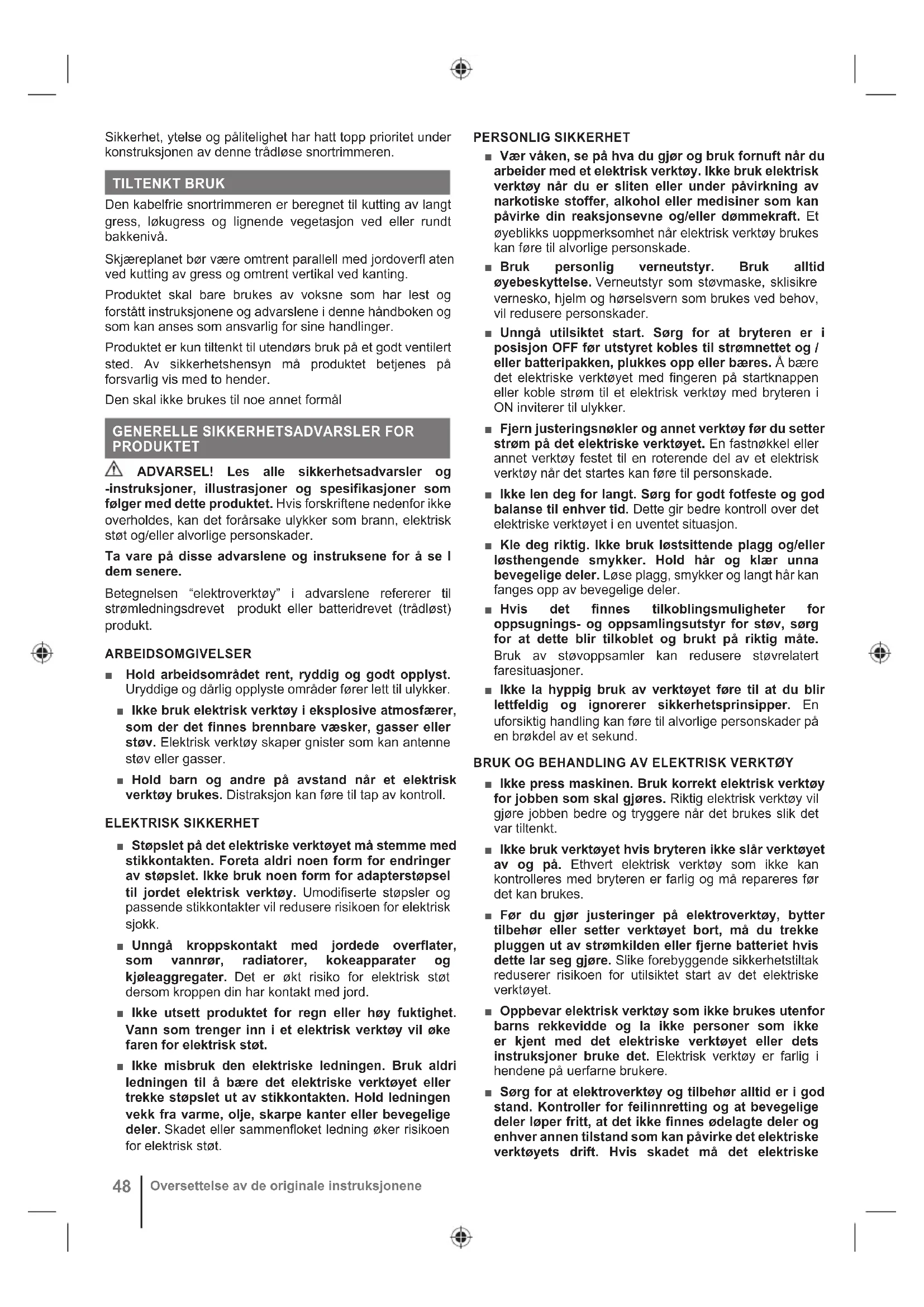 Huom Varoitus Osat ja lisävarusteet on hankittava erikseen48 Oversettelse av de originale instruksjonene Sikkerhet, ytelse og pålitelighet har hatt topp prioritet under konstruksjonen av denne trådløse snortrimmeren. TILTENKT BRUK Den kabelfrie snortrimmeren er beregnet til kutting av langt gress, løkugress og lignende vegetasjon ved eller rundt bakkenivå. Skjæreplanet bør være omtrent parallell med jordoverfl aten ved kutting av gress og omtrent vertikal ved kanting. Produktet skal bare brukes av voksne som har lest og forstått instruksjonene og advarslene i denne håndboken og som kan anses som ansvarlig for sine handlinger. Produktet er kun tiltenkt til utendørs bruk på et godt ventilert sted. Av sikkerhetshensyn må produktet betjenes på forsvarlig vis med to hender. Den skal ikke brukes til noe annet formål