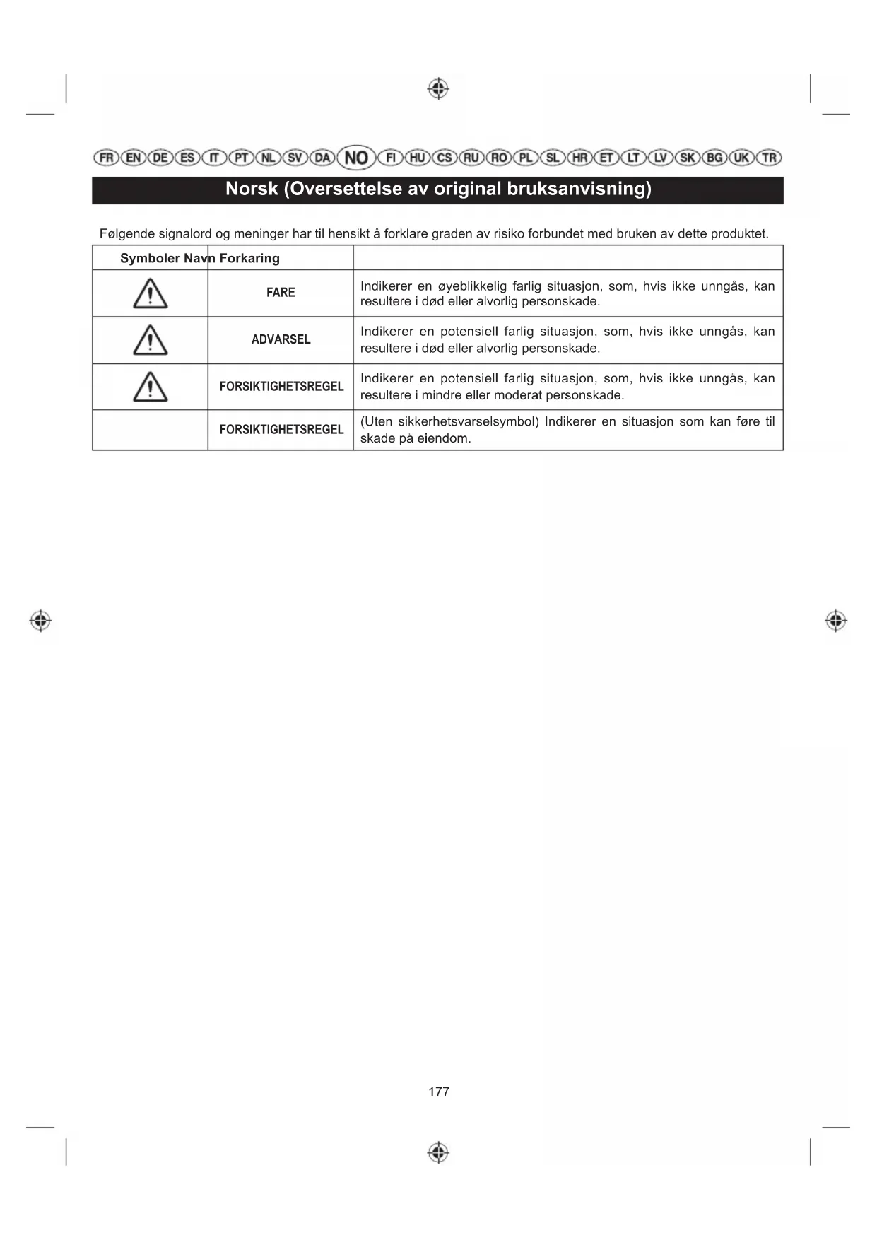 Garantert lydeffektnivå EurAsian Konformitetstegn Trekk Hurtigutløserflik Klem inn avtrekkerlåsen og avtrekkeren for å kjøre. Dra i startwiren inntil motoren går. Slik starter du en kald motor for hånd. Slik starter du en varm motor for hånd. Slik starter du en kald motor med elektrisk starter. Slik starter du en varm motor med elektrisk starter. Ukrainsk merke for konformitet177 Norsk (Oversettelse av original bruksanvisning) Følgende signalord og meninger har til hensikt å forklare graden av risiko forbundet med bruken av dette produktet. Symboler Navn Forkaring FARE Indikerer en øyeblikkelig farlig situasjon, som, hvis ikke unngås, kan resultere i død eller alvorlig personskade. ADVARSEL Indikerer en potensiell farlig situasjon, som, hvis ikke unngås, kan resultere i død eller alvorlig personskade. FORSIKTIGHETSREGEL Indikerer en potensiell farlig situasjon, som, hvis ikke unngås, kan resultere i mindre eller moderat personskade. FORSIKTIGHETSREGEL (Uten sikkerhetsvarselsymbol) Indikerer en situasjon som kan føre til skade på eiendom.178 Norsk (Oversettelse av original bruksanvisning) Sikkerhet, ytelse og pålitelighet har hatt høyeste prioritering under utformingen av ryddesagen/gresstrimmeren. TILTENKT BRUK Ryddesagen/gresstrimmeren skal bare brukes av voksne som har lest og forstått instruksjonene og advarslene i denne håndboken, og som kan holdes ansvarlig for sine handlinger. Produktet er kun tiltenkt til utendørs bruk på et godt ventilert sted. Av sikkerhetshensyn må produktet betjenes på forsvarlig vis med to hender. Produkter som er utstyrt med et gresstrimmerhode (og tilhørende beskyttelse) er beregnet på å klippe gress, mykt ugress og lignende vegetasjon på eller rett over bakkenivå. Når enheten er utstyrt med Tri-Arc™-bladet (og en passende skjerm), kan den også kutte busker. Produktet er ikke laget for å brukes med et sagblad. Kuttefl aten bør være om trent parallell med bakkeoverfl aten. Produktet må ikke brukes til klipping av hekker, busker eller annen vegetasjon der kniven ikke er parallell med bakken. Ikke bruk til noe annet formål. ADVARSEL For å minke faren for personskade, er det viktig at du leser og forstår anvisningene i denne bruksanvisningen. ADVARSEL Ikke bruk produktet før du har lest grundig gjennom og forstått alle instruksjoner og sikkerhetsregler i denne håndboken. Å ikke følge dette kan føre til ulykker som elektrisk støt, brann og/eller alvorlig personskade. Ta vare på brukermanualen og les den ofte for å sikre trygg drift og instruer andre som kan komme til å bruke verktøyet. ADVARSEL Dette produktet er ikke ment å bli brukt av barn eller personer med nedsatte fysiske, mentale eller sensoriske evner. Barn må ha riktig tilsyn for å sikre at de ikke leker med produktet. GENERELLE SIKKERHETSREGLER ■ For trygg bruk, les og forstå alle instruksjoner før du tar i bruk produktet. Følg alle sikkerhetsinstruksjoner. Hvis du ikke følger dem, kan det føre til alvorlige personskader. ■ Noen regioner har bestemmelser som begrenser bruk av dette produktet. Spør de lokale myndigheter for råd. ■ Ikke la barn eller ukyndige bruke dette utstyret. ■ Ikke start eller kjør motoren i rom uten god ventilasjon; innånding av eksosgasser kan drepe. ■ Klargjør arbeidsstedet før hver gangs bruk. Fjern alle gjenstander som steiner, knust glass, spiker, ståltråd eller tråder som kan sprute eller vikle seg inn i trimmerhodet eller bladet. ■ Ha på deg passende vernebriller og hørselvern når du bruker produktet. Hvis du jobber i områder der det er fare for fallende objekter, må du bruke hjelm. ■ Hørselsvern kan hindre operatøren i å høre varsellyder. Vær spesielt oppmerksom på mulige farer rundt deg og innenfor arbeidsområdet. ■ Bruk tette langbukser, sklisikre sko og hansker. Ikke bruk løstsittende klær, kortbukser, smykker av alle slag og ikke gå barbent. ■ Sørg for at langt hår ikke når lenger ned enn skuldrene for å hindre at det kan fanges opp av roterende deler. ■ Hold andre mennesker på minst 15 meters avstand. Stopp produktet når noen kommer inn på området hvor produktet brukes. ■ Ikke bruk utstyret når du er sliten, syk eller under påvirkning av alkohol, narkotika eller medisiner som kan påvirke reaksjonsevne og dømmekraft. ■ Ikke bruk i dårlig lys. Operatøren må ha full sikt for å kunne identifisere potensielle farer. ■ Sørg for godt fotfeste og god balanse til enhver tid. Ikke len deg for langt. Ved å strekke deg kan du risikere å miste balansen eller få kontakt med varme flater. ■ Hold alle deler av kroppen vekke fra bevegelige deler. ■ Ikke berør området rundt lyddemperen eller sylinder på produktet, da disse delene kan være varme etter drift. ■ Stopp alltid motoren før du foretar justeringer. ■ Ikke røyk eller bruk åpen ild mens du blander eller fyller tanken med drivstoff. ■ Bland og oppbevar drivstoff i en beholder som er godkjent for drivstoff. ■ Bland brennstoffet utendørs, på et sted der det ikke finnes gnister eller åpen flamme. Tørk opp alt brennstoffsøl. Flytt 9 m vekk fra påfyllingsstedet for drivstoff før motoren startes. ■ Stopp motoren og la den kjøle seg ned før fylling av drivstoff eller lagring av enheten. ■ La motoren kjøle seg ned; tøm drivstofftanken og179 Norsk (Oversettelse av original bruksanvisning) sørg for at enheten ikke kan flytte på seg før den transporteres i et kjøretøy. ■ Stopp alltid motoren og kontroller at alle bevegelige deler har stoppet før du: ● det utføres servicearbeid ● etterlater produktet uten tilsyn ● rengjøring av produktet ditt ● skifte av tilbehør ● fjerne blokkeringer ● se etter skader dersom verktøyet har truffet en gjenstand ● se etter skader dersom produktet begynner å vibrere kraftig ● gjennomfører vedlikehold ● fjerne bladet ● montere bladet ADVARSEL Bruk aldri trimmetilbehør eller annet tilbehør som ikke er spesifisert av