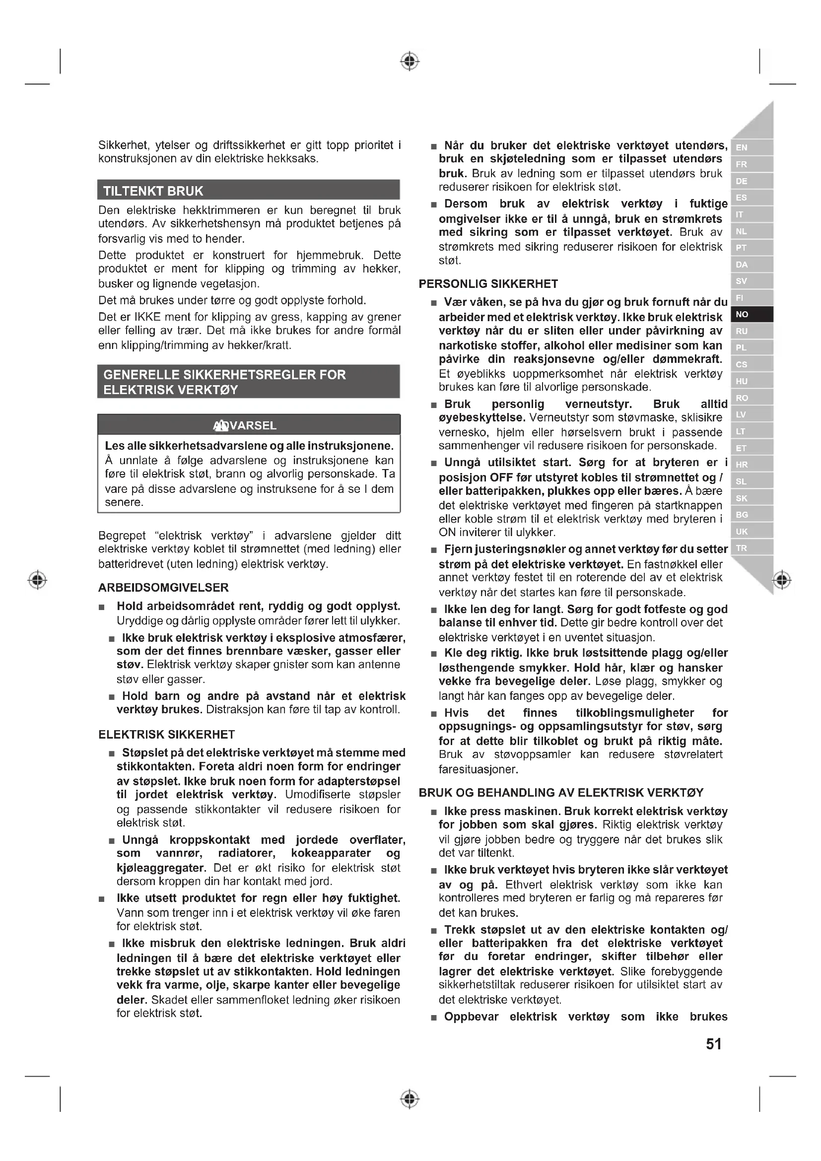 Sikkerhet, ytelser og driftssikkerhet er gitt topp prioritet i konstruksjonen av din elektriske hekksaks. TILTENKT BRUK Den elektriske hekktrimmeren er kun beregnet til bruk utendørs. Av sikkerhetshensyn må produktet betjenes på forsvarlig vis med to hender. Dette produktet er konstruert for hjemmebruk. Dette produktet er ment for klipping og trimming av hekker, busker og lignende vegetasjon. Det må brukes under tørre og godt opplyste forhold. Det er IKKE ment for klipping av gress, kapping av grener eller felling av trær. Det må ikke brukes for andre formål enn klipping/trimming av hekker/kratt.