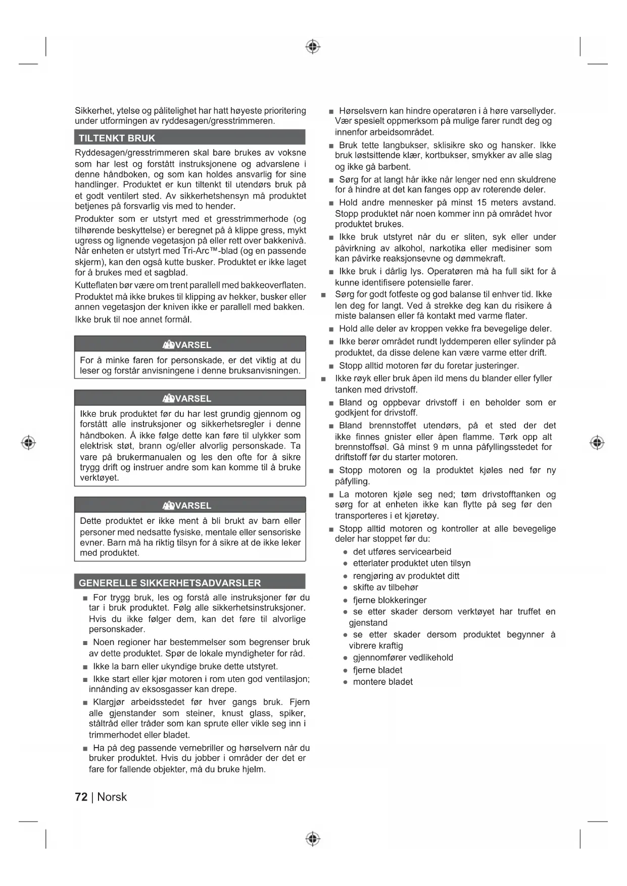Huom Varoitus72 | Norsk Sikkerhet, ytelse og pålitelighet har hatt høyeste prioritering under utformingen av ryddesagen/gresstrimmeren. TILTENKT BRUK Ryddesagen/gresstrimmeren skal bare brukes av voksne som har lest og forstått instruksjonene og advarslene i denne håndboken, og som kan holdes ansvarlig for sine handlinger. Produktet er kun tiltenkt til utendørs bruk på et godt ventilert sted. Av sikkerhetshensyn må produktet betjenes på forsvarlig vis med to hender. Produkter som er utstyrt med et gresstrimmerhode (og tilhørende beskyttelse) er beregnet på å klippe gress, mykt ugress og lignende vegetasjon på eller rett over bakkenivå. Når enheten er utstyrt med Tri-Arc™-blad (og en passende skjerm), kan den også kutte busker. Produktet er ikke laget for å brukes med et sagblad. Kuttefl aten bør være om trent parallell med bakkeoverfl aten. Produktet må ikke brukes til klipping av hekker, busker eller annen vegetasjon der kniven ikke er parallell med bakken. Ikke bruk til noe annet formål. ADVARSEL For å minke faren for personskade, er det viktig at du leser og forstår anvisningene i denne bruksanvisningen. ADVARSEL Ikke bruk produktet før du har lest grundig gjennom og forstått alle instruksjoner og sikkerhetsregler i denne håndboken. Å ikke følge dette kan føre til ulykker som elektrisk støt, brann og/eller alvorlig personskade. Ta vare på brukermanualen og les den ofte for å sikre trygg drift og instruer andre som kan komme til å bruke verktøyet. ADVARSEL Dette produktet er ikke ment å bli brukt av barn eller personer med nedsatte fysiske, mentale eller sensoriske evner. Barn må ha riktig tilsyn for å sikre at de ikke leker med produktet. GENERELLE SIKKERHETSADVARSLER ■ For trygg bruk, les og forstå alle instruksjoner før du tar i bruk produktet. Følg alle sikkerhetsinstruksjoner. Hvis du ikke følger dem, kan det føre til alvorlige personskader. ■ Noen regioner har bestemmelser som begrenser bruk av dette produktet. Spør de lokale myndigheter for råd. ■ Ikke la barn eller ukyndige bruke dette utstyret. ■ Ikke start eller kjør motoren i rom uten god ventilasjon; innånding av eksosgasser kan drepe. ■ Klargjør arbeidsstedet før hver gangs bruk. Fjern alle gjenstander som steiner, knust glass, spiker, ståltråd eller tråder som kan sprute eller vikle seg inn i trimmerhodet eller bladet. ■ Ha på deg passende vernebriller og hørselvern når du bruker produktet. Hvis du jobber i områder der det er fare for fallende objekter, må du bruke hjelm. ■ Hørselsvern kan hindre operatøren i å høre varsellyder. Vær spesielt oppmerksom på mulige farer rundt deg og innenfor arbeidsområdet. ■ Bruk tette langbukser, sklisikre sko og hansker. Ikke bruk løstsittende klær, kortbukser, smykker av alle slag og ikke gå barbent. ■ Sørg for at langt hår ikke når lenger ned enn skuldrene for å hindre at det kan fanges opp av roterende deler. ■ Hold andre mennesker på minst 15 meters avstand. Stopp produktet når noen kommer inn på området hvor produktet brukes. ■ Ikke bruk utstyret når du er sliten, syk eller under påvirkning av alkohol, narkotika eller medisiner som kan påvirke reaksjonsevne og dømmekraft. ■ Ikke bruk i dårlig lys. Operatøren må ha full sikt for å kunne identifisere potensielle farer. ■ Sørg for godt fotfeste og god balanse til enhver tid. Ikke len deg for langt. Ved å strekke deg kan du risikere å miste balansen eller få kontakt med varme flater. ■ Hold alle deler av kroppen vekke fra bevegelige deler. ■ Ikke berør området rundt lyddemperen eller sylinder på produktet, da disse delene kan være varme etter drift. ■ Stopp alltid motoren før du foretar justeringer. ■ Ikke røyk eller bruk åpen ild mens du blander eller fyller tanken med drivstoff. ■ Bland og oppbevar drivstoff i en beholder som er godkjent for drivstoff. ■ Bland brennstoffet utendørs, på et sted der det ikke finnes gnister eller åpen flamme. Tørk opp alt brennstoffsøl. Gå minst 9 m unna påfyllingsstedet for driftstoff før du starter motoren. ■ Stopp motoren og la produktet kjøles ned før ny påfylling. ■ La motoren kjøle seg ned; tøm drivstofftanken og sørg for at enheten ikke kan flytte på seg før den transporteres i et kjøretøy. ■ Stopp alltid motoren og kontroller at alle bevegelige deler har stoppet før du: ● det utføres servicearbeid ● etterlater produktet uten tilsyn ● rengjøring av produktet ditt ● skifte av tilbehør ● fjerne blokkeringer ● se etter skader dersom verktøyet har truffet en gjenstand ● se etter skader dersom produktet begynner å vibrere kraftig ● gjennomfører vedlikehold ● fjerne bladet ● montere bladet73Norsk |