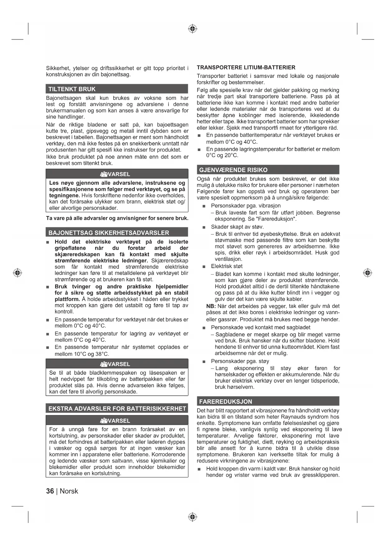 ELSikkerhet, ytelser og driftssikkerhet er gitt topp prioritet i konstruksjonen av din bajonettsag. TILTENKT BRUK Bajonettsagen skal kun brukes av voksne som har lest og forstått anvisningene og advarslene i denne brukermanualen og som kan anses å være ansvarlige for sine handlinger. Når de riktige bladene er satt på, kan bajoettsagen kutte tre, plast, gipsvegg og metall inntil dybden som er beskrevet i tabellen. Bajonettsagen er ment som håndholdt verktøy, den må ikke festes på en snekkerbenk unntatt når produsenten har gitt spesifi kke instrukser for produktet. Ikke bruk produktet på noe annen måte enn det som er beskrevet som tiltenkt bruk. ADVARSEL Les nøye gjennom alle advarslene, instruksene og spesifikasjonene som følger med verktøyet, og se på tegningene. Hvis forskriftene nedenfor ikke overholdes, kan det forårsake ulykker som brann, elektrisk støt og/ eller alvorlige personskader. Ta vare på alle advarsler og anvisnigner for senere bruk. BAJONETTSAG SIKKERHETSADVARSLER ■ Hold det elektriske verktøyet på de isolerte gripeflatene når du foretar arbeid der skjæreredskapen kan få kontakt med skjulte strømførende elektriske ledninger. Skjæreredskap som får kontakt med strømførende elektriske ledninger kan føre til at metalldelene på verktøyet blir strømførende og at brukeren kan få støt. ■ Bruk tvinger og andre praktiske hjelpemidler for å sikre og støtte arbeidsstykket på en stabil plattform. Å holde arbeidsstykket i håden eller trykket mot kroppen kan gjøre det ustabilt og føre til tap av kontroll. ■ En passende temperatur for verktøyet når det brukes er mellom 0°C og 40°C. ■ En passende temperatur for lagring av verktøyet er mellom 0°C og 40°C. ■ En passende temperatur når systemet opplades er mellom 10°C og 38°C. ADVARSEL Se til at både bladklemmespaken og låsespaken er helt nedvippet før tilkobling av batteripakken eller før produktet slås på. Hvis denne advarselen ikke følges, kan det føre til alvorlig personskade.