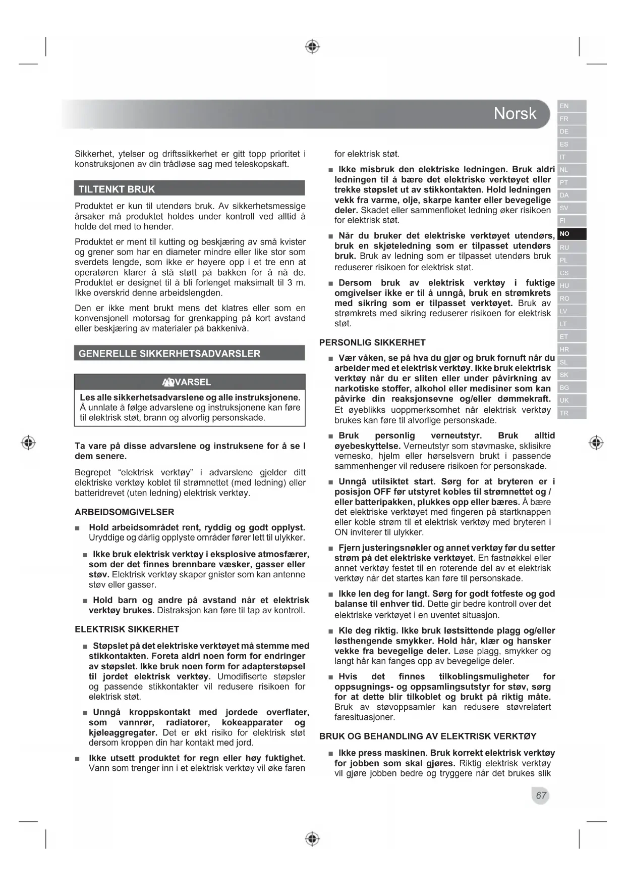 Sikkerhet, ytelser og driftssikkerhet er gitt topp prioritet i konstruksjonen av din trådløse sag med teleskopskaft. TILTENKT BRUK Produktet er kun til utendørs bruk. Av sikkerhetsmessige årsaker må produktet holdes under kontroll ved alltid å holde det med to hender. Produktet er ment til kutting og beskjæring av små kvister og grener som har en diameter mindre eller like stor som sverdets lengde, som ikke er høyere opp i et tre enn at operatøren klarer å stå støtt på bakken for å nå de. Produktet er designet til å bli forlenget maksimalt til 3 m. Ikke overskrid denne arbeidslengden. Den er ikke ment brukt mens det klatres eller som en konvensjonell motorsag for grenkapping på kort avstand eller beskjæring av materialer på bakkenivå. GENERELLE SIKKERHETSADVARSLER ADVARSEL Les alle sikkerhetsadvarslene og alle instruksjonene. Å unnlate å følge advarslene og instruksjonene kan føre til elektrisk støt, brann og alvorlig personskade. Ta vare på disse advarslene og instruksene for å se I dem senere. Begrepet “elektrisk verktøy” i advarslene gjelder ditt elektriske verktøy koblet til strømnettet (med ledning) eller batteridrevet (uten ledning) elektrisk verktøy. ARBEIDSOMGIVELSER ■ Hold arbeidsområdet rent, ryddig og godt opplyst. Uryddige og dårlig opplyste områder fører lett til ulykker. ■ Ikke bruk elektrisk verktøy i eksplosive atmosfærer, som der det finnes brennbare væsker, gasser eller støv. Elektrisk verktøy skaper gnister som kan antenne støv eller gasser. ■ Hold barn og andre på avstand når et elektrisk verktøy brukes. Distraksjon kan føre til tap av kontroll. ELEKTRISK SIKKERHET ■ Støpslet på det elektriske verktøyet må stemme med stikkontakten. Foreta aldri noen form for endringer av støpslet. Ikke bruk noen form for adapterstøpsel til jordet elektrisk verktøy. Umodifiserte støpsler og passende stikkontakter vil redusere risikoen for elektrisk støt. ■ Unngå kroppskontakt med jordede overflater, som vannrør, radiatorer, kokeapparater og kjøleaggregater. Det er økt risiko for elektrisk støt dersom kroppen din har kontakt med jord. ■ Ikke utsett produktet for regn eller høy fuktighet. Vann som trenger inn i et elektrisk verktøy vil øke faren for elektrisk støt. ■ Ikke misbruk den elektriske ledningen. Bruk aldri ledningen til å bære det elektriske verktøyet eller trekke støpslet ut av stikkontakten. Hold ledningen vekk fra varme, olje, skarpe kanter eller bevegelige deler. Skadet eller sammenfloket ledning øker risikoen for elektrisk støt. ■ Når du bruker det elektriske verktøyet utendørs, bruk en skjøteledning som er tilpasset utendørs bruk. Bruk av ledning som er tilpasset utendørs bruk reduserer risikoen for elektrisk støt. ■ Dersom bruk av elektrisk verktøy i fuktige omgivelser ikke er til å unngå, bruk en strømkrets med sikring som er tilpasset verktøyet. Bruk av strømkrets med sikring reduserer risikoen for elektrisk støt. PERSONLIG SIKKERHET ■ Vær våken, se på hva du gjør og bruk fornuft når du arbeider med et elektrisk verktøy. Ikke bruk elektrisk verktøy når du er sliten eller under påvirkning av narkotiske stoffer, alkohol eller medisiner som kan påvirke din reaksjonsevne og/eller dømmekraft. Et øyeblikks uoppmerksomhet når elektrisk verktøy brukes kan føre til alvorlige personskade. ■ Bruk personlig verneutstyr. Bruk alltid øyebeskyttelse. Verneutstyr som støvmaske, sklisikre vernesko, hjelm eller hørselsvern brukt i passende sammenhenger vil redusere risikoen for personskade. ■ Unngå utilsiktet start. Sørg for at bryteren er i posisjon OFF før utstyret kobles til strømnettet og / eller batteripakken, plukkes opp eller bæres. Å bære det elektriske verktøyet med fingeren på startknappen eller koble strøm til et elektrisk verktøy med bryteren i ON inviterer til ulykker. ■ Fjern justeringsnøkler og annet verktøy før du setter strøm på det elektriske verktøyet. En fastnøkkel eller annet verktøy festet til en roterende del av et elektrisk verktøy når det startes kan føre til personskade. ■ Ikke len deg for langt. Sørg for godt fotfeste og god balanse til enhver tid. Dette gir bedre kontroll over det elektriske verktøyet i en uventet situasjon. ■ Kle deg riktig. Ikke bruk løstsittende plagg og/eller løsthengende smykker. Hold hår, klær og hansker vekke fra bevegelige deler. Løse plagg, smykker og langt hår kan fanges opp av bevegelige deler. ■ Hvis det finnes tilkoblingsmuligheter for oppsugnings- og oppsamlingsutstyr for støv, sørg for at dette blir tilkoblet og brukt på riktig måte. Bruk av støvoppsamler kan redusere støvrelatert faresituasjoner. BRUK OG BEHANDLING AV ELEKTRISK VERKTØY ■ Ikke press maskinen. Bruk korrekt elektrisk verktøy for jobben som skal gjøres. Riktig elektrisk verktøy vil gjøre jobben bedre og tryggere når det brukes slikNorsk