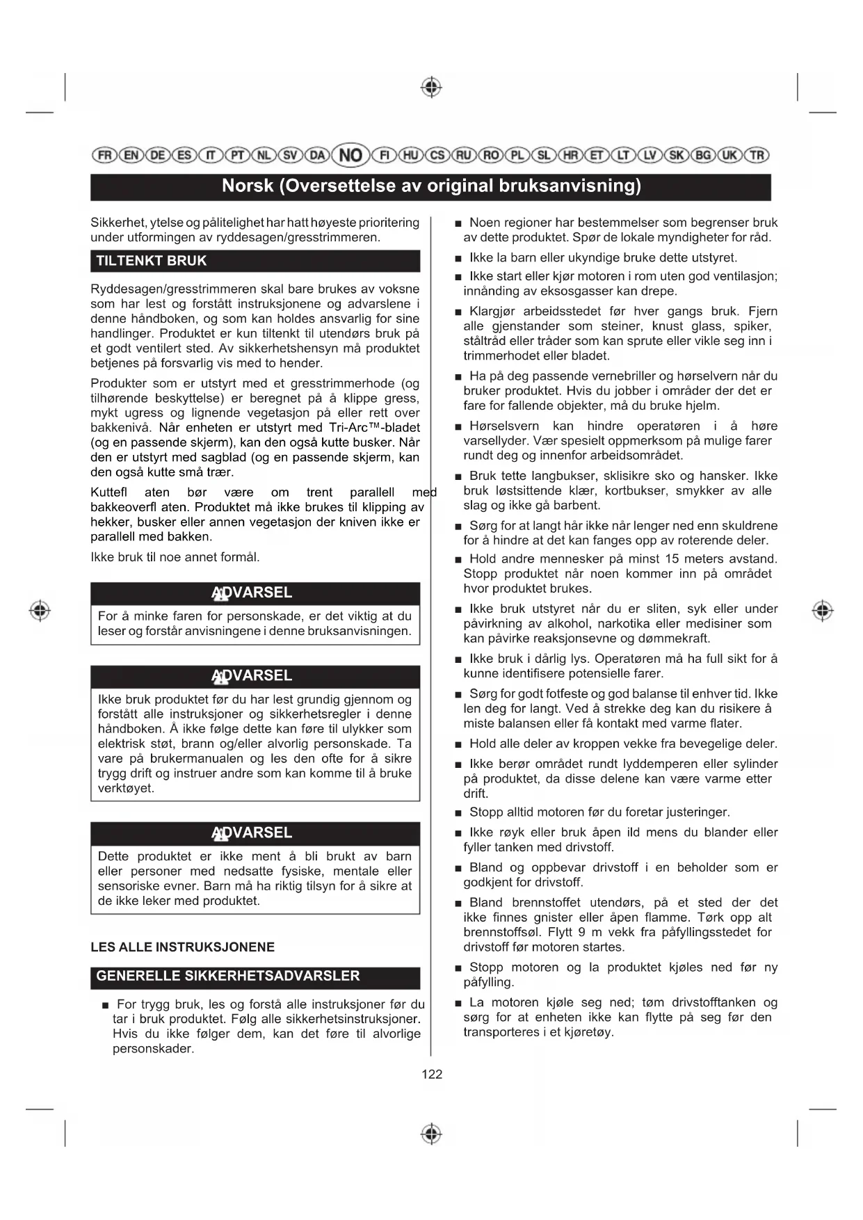 Denne motor bruger tændrør L8RTF/NHSP LD eller L8RTF/BOSCH eller tilsvarende med 0,5 mm elektrodeafstand. Brug en eksakt udskiftningsdel. PAS PÅ Pas på ikke at skrue tændrøret skævt i. Hvis gevindet iskrues skævt, ødelægges motoren alvorligt122 Norsk (Oversettelse av original bruksanvisning) Sikkerhet, ytelse og pålitelighet har hatt høyeste prioritering under utformingen av ryddesagen/gresstrimmeren. TILTENKT BRUK Ryddesagen/gresstrimmeren skal bare brukes av voksne som har lest og forstått instruksjonene og advarslene i denne håndboken, og som kan holdes ansvarlig for sine handlinger. Produktet er kun tiltenkt til utendørs bruk på et godt ventilert sted. Av sikkerhetshensyn må produktet betjenes på forsvarlig vis med to hender. Produkter som er utstyrt med et gresstrimmerhode (og tilhørende beskyttelse) er beregnet på å klippe gress, mykt ugress og lignende vegetasjon på eller rett over bakkenivå. Når enheten er utstyrt med Tri-Arc™-bladet (og en passende skjerm), kan den også kutte busker. Når den er utstyrt med sagblad (og en passende skjerm, kan den også kutte små trær. Kuttefl aten bør være om trent parallell med bakkeoverfl aten. Produktet må ikke brukes til klipping av hekker, busker eller annen vegetasjon der kniven ikke er parallell med bakken. Ikke bruk til noe annet formål. ADVARSEL For å minke faren for personskade, er det viktig at du leser og forstår anvisningene i denne bruksanvisningen. ADVARSEL Ikke bruk produktet før du har lest grundig gjennom og forstått alle instruksjoner og sikkerhetsregler i denne håndboken. Å ikke følge dette kan føre til ulykker som elektrisk støt, brann og/eller alvorlig personskade. Ta vare på brukermanualen og les den ofte for å sikre trygg drift og instruer andre som kan komme til å bruke verktøyet. ADVARSEL Dette produktet er ikke ment å bli brukt av barn eller personer med nedsatte fysiske, mentale eller sensoriske evner. Barn må ha riktig tilsyn for å sikre at de ikke leker med produktet.