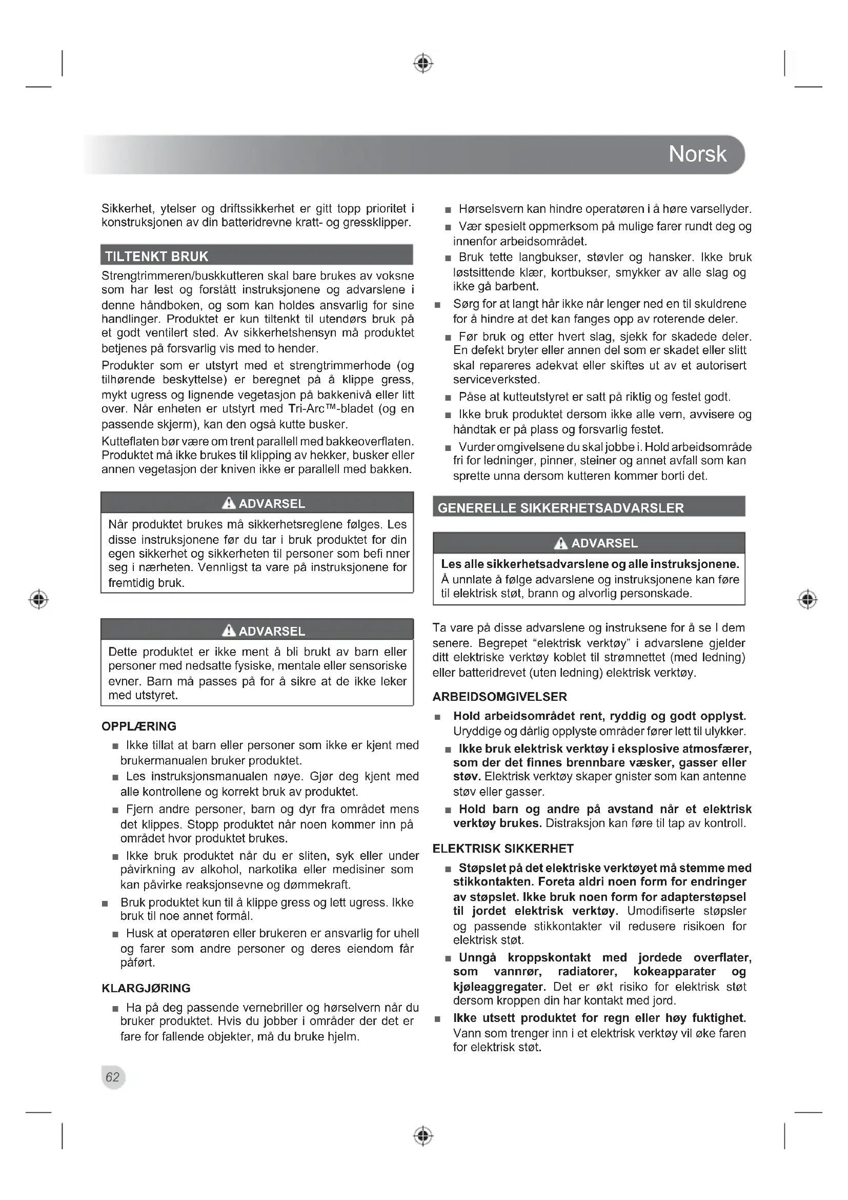 Sikkerhet, ytelser og driftssikkerhet er gitt topp prioritet i konstruksjonen av din batteridrevne kratt- og gressklipper. TILTENKT BRUK Strengtrimmeren/buskkutteren skal bare brukes av voksne som har lest og forstått instruksjonene og advarslene i denne håndboken, og som kan holdes ansvarlig for sine handlinger. Produktet er kun tiltenkt til utendørs bruk på et godt ventilert sted. Av sikkerhetshensyn må produktet betjenes på forsvarlig vis med to hender. Produkter som er utstyrt med et strengtrimmerhode (og tilhørende beskyttelse) er beregnet på å klippe gress, mykt ugress og lignende vegetasjon på bakkenivå eller litt over. Når enheten er utstyrt med Tri-Arc™-bladet (og en passende skjerm), kan den også kutte busker. Kuttefl aten bør være om trent parallell med bakkeoverfl aten. Produktet må ikke brukes til klipping av hekker, busker eller annen vegetasjon der kniven ikke er parallell med bakken. ADVARSEL Når produktet brukes må sikkerhetsreglene følges. Les disse instruksjonene før du tar i bruk produktet for din egen sikkerhet og sikkerheten til personer som befi nner seg i nærheten. Vennligst ta vare på instruksjonene for fremtidig bruk. ADVARSEL Dette produktet er ikke ment å bli brukt av barn eller personer med nedsatte fysiske, mentale eller sensoriske evner. Barn må passes på for å sikre at de ikke leker med utstyret. OPPLÆRING ■ Ikke tillat at barn eller personer som ikke er kjent med brukermanualen bruker produktet. ■ Les instruksjonsmanualen nøye. Gjør deg kjent med alle kontrollene og korrekt bruk av produktet. ■ Fjern andre personer, barn og dyr fra området mens det klippes. Stopp produktet når noen kommer inn på området hvor produktet brukes. ■ Ikke bruk produktet når du er sliten, syk eller under påvirkning av alkohol, narkotika eller medisiner som kan påvirke reaksjonsevne og dømmekraft. ■ Bruk produktet kun til å klippe gress og lett ugress. Ikke bruk til noe annet formål. ■ Husk at operatøren eller brukeren er ansvarlig for uhell og farer som andre personer og deres eiendom får påført. KLARGJØRING ■ Ha på deg passende vernebriller og hørselvern når du bruker produktet. Hvis du jobber i områder der det er fare for fallende objekter, må du bruke hjelm. ■ Hørselsvern kan hindre operatøren i å høre varsellyder. ■ Vær spesielt oppmerksom på mulige farer rundt deg og innenfor arbeidsområdet. ■ Bruk tette langbukser, støvler og hansker. Ikke bruk løstsittende klær, kortbukser, smykker av alle slag og ikke gå barbent. ■ Sørg for at langt hår ikke når lenger ned en til skuldrene for å hindre at det kan fanges opp av roterende deler. ■ Før bruk og etter hvert slag, sjekk for skadede deler. En defekt bryter eller annen del som er skadet eller slitt skal repareres adekvat eller skiftes ut av et autorisert serviceverksted. ■ Påse at kutteutstyret er satt på riktig og festet godt. ■ Ikke bruk produktet dersom ikke alle vern, avvisere og håndtak er på plass og forsvarlig festet. ■ Vurder omgivelsene du skal jobbe i. Hold arbeidsområde fri for ledninger, pinner, steiner og annet avfall som kan sprette unna dersom kutteren kommer borti det. GENERELLE SIKKERHETSADVARSLER ADVARSEL Les alle sikkerhetsadvarslene og alle instruksjonene. Å unnlate å følge advarslene og instruksjonene kan føre til elektrisk støt, brann og alvorlig personskade. Ta vare på disse advarslene og instruksene for å se I dem senere. Begrepet “elektrisk verktøy” i advarslene gjelder ditt elektriske verktøy koblet til strømnettet (med ledning) eller batteridrevet (uten ledning) elektrisk verktøy. ARBEIDSOMGIVELSER ■ Hold arbeidsområdet rent, ryddig og godt opplyst. Uryddige og dårlig opplyste områder fører lett til ulykker. ■ Ikke bruk elektrisk verktøy i eksplosive atmosfærer, som der det finnes brennbare væsker, gasser eller støv. Elektrisk verktøy skaper gnister som kan antenne støv eller gasser. ■ Hold barn og andre på avstand når et elektrisk verktøy brukes. Distraksjon kan føre til tap av kontroll. ELEKTRISK SIKKERHET ■ Støpslet på det elektriske verktøyet må stemme med stikkontakten. Foreta aldri noen form for endringer av støpslet. Ikke bruk noen form for adapterstøpsel til jordet elektrisk verktøy. Umodifiserte støpsler og passende stikkontakter vil redusere risikoen for elektrisk støt. ■ Unngå kroppskontakt med jordede overflater, som vannrør, radiatorer, kokeapparater og kjøleaggregater. Det er økt risiko for elektrisk støt dersom kroppen din har kontakt med jord. ■ Ikke utsett produktet for regn eller høy fuktighet. Vann som trenger inn i et elektrisk verktøy vil øke faren for elektrisk støt.Norsk