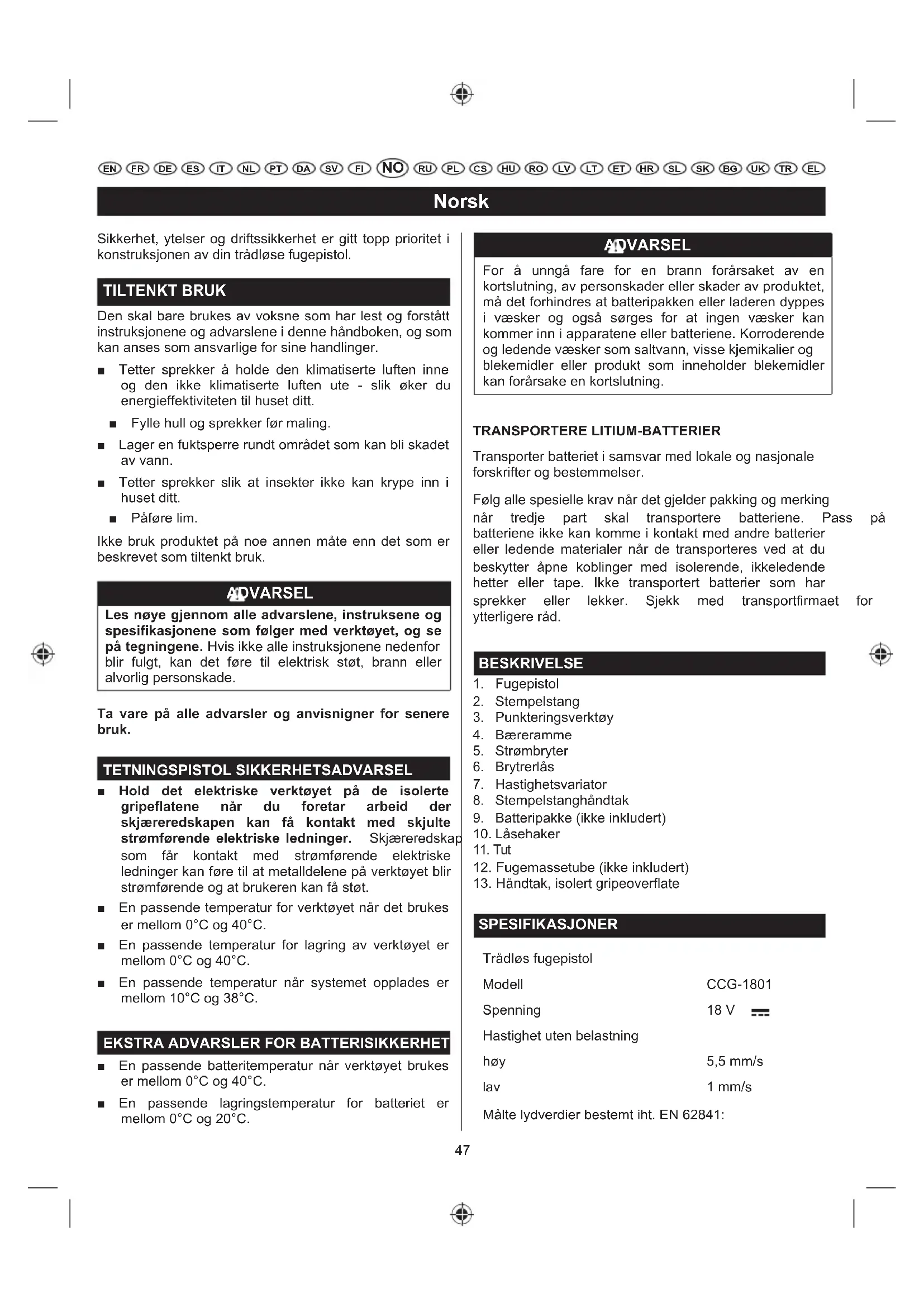 SPESIFIKASJONER Trådløs fugepistol Modell CCG-1801 Spenning 18 V Hastighet uten belastning høy PPV lav PPV Målte lydverdier bestemt iht. EN 62841:48 Norsk