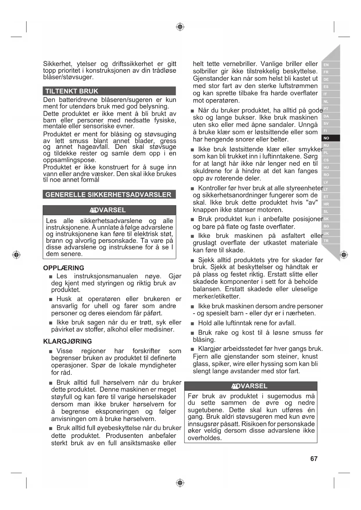 Sikkerhet, ytelser og driftssikkerhet er gitt topp prioritet i konstruksjonen av din trådløse blåser/støvsuger. TILTENKT BRUK Den batteridrevne blåseren/sugeren er kun ment for utendørs bruk med god belysning. Dette produktet er ikke ment å bli brukt av barn eller personer med nedsatte fysiske, mentale eller sensoriske evner. Produktet er ment for blåsing og støvsuging av lett smuss blant annet blader, gress og annet hageavfall. Den skal støvsuge og tildekke rester og samle dem opp i en oppsamlingspose. Produktet er ikke konstruert for å suge inn vann eller andre væsker. Den skal ikke brukes til noe annet formål GENERELLE SIKKERHETSADVARSLER ADVARSEL Les alle sikkerhetsadvarslene og alle instruksjonene. Å unnlate å følge advarslene og instruksjonene kan føre til elektrisk støt, brann og alvorlig personskade. Ta vare på disse advarslene og instruksene for å se I dem senere. OPPLÆRING ■ Les instruksjonsmanualen nøye. Gjør deg kjent med styringen og riktig bruk av produktet. ■ Husk at operatøren eller brukeren er ansvarlig for uhell og farer som andre personer og deres eiendom får påført. ■ Ikke bruk sagen når du er trøtt, syk eller påvirket av stoffer, alkohol eller medisiner. KLARGJØRING ■ Visse regioner har forskrifter som begrenser bruken av produktet til definerte operasjoner. Spør de lokale myndigheter for råd. ■ Bruk alltid full hørselvern når du bruker dette produktet. Denne maskinen er meget støyfull og kan føre til varige hørselskader dersom man ikke bruker hørselvern for å begrense eksponeringen og følger anvisningen om å bruke hørselvern. ■ Bruk alltid full øyebeskyttelse når du bruker dette produktet. Produsenten anbefaler sterkt bruk av en full ansiktsmaske eller helt tette vernebriller. Vanlige briller eller solbriller gir ikke tilstrekkelig beskyttelse. Gjenstander kan når som helst bli kastet ut med stor fart av den sterke luftstrømmen og kan sprette tilbake fra harde overflater mot operatøren. ■ Når du bruker produktet, ha alltid på gode sko og lange bukser. Ikke bruk maskinen uten sko eller med åpne sandaler. Unngå å bruke klær som er løstsittende eller som har hengende snorer eller belter. ■ Ikke bruk løstsittende klær eller smykker som kan bli trukket inn i luftinntakene. Sørg for at langt hår ikke når lenger ned en til skuldrene for å hindre at det kan fanges opp av roterende deler. ■ Kontroller før hver bruk at alle styreenheter og sikkerhetsanordninger fungerer som de skal. Ikke bruk dette produktet hvis "av" knappen ikke stanser motoren. ■ Bruk produktet kun i anbefalte posisjoner og bare på flate og faste overflater. ■ Ikke bruk maskinen på asfaltert eller gruslagt overflate der utkastet materiale kan føre til skade. ■ Sjekk alltid produktets ytre for skader før bruk. Sjekk at beskyttelser og håndtak er på plass og festet riktig. Erstatt slitte eller skadede komponenter i sett for å beholde balansen. Erstatt skadede eller uleselige merker/etiketter. ■ Ikke bruk maskinen dersom andre personer - og spesielt barn - eller dyr er i nærheten. ■ Hold alle luftinntak rene for avfall. ■ Bruk rake og kost til å løsne smuss før blåsing. ■ Klargjør arbeidsstedet før hver gangs bruk. Fjern alle gjenstander som steiner, knust glass, spiker, wire eller hyssing som kan bli slengt lange avstander med stor fart. ADVARSEL Før bruk av produktet i sugemodus må du sette sammen de øvre og nedre sugetubene. Dette skal kun utføres én gang. Bruk aldri støvsugeren med kun øvre innsugsrør påsatt. Risikoen for personskade øker veldig dersom disse advarslene ikke overholdes.68 | Norsk