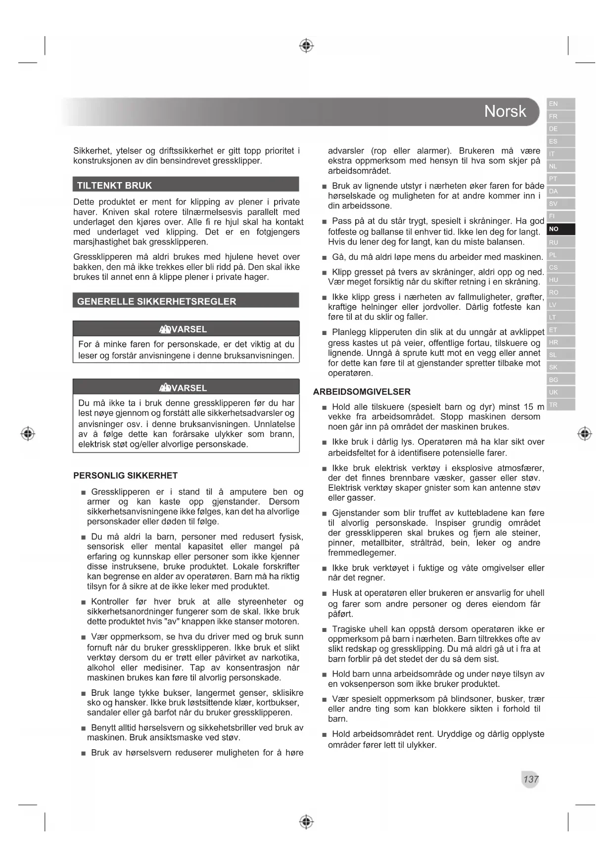 Sikkerhet, ytelser og driftssikkerhet er gitt topp prioritet i konstruksjonen av din bensindrevet gressklipper. TILTENKT BRUK Dette produktet er ment for klipping av plener i private haver. Kniven skal rotere tilnærmelsesvis parallelt med underlaget den kjøres over. Alle fi re hjul skal ha kontakt med underlaget ved klipping. Det er en fotgjengers marsjhastighet bak gressklipperen. Gressklipperen må aldri brukes med hjulene hevet over bakken, den må ikke trekkes eller bli ridd på. Den skal ikke brukes til annet enn å klippe plener i private hager. GENERELLE SIKKERHETSREGLER ADVARSEL For å minke faren for personskade, er det viktig at du leser og forstår anvisningene i denne bruksanvisningen. ADVARSEL Du må ikke ta i bruk denne gressklipperen før du har lest nøye gjennom og forstått alle sikkerhetsadvarsler og anvisninger osv. i denne bruksanvisningen. Unnlatelse av å følge dette kan forårsake ulykker som brann, elektrisk støt og/eller alvorlige personskade. PERSONLIG SIKKERHET ■ Gressklipperen er i stand til å amputere ben og armer og kan kaste opp gjenstander. Dersom sikkerhetsanvisningene ikke følges, kan det ha alvorlige personskader eller døden til følge. ■ Du må aldri la barn, personer med redusert fysisk, sensorisk eller mental kapasitet eller mangel på erfaring og kunnskap eller personer som ikke kjenner disse instruksene, bruke produktet. Lokale forskrifter kan begrense en alder av operatøren. Barn må ha riktig tilsyn for å sikre at de ikke leker med produktet. ■ Kontroller før hver bruk at alle styreenheter og sikkerhetsanordninger fungerer som de skal. Ikke bruk dette produktet hvis "av" knappen ikke stanser motoren. ■ Vær oppmerksom, se hva du driver med og bruk sunn fornuft når du bruker gressklipperen. Ikke bruk et slikt verktøy dersom du er trøtt eller påvirket av narkotika, alkohol eller medisiner. Tap av konsentrasjon når maskinen brukes kan føre til alvorlig personskade. ■ Bruk lange tykke bukser, langermet genser, sklisikre sko og hansker. Ikke bruk løstsittende klær, kortbukser, sandaler eller gå barfot når du bruker gressklipperen. ■ Benytt alltid hørselsvern og sikkehetsbriller ved bruk av maskinen. Bruk ansiktsmaske ved støv. ■ Bruk av hørselsvern reduserer muligheten for å høre advarsler (rop eller alarmer). Brukeren må være ekstra oppmerksom med hensyn til hva som skjer på arbeidsområdet. ■ Bruk av lignende utstyr i nærheten øker faren for både hørselskade og muligheten for at andre kommer inn i din arbeidssone. ■ Pass på at du står trygt, spesielt i skråninger. Ha god fotfeste og ballanse til enhver tid. Ikke len deg for langt. Hvis du lener deg for langt, kan du miste balansen. ■ Gå, du må aldri løpe mens du arbeider med maskinen. ■ Klipp gresset på tvers av skråninger, aldri opp og ned. Vær meget forsiktig når du skifter retning i en skråning. ■ Ikke klipp gress i nærheten av fallmuligheter, grøfter, kraftige helninger eller jordvoller. Dårlig fotfeste kan føre til at du sklir og faller. ■ Planlegg klipperuten din slik at du unngår at avklippet gress kastes ut på veier, offentlige fortau, tilskuere og lignende. Unngå å sprute kutt mot en vegg eller annet for dette kan føre til at gjenstander spretter tilbake mot operatøren. ARBEIDSOMGIVELSER ■ Hold alle tilskuere (spesielt barn og dyr) minst 15 m vekke fra arbeidsområdet. Stopp maskinen dersom noen går inn på området der maskinen brukes. ■ Ikke bruk i dårlig lys. Operatøren må ha klar sikt over arbeidsfeltet for å identifisere potensielle farer. ■ Ikke bruk elektrisk verktøy i eksplosive atmosfærer, der det finnes brennbare væsker, gasser eller støv. Elektrisk verktøy skaper gnister som kan antenne støv eller gasser. ■ Gjenstander som blir truffet av kuttebladene kan føre til alvorlig personskade. Inspiser grundig området der gressklipperen skal brukes og fjern ale steiner, pinner, metallbiter, stråltråd, bein, leker og andre fremmedlegemer. ■ Ikke bruk verktøyet i fuktige og våte omgivelser eller når det regner. ■ Husk at operatøren eller brukeren er ansvarlig for uhell og farer som andre personer og deres eiendom får påført. ■ Tragiske uhell kan oppstå dersom operatøren ikke er oppmerksom på barn i nærheten. Barn tiltrekkes ofte av slikt redskap og gressklipping. Du må aldri gå ut i fra at barn forblir på det stedet der du så dem sist. ■ Hold barn unna arbeidsområde og under nøye tilsyn av en voksenperson som ikke bruker produktet. ■ Vær spesielt oppmerksom på blindsoner, busker, trær eller andre ting som kan blokkere sikten i forhold til barn. ■ Hold arbeidsområdet rent. Uryddige og dårlig opplyste områder fører lett til ulykker.Norsk
