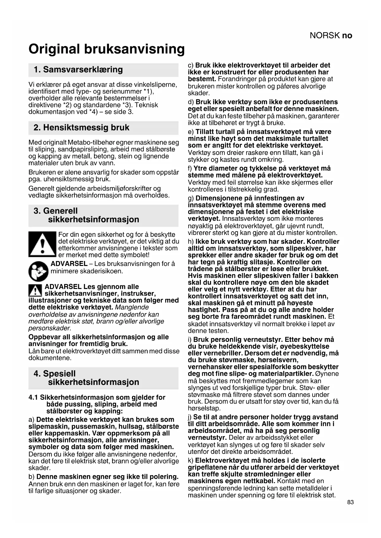 Original bruksanvisning Vi erklærer på eget ansvar at disse vinkelsliperne, identifisert med type- og serienummer *1), overholder alle relevante bestemmelser i direktivene *2) og standardene *3). Teknisk dokumentasjon ved *4) – se side 3. Med originalt Metabo-tilbehør egner maskinene seg til sliping, sandpapirsliping, arbeid med stålbørste og kapping av metall, betong, stein og lignende materialer uten bruk av vann. Brukeren er alene ansvarlig for skader som oppstår pga. uhensiktsmessig bruk. Generelt gjeldende arbeidsmiljøforskrifter og vedlagte sikkerhetsinformasjon må overholdes. For din egen sikkerhet og for å beskytte det elektriske verktøyet, er det viktig at du etterkommer anvisningene i tekster som er merket med dette symbolet! ADVARSEL – Les bruksanvisningen for å minimere skaderisikoen. ADVARSEL Les gjennom alle sikkerhetsanvisninger, instrukser, illustrasjoner og tekniske data som følger med dette elektriske verktøyet. Manglende overholdelse av anvisningene nedenfor kan medføre elektrisk støt, brann og/eller alvorlige personskader. Oppbevar all sikkerhetsinformasjon og alle anvisninger for fremtidig bruk. Lån bare ut elektroverktøyet ditt sammen med disse dokumentene.