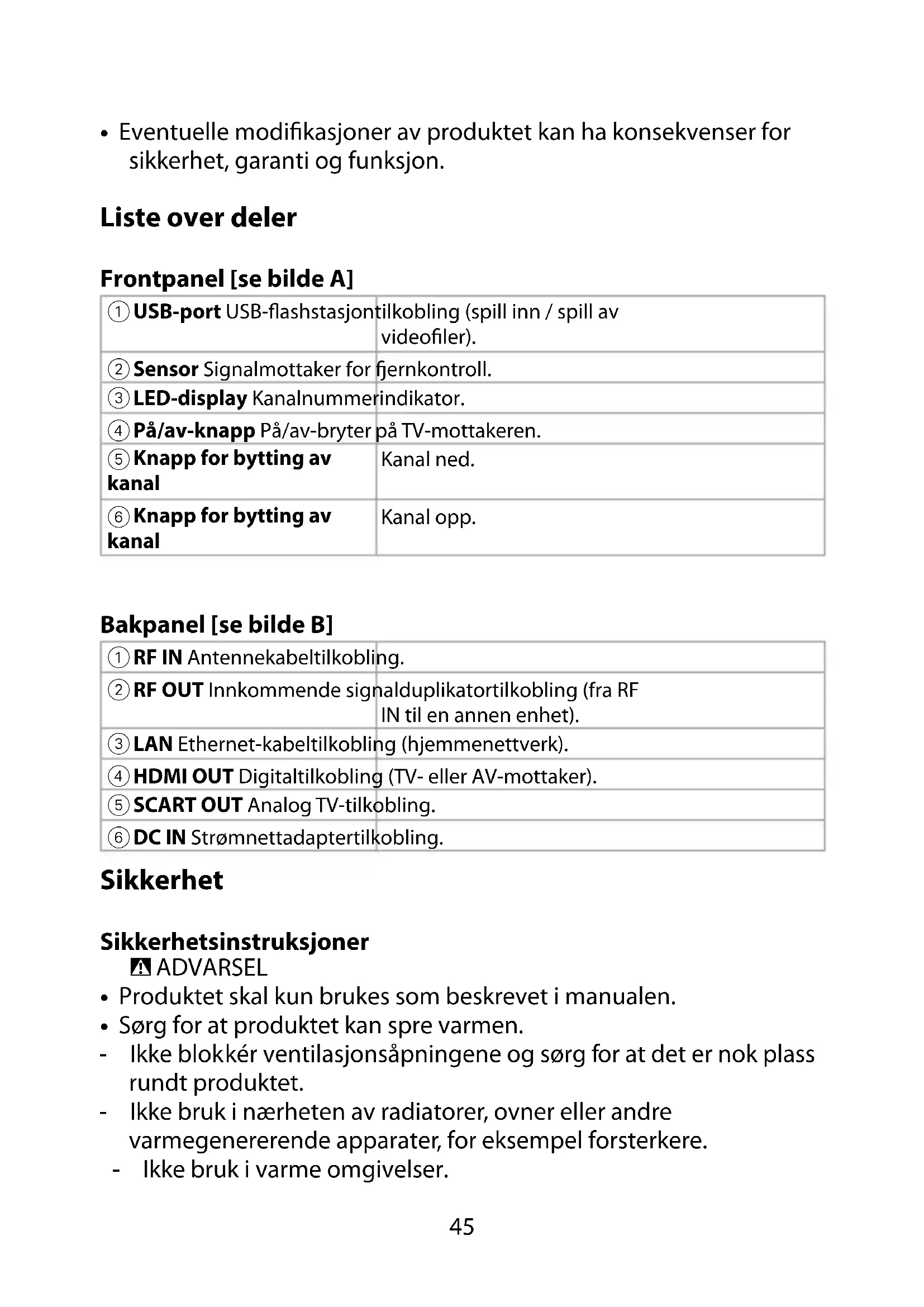 - Eventuelle modikasjoner av produktet kan ha konsekvenser for sikkerhet, garanti og funksjon. Liste over deler Frontpanel [se bilde A]