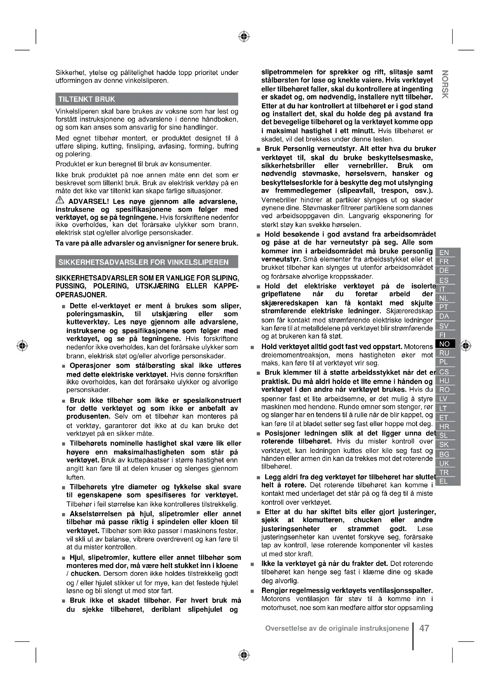 Alkuperäisten ohjeiden suomennosSikkerhet, ytelse og pålitelighet hadde topp prioritet under utformingen av denne vinkelsliperen. TILTENKT BRUK Vinkelsliperen skal bare brukes av voksne som har lest og forstått instruksjonene og advarslene i denne håndboken, og som kan anses som ansvarlig for sine handlinger. Med egnet tilbehør montert, er produktet designet til å utføre sliping, kutting, fi nsliping, avfasing, forming, bufring og polering. Produktet er kun beregnet til bruk av konsumenter. Ikke bruk produktet på noe annen måte enn det som er beskrevet som tiltenkt bruk. Bruk av elektrisk verktøy på en måte det ikke var tiltenkt kan skape farlige situasjoner. ADVARSEL! Les nøye gjennom alle advarslene, instruksene og spesifikasjonene som følger med verktøyet, og se på tegningene. Hvis forskriftene nedenfor ikke overholdes, kan det forårsake ulykker som brann, elektrisk støt og/eller alvorlige personskader. Ta vare på alle advarsler og anvisnigner for senere bruk.