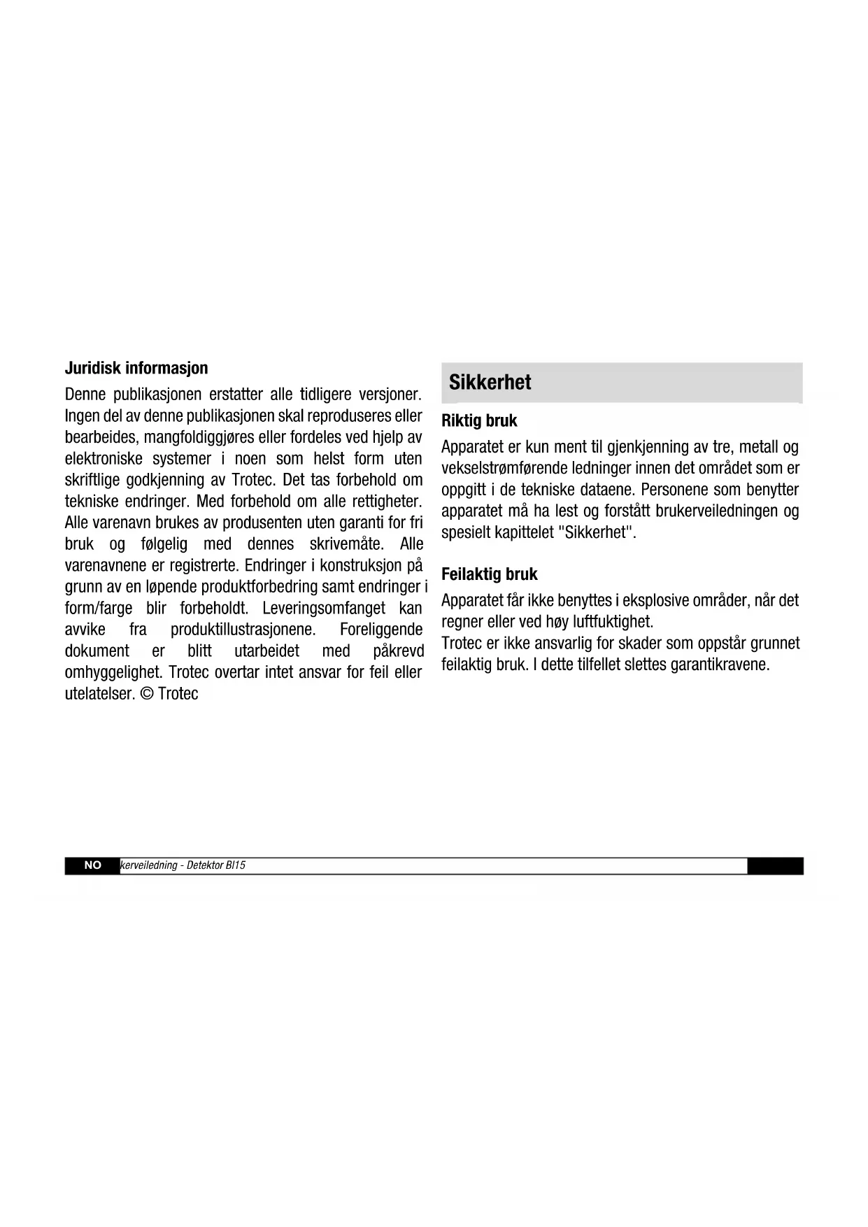 - ha lest og forstått brukerveiledningen, spesielt kapittelet "Sikkerhet".NO Brukerveiledning - Detektor Bl15 L - 4 Tekniske data Modell BI15 Vekt 180 g Mål (H x B x D) 180 x 67 x 38 mm Laserytelse < 1 mW (630–670 nm) Laserklasse ll Lasernøyaktighet 12,7 mm ved 6,1 m Maksimal rekkevidde for laseren inntil 6,1 m Laserens rotasjon 180° i 45°-skritt Driftstemperatur -7 °C (19,4 °F) til +49 °C (120,2 °F) Lagertemperatur -29 °C (-6,56 °F) til +66 °C (66,00 °F) Relativ luftfuktighet 33–55 % Maksimal deteksjonsdybde tre: inntil 19 mm (3/4") Maksimal deteksjonsdybde metall + strømførende kabel: inntil 38 mm (1 1/2") Strømtilførsel 9 V-blokkbatteriL - 5 Brukerveiledning - Detektor Bl15 NO Funksjonsbeskrivelse Med detektoren Bl15 kan man finne kabler, treplanker eller metallbjelker ned til en dybde på 19 mm i vegger eller gulv. Den nøyaktige plasseringen av bjelker og skråstøtter kan beregnes ved hjelp av visningen av kantene i displayet. Laserpekeren som kan svinges 180° viser videre bjelkeforløp. For en nøyaktig justering må to vatere integreres i apparatet. Ved hjelp av reguleringshjulet kan apparatet justeres helt nøyaktig på ujevnt underlag.