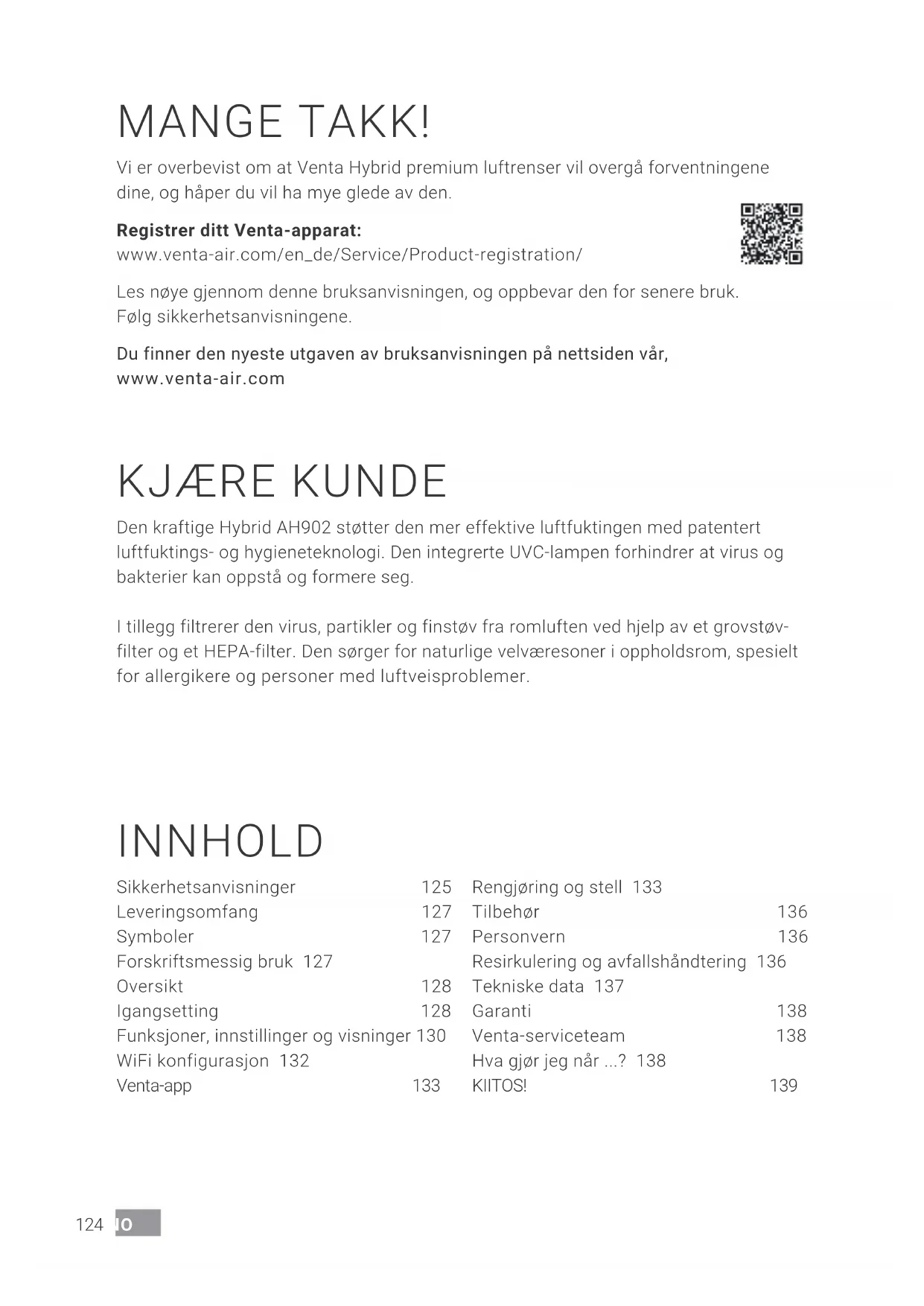 Den kraftige Hybrid AH902 støtter den mer effektive luftfuktingen med patentert luftfuktings- og hygieneteknologi. Den integrerte UVC-lampen forhindrer at virus og bakterier kan oppstå og formere seg. I tillegg filtrerer den virus, partikler og finstøv fra romluften ved hjelp av et grovstøv- filter og et HEPA-filter. Den sørger for naturlige velværesoner i oppholdsrom, spesielt for allergikere og personer med luftveisproblemer. INNHOLD Sikkerhetsanvisninger 125 Leveringsomfang 127 Symboler 127 Forskriftsmessig bruk 127 Oversikt 128 Igangsetting 128 Funksjoner, innstillinger og visninger 130 WiFi konfigurasjon 132 Venta-app 133 Rengjøring og stell 133 Tilbehør 136 Personvern 136 Resirkulering og avfallshåndtering 136 Tekniske data 137 Garanti 138 Venta-serviceteam 138 Hva gjør jeg når ...? 138 KIITOS! 139125NO
