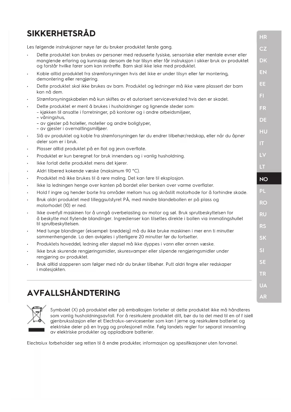 ARSIKKERHETSRÅD AVFALLSHÅNDTERING Symbolet (X) på produktet eller på emballasjen forteller at dette produktet ikke må håndteres som vanlig husholdningsavfall. For å resirkulere produktet ditt, bør du ta det med til en of f isiell gjenbruksstasjon eller et Electrolux-servicesenter som kan f jerne og resirkulere batteriet og elektriske deler på en trygg og profesjonell måte. Følg landets regler for separat innsamling av elektriske produkter og oppladbare batterier. Electrolux forbeholder seg retten til å endre produkter, informasjon og spesif ikasjoner uten forvarsel. Les følgende instruksjoner nøye før du bruker produktet første gang. Dette produktet kan brukes av personer med reduserte fysiske, sensoriske eller mentale evner eller manglende erfaring og kunnskap dersom de har tilsyn eller får instruksjon i sikker bruk av produktet og forstår hvilke farer som kan inntreffe. Barn skal ikke leke med produktet. Koble alltid produktet fra strømforsyningen hvis det ikke er under tilsyn eller før montering, demontering eller rengjøring. Dette produktet skal ikke brukes av barn. Produktet og ledninger må ikke være plassert der barn kan nå dem. Strømforsyningskabelen må kun skiftes av et autorisert serviceverksted hvis den er skadet. Dette produktet er ment å brukes i husholdninger og lignende steder som: – kjøkken til ansatte i forretninger, på kontorer og i andre arbeidsmiljøer, – våningshus, – av gjester på hoteller, moteller og andre boligtyper, – av gjester i overnattingsmilljøer. Slå av produktet og koble fra strømforsyningen før du endrer tilbehør/redskap, eller når du åpner deler som er i bruk. Plasser alltid produktet på en flat og jevn overflate. Produktet er kun beregnet for bruk innendørs og i vanlig husholdning. Ikke forlat dette produktet mens det kjører. Aldri tilbered kokende væske (maksimum 90 °C). Produktet må ikke brukes til å røre maling. Det kan føre til eksplosjon. Ikke la ledningen henge over kanten på bordet eller benken over varme overflater. Hold f ingre og hender borte fra områder mellom hus og skråstilt motorhode for å forhindre skade. Bruk aldri produktet med tilleggsutstyret PÅ, med mindre blandebollen er på plass og motorhodet (10) er ned. Ikke overfyll maskinen for å unngå overbelasting av motor og søl. Bruk sprutbeskyttelsen for å beskytte mot flytende blandinger. Ingredienser kan tilsettes direkte i bollen via innmatingshullet til sprutbeskyttelsen. Med tunge blandinger (eksempel: brøddeig) må du ikke bruke maskinen i mer enn ti minutter sammenhengende. La den avkjøles i ytterligere 20 minutter før du fortsetter. Produktets hoveddel, ledning eller støpsel må ikke dyppes i vann eller annen væske. Ikke bruk skurende rengjøringsmidler, skuresvamper eller slipende rengjøringsmidler under rengjøring av produktet. Bruk alltid stapperen som følger med når du bruker tilbehør. Putt aldri fingre eller redskaper i matesjakten.