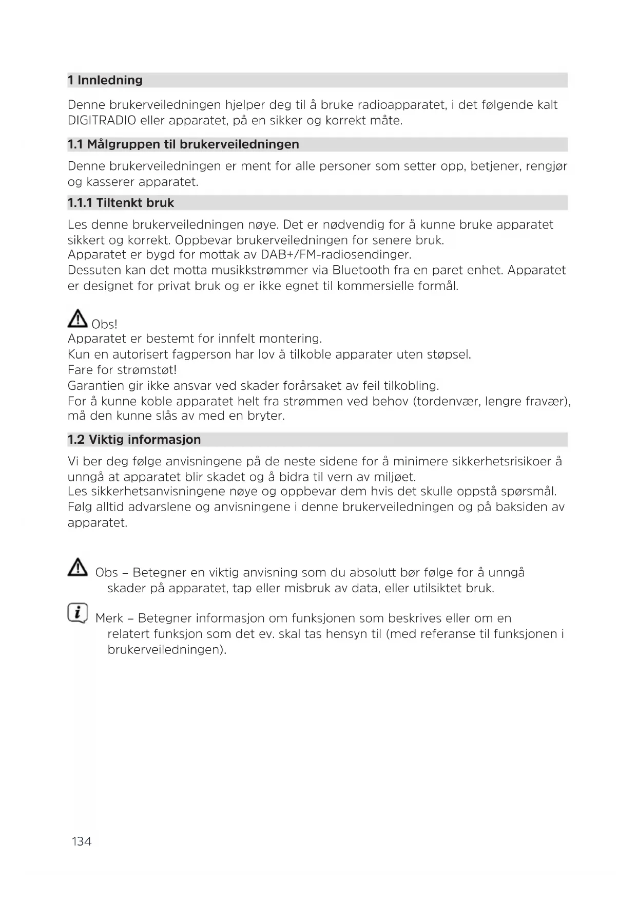 Vi ber deg følge anvisningene på de neste sidene for å minimere sikkerhetsrisikoer å unngå at apparatet blir skadet og å bidra til vern av miljøet. Les sikkerhetsanvisningene nøye og oppbevar dem hvis det skulle oppstå spørsmål. Følg alltid advarslene og anvisningene i denne brukerveiledningen og på baksiden av apparatet. Obs – Betegner en viktig anvisning som du absolu bør følge for å unngå skader på apparatet, tap eller misbruk av data, eller utilsiktet bruk. Merk – Betegner informasjon om funksjonen som beskrives eller om en relatert funksjon som det ev. skal tas hensyn til (med referanse til funksjonen i brukerveiledningen). 1341.2.1 Sikkerhet For din egen sikkerhets skyld, vær nøye med å lese gjennom alle sikkerhetstiltak før du tar i bruk DIGITRADIO UP1. Produsenten tar ikke ansvar for skader som er forårsaket av uforsvarlig bruk og av manglende overholdelse av de sikkerhetsanvisningene. Apparatet er bestemt for innfelt montering. Kun en autorisert fagperson har lov å tilkoble apparater uten støpsel. Fare for strømstøt! Garantien gir ikke ansvar ved skader forårsaket av feil tilkobling. Aldri åpne apparatet! Det er livsfarlig å berøre strømførende deler! Nødvendige inngrep skal kun foretas av kyndig personell. Apparatet skal kun brukes i moderate temperaturer. Ikke utse apparatet for dryppende eller sprutende vann. Hvis det kommer vann inn i apparatet, slå det av og kontakt service. Ikke utse apparatet for varmekilder og oppvarming utover normal dristemperatur. Ved påfallende skader, lukt- eller røykutvikling, større feilfunksjon, eller skader på utsiden, slå av apparatet og kontakt service. Apparatet skal kun kobles til en strømforsyning på 100–240 V~, 50/60 Hz. Aldri prøv å bruke apparatet med en annen spenning. Hvis apparatet er skadet, skal det ikke tas i bruk.