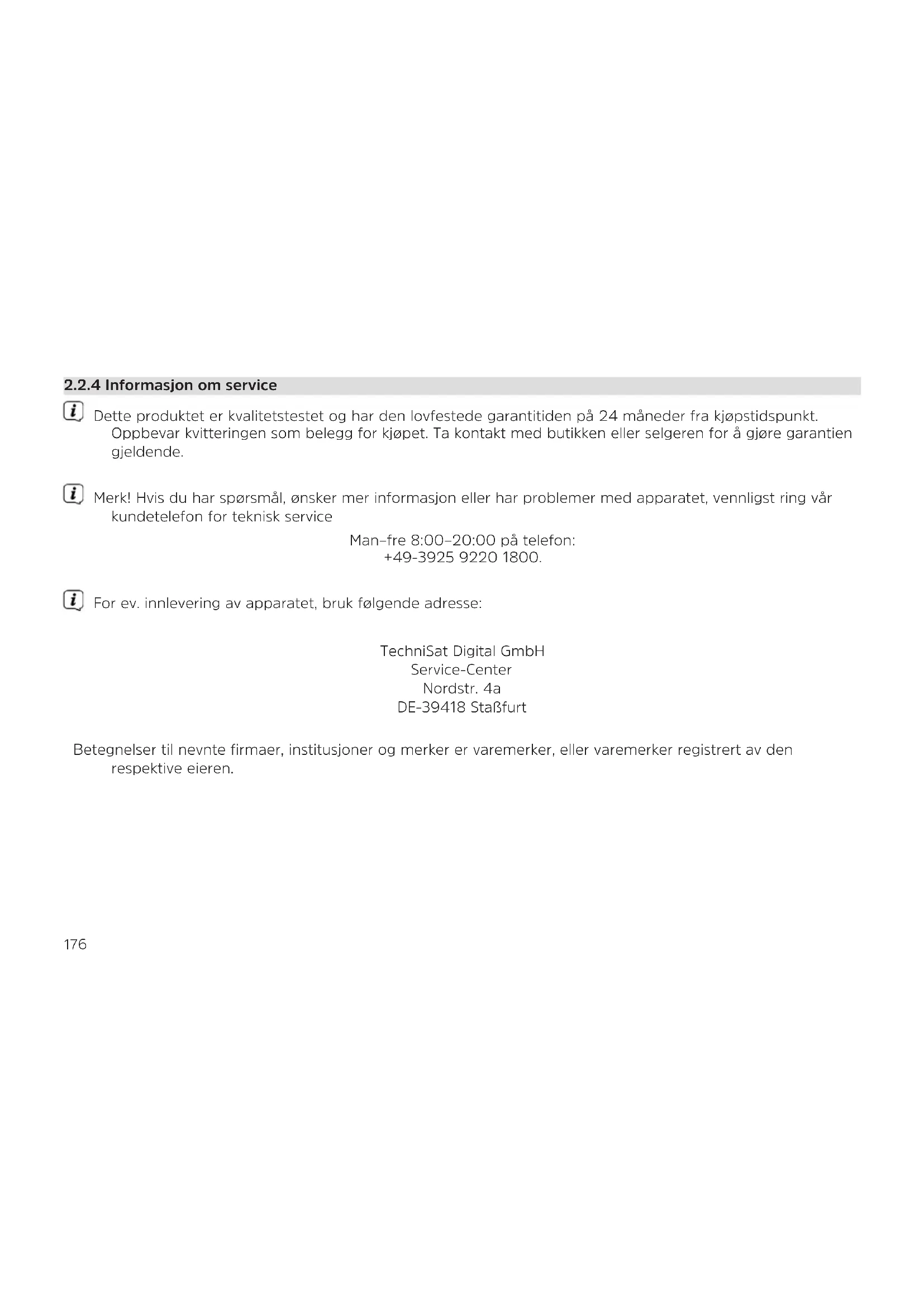 Dette produktet er kvalitetstestet og har den lovfestede garantitiden på 24 måneder fra kjøpstidspunkt. Oppbevar kvitteringen som belegg for kjøpet. Ta kontakt med butikken eller selgeren for å gjøre garantien gjeldende. Merk! Hvis du har spørsmål, ønsker mer informasjon eller har problemer med apparatet, vennligst ring vår kundetelefon for teknisk service Man–fre 8:00–20:00 på telefon: +49-3925 9220 1800. For ev. innlevering av apparatet, bruk følgende adresse: TechniSat Digital GmbH Service-Center Nordstr. 4a DE-39418 Staßfurt Betegnelser til nevnte firmaer, institusjoner og merker er varemerker, eller varemerker registrert av den respektive eieren.177