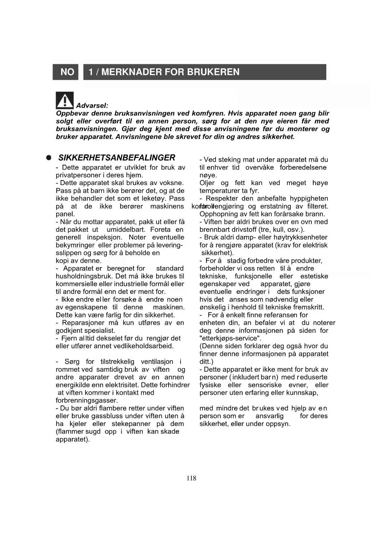 Advarsel: Før du installerer og bruker apparatet, vennligst les nøye denne guiden for installasjon og bruk, for å raskt gjøre deg kjent med apparatet.117 INNHOLDSFORTEGNELSE NO