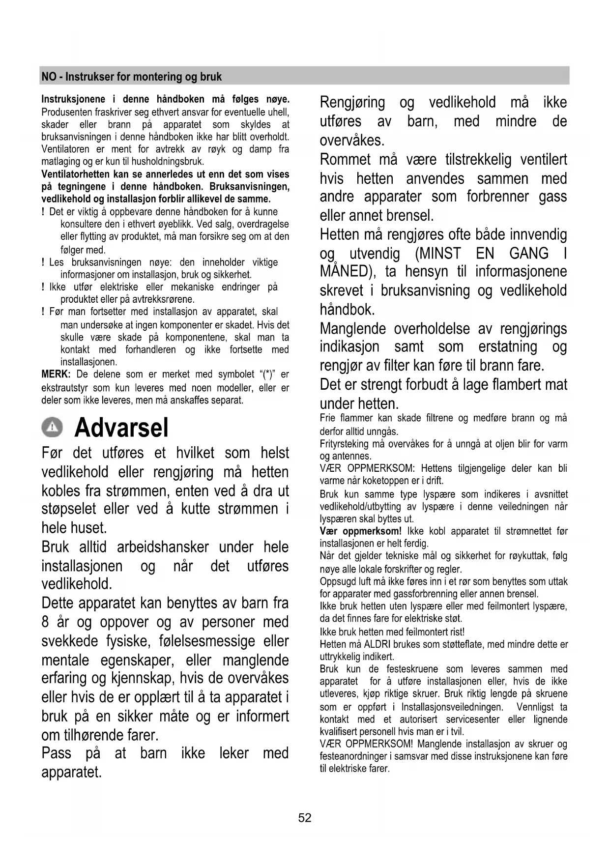 Jos valaistus ei toimi, tarkista että lamput on asennettu oikein paikoilleen ennen kuin otat yhteyttä tekniseen tukeen. - Malli, jossa on LED lamput Tuulettimessa on LED teknologiaan perustuva valaistusjärjestelmä. LED valot takaavat parhaan mahdollisen valaistuksen, lamppujen kesto on 10 kertaa parempi kuin perinteisten lamppujen ja niiden avulla säästetään 90% energiaa. Ota yhteys tekniseen tukeen kun lamput on vaihdettava.52 NO - Instrukser for montering og bruk Instruksjonene i denne håndboken må følges nøye. Produsenten fraskriver seg ethvert ansvar for eventuelle uhell, skader eller brann på apparatet som skyldes at bruksanvisningen i denne håndboken ikke har blitt overholdt. Ventilatoren er ment for avtrekk av røyk og damp fra matlaging og er kun til husholdningsbruk. Ventilatorhetten kan se annerledes ut enn det som vises på tegningene i denne håndboken. Bruksanvisningen, vedlikehold og installasjon forblir allikevel de samme. ! Det er viktig å oppbevare denne håndboken for å kunne konsultere den i ethvert øyeblikk. Ved salg, overdragelse eller flytting av produktet, må man forsikre seg om at den følger med. ! Les bruksanvisningen nøye: den inneholder viktige informasjoner om installasjon, bruk og sikkerhet. ! Ikke utfør elektriske eller mekaniske endringer på produktet eller på avtrekksrørene. ! Før man fortsetter med installasjon av apparatet, skal man undersøke at ingen komponenter er skadet. Hvis det skulle være skade på komponentene, skal man ta kontakt med forhandleren og ikke fortsette med installasjonen. MERK: De delene som er merket med symbolet “(*)” er ekstrautstyr som kun leveres med noen modeller, eller er deler som ikke leveres, men må anskaffes separat. Advarsel Før det utføres et hvilket som helst vedlikehold eller rengjøring må hetten kobles fra strømmen, enten ved å dra ut støpselet eller ved å kutte strømmen i hele huset. Bruk alltid arbeidshansker under hele installasjonen og når det utføres vedlikehold. Dette apparatet kan benyttes av barn fra 8 år og oppover og av personer med svekkede fysiske, følelsesmessige eller mentale egenskaper, eller manglende erfaring og kjennskap, hvis de overvåkes eller hvis de er opplært til å ta apparatet i bruk på en sikker måte og er informert om tilhørende farer. Pass på at barn ikke leker med apparatet. Rengjøring og vedlikehold må ikke utføres av barn, med mindre de overvåkes. Rommet må være tilstrekkelig ventilert hvis hetten anvendes sammen med andre apparater som forbrenner gass eller annet brensel. Hetten må rengjøres ofte både innvendig og utvendig (MINST EN GANG I MÅNED), ta hensyn til informasjonene skrevet i bruksanvisning og vedlikehold håndbok. Manglende overholdelse av rengjørings indikasjon samt som erstatning og rengjør av filter kan føre til brann fare. Det er strengt forbudt å lage flambert mat under hetten. Frie flammer kan skade filtrene og medføre brann og må derfor alltid unngås. Frityrsteking må overvåkes for å unngå at oljen blir for varm og antennes. VÆR OPPMERKSOM: Hettens tilgjengelige deler kan bli varme når koketoppen er i drift. Bruk kun samme type lyspære som indikeres i avsnittet vedlikehold/utbytting av lyspære i denne veiledningen når lyspæren skal byttes ut. Vær oppmerksom! Ikke kobl apparatet til strømnettet før installasjonen er helt ferdig. Når det gjelder tekniske mål og sikkerhet for røykuttak, følg nøye alle lokale forskrifter og regler. Oppsugd luft må ikke føres inn i et rør som benyttes som uttak for apparater med gassforbrenning eller annen brensel. Ikke bruk hetten uten lyspære eller med feilmontert lyspære, da det finnes fare for elektriske støt. Ikke bruk hetten med feilmontert rist! Hetten må ALDRI brukes som støtteflate, med mindre dette er uttrykkelig indikert. Bruk kun de festeskruene som leveres sammen med apparatet for å utføre installasjonen eller, hvis de ikke utleveres, kjøp riktige skruer. Bruk riktig lengde på skruene som er oppført i Installasjonsveiledningen. Vennligst ta kontakt med et autorisert servicesenter eller lignende kvalifisert personell hvis man er i tvil. VÆR OPPMERKSOM! Manglende installasjon av skruer og festeanordninger i samsvar med disse instruksjonene kan føre til elektriske farer.53 Dette apparatet er merket i konformitet med EU-direktivet 2012/19/EC, Waste Electrical and Electronic Equipment (WEEE). Ved å forsikre seg om at dette produktet kasseres forskriftsmessig, bidrar brukeren med å forebygge mulige negative miljø- og helsekonsekvenser. Symbolet på produktet eller på papirer som følger med viser at dette produktet ikke må behandles som vanlig husholdningsavfall, men må leveres til et egnet gjenvinningssenter for elektrisk og elektronisk avfall. Produktet må kasseres i henhold til lokale normer for kassering av avfall. For videre informasjon om behandling, gjenvinning og resirkulering av dette produktet kan du kontakte egnet lokalt kontor, renovasjonskontoret for husholdningsavfall eller butikken hvor du kjøpte produktet. Apparatet er utformet, testet og produsert i henhold til: