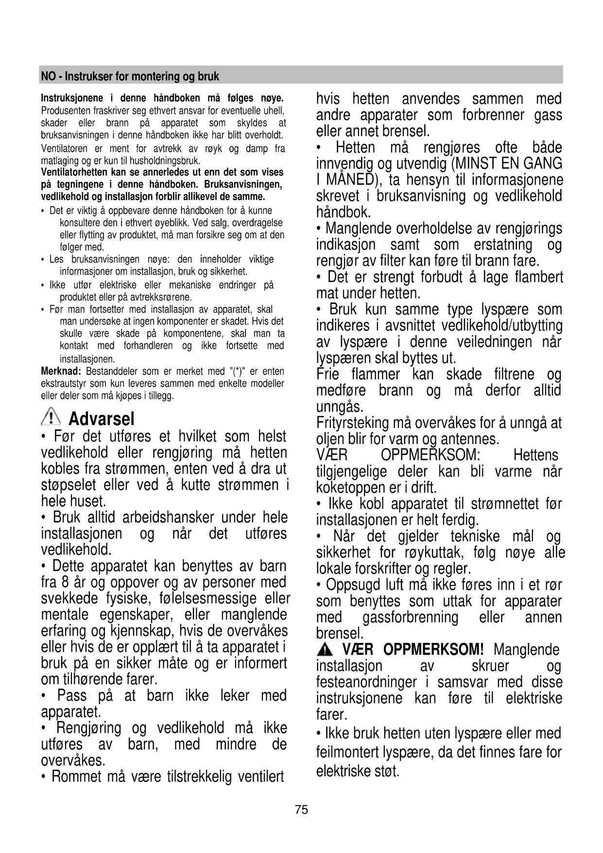 - Ikke bruk hetten uten lyspære eller med feilmontert lyspære, da det finnes fare for elektriske støt.76 Ikke bruk hetten med feilmontert rist! Hetten må ALDRI brukes som støtteflate, med mindre dette er uttrykkelig indikert.