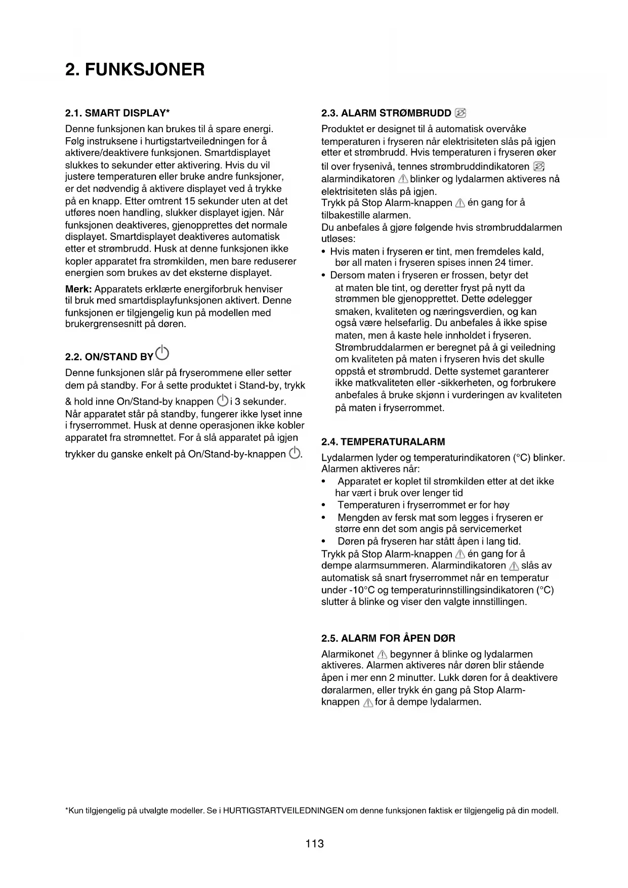 2.1. SMART DISPLAY* Denne funksjonen kan brukes til å spare energi. Følginstrukseneihurtigstartveiledningenforå aktivere/deaktivere funksjonen. Smartdisplayet slukkes to sekunder etter aktivering. Hvis du vil justere temperaturen eller bruke andre funksjoner, erdetnødvendigåaktiveredisplayetvedåtrykke påenknapp.Etteromtrent15sekunderutenatdet utføresnoenhandling,slukkerdisplayetigjen.Når funksjonen deaktiveres, gjenopprettes det normale displayet. Smartdisplayet deaktiveres automatisk etteretstrømbrudd.Huskatdennefunksjonenikke koplerapparatetfrastrømkilden,menbarereduserer energien som brukes av det eksterne displayet. Merk: Apparatets erklærte energiforbruk henviser til bruk med smartdisplayfunksjonen aktivert. Denne funksjonen er tilgjengelig kun på modellen med brukergrensesnittpådøren.