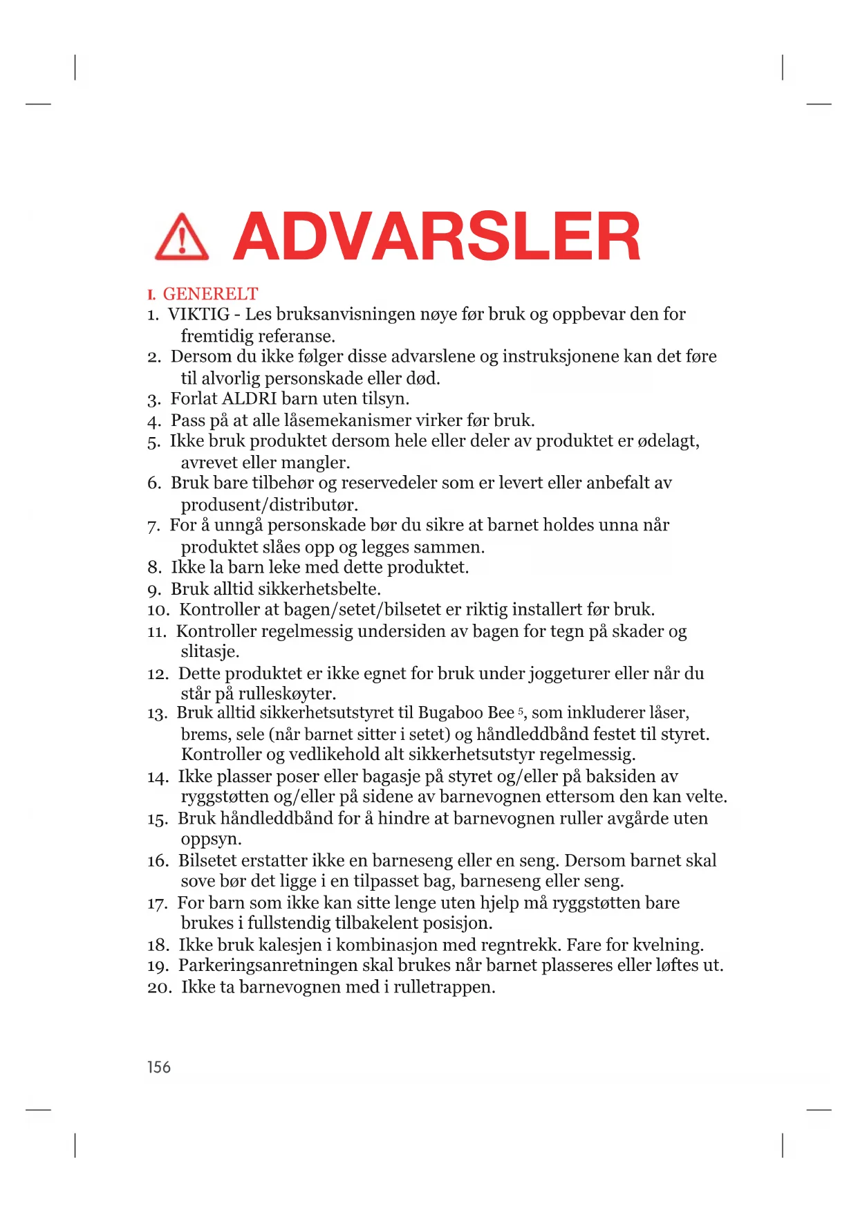 Barn kan kveles: - I mellomrom mellom ekstra puter og siden på bagen. - På mykt underlag. Bruk ALDRI en separat madrass, pute, dyne eller stopping. Bruk KUN puten som leveres av produsenten. Noen instruksjoner krever spesiell oppmerksomhet for å sikre sikker bruk av Bugaboo Bee