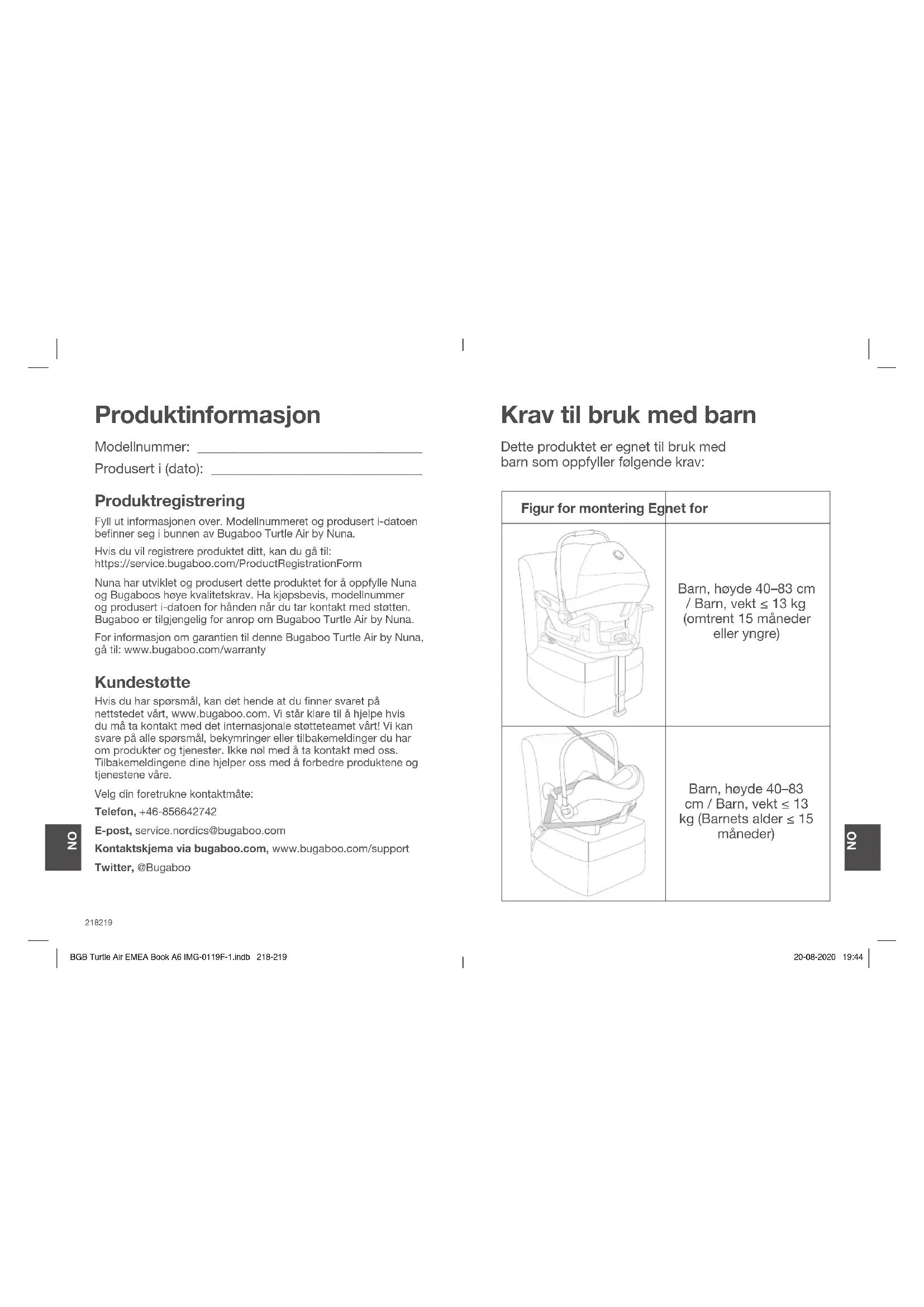 BGB Turtle Air EMEA Book A6 IMG-0119F-1.indb 216-217BGB Turtle Air EMEA Book A6 IMG-0119F-1.indb 216-217 20-08-2020 19:4420-08-2020 19:44Produktinformasjon Modellnummer: _________________________________ Produsert i (dato): _______________________________ Produktregistrering Fyll ut informasjonen over. Modellnummeret og produsert i-datoen benner seg i bunnen av Bugaboo Turtle Air by Nuna. Hvis du vil registrere produktet ditt, kan du gå til: https://service.bugaboo.com/ProductRegistrationForm Nuna har utviklet og produsert dette produktet for å oppfylle Nuna og Bugaboos høye kvalitetskrav. Ha kjøpsbevis, modellnummer og produsert i-datoen for hånden når du tar kontakt med støtten. Bugaboo er tilgjengelig for anrop om Bugaboo Turtle Air by Nuna. For informasjon om garantien til denne Bugaboo Turtle Air by Nuna, gå til: www.bugaboo.com/warranty Kundestøtte Hvis du har spørsmål, kan det hende at du nner svaret på nettstedet vårt, www.bugaboo.com. Vi står klare til å hjelpe hvis du må ta kontakt med det internasjonale støtteteamet vårt! Vi kan svare på alle spørsmål, bekymringer eller tilbakemeldinger du har om produkter og tjenester. Ikke nøl med å ta kontakt med oss. Tilbakemeldingene dine hjelper oss med å forbedre produktene og tjenestene våre. Velg din foretrukne kontaktmåte: Telefon, +46-856642742 E-post, service.nordics@bugaboo.com Kontaktskjema via bugaboo.com, www.bugaboo.com/support Twitter, @Bugaboo Krav til bruk med barn Figur for montering Egnet for Barn, høyde 40–83 cm / Barn, vekt ≤ 13 kg (omtrent 15 måneder eller yngre) Barn, høyde 40–83 cm / Barn, vekt ≤ 13 kg (Barnets alder ≤ 15 måneder) Dette produktet er egnet til bruk med barn som oppfyller følgende krav:
