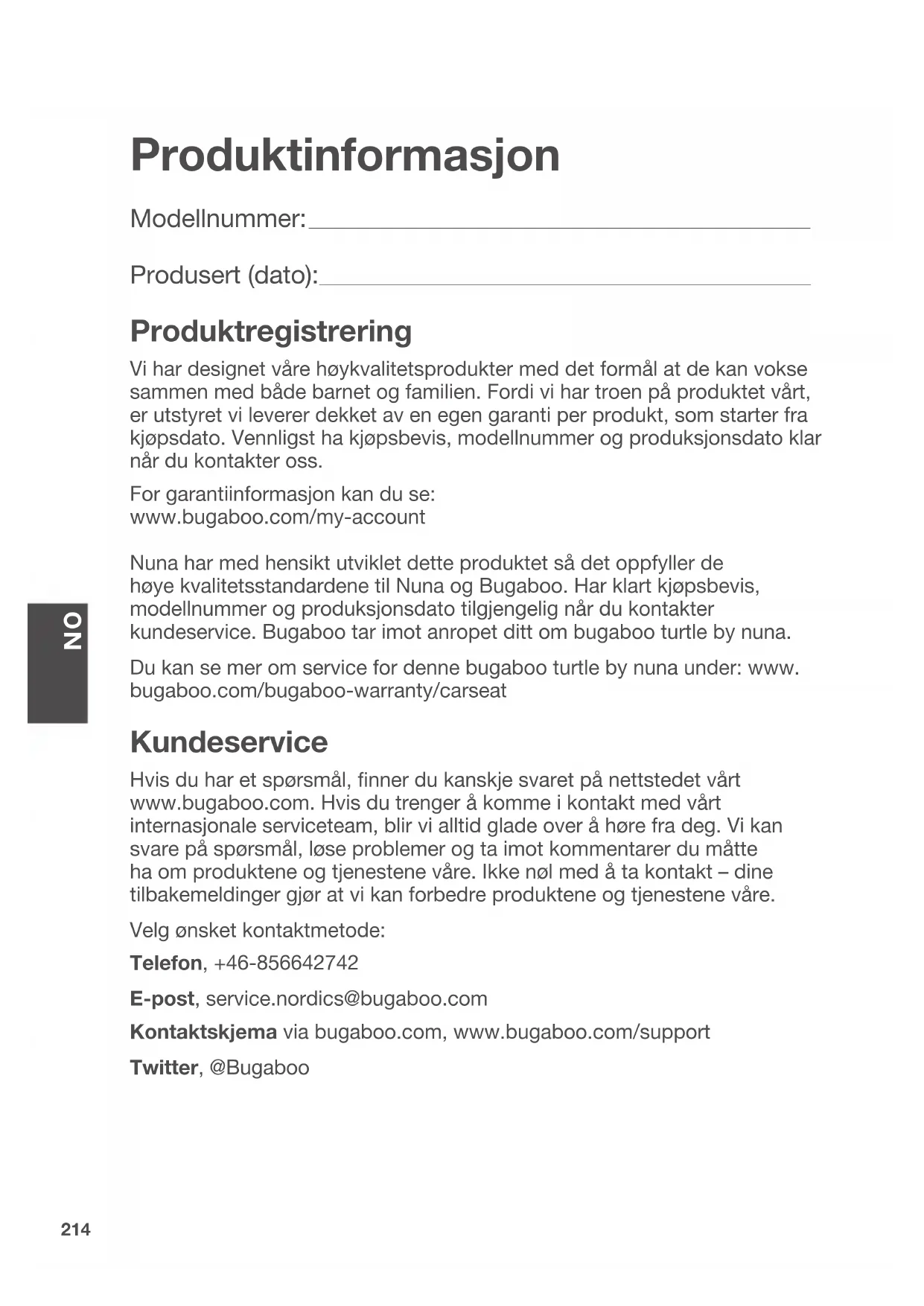 Produktinformasjon Modellnummer: __________________________________________________________________________________________________ Produsert (dato): ________________________________________________________________________________________________ Produktregistrering Vi har designet våre høykvalitetsprodukter med det formål at de kan vokse sammen med både barnet og familien. Fordi vi har troen på produktet vårt, er utstyret vi leverer dekket av en egen garanti per produkt, som starter fra kjøpsdato. Vennligst ha kjøpsbevis, modellnummer og produksjonsdato klar når du kontakter oss. For garantiinformasjon kan du se: www.bugaboo.com/my-account Nuna har med hensikt utviklet dette produktet så det oppfyller de høye kvalitetsstandardene til Nuna og Bugaboo. Har klart kjøpsbevis, modellnummer og produksjonsdato tilgjengelig når du kontakter kundeservice. Bugaboo tar imot anropet ditt om bugaboo turtle by nuna. Du kan se mer om service for denne bugaboo turtle by nuna under: www. bugaboo.com/bugaboo-warranty/carseat Kundeservice Hvis du har et spørsmål, nner du kanskje svaret på nettstedet vårt www.bugaboo.com. Hvis du trenger å komme i kontakt med vårt internasjonale serviceteam, blir vi alltid glade over å høre fra deg. Vi kan svare på spørsmål, løse problemer og ta imot kommentarer du måtte ha om produktene og tjenestene våre. Ikke nøl med å ta kontakt – dine tilbakemeldinger gjør at vi kan forbedre produktene og tjenestene våre. Velg ønsket kontaktmetode: Telefon, +46-856642742 E-post, service.nordics@bugaboo.com Kontaktskjema via bugaboo.com, www.bugaboo.com/support Twitter, @Bugaboo215