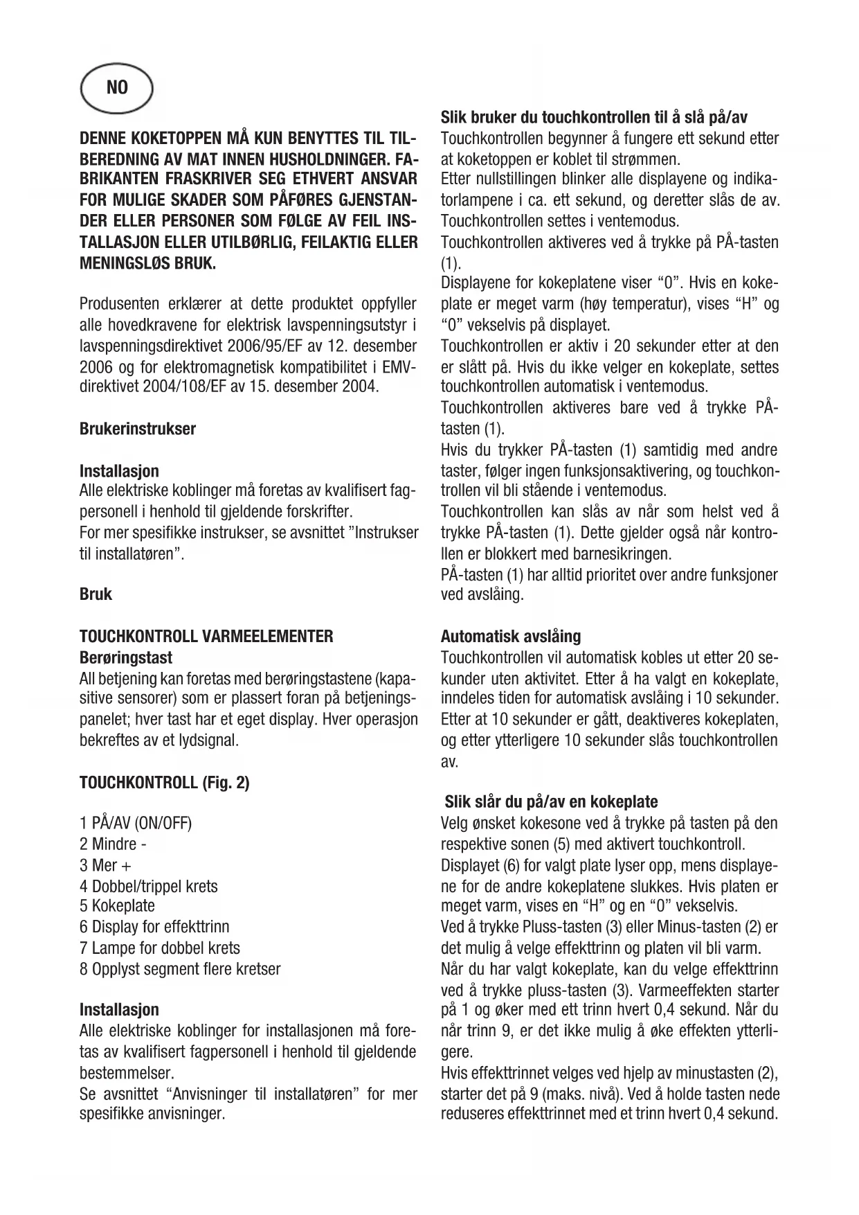 MENINGSLØS BRUK. Produsenten erklærer at dette produktet oppfyller alle hovedkravene for elektrisk lavspenningsutstyr i lavspenningsdirektivet 2006/95/EF av 12. desember 2006 og for elektromagnetisk kompatibilitet i EMV- direktivet 2004/108/EF av 15. desember 2004. Brukerinstrukser Installasjon Alle elektriske koblinger må foretas av kvalifisert fag- personell i henhold til gjeldende forskrifter. For mer spesifikke instrukser, se avsnittet ”Instrukser til installatøren”. Bruk TOUCHKONTROLL VARMEELEMENTER Berøringstast All betjening kan foretas med berøringstastene (kapa- sitive sensorer) som er plassert foran på betjenings- panelet; hver tast har et eget display. Hver operasjon bekreftes av et lydsignal. TOUCHKONTROLL (Fig. 2) 1 PÅ/AV (ON/OFF) 2 Mindre - 3 Mer + 4 Dobbel/trippel krets 5 Kokeplate 6 Display for effekttrinn 7 Lampe for dobbel krets 8 Opplyst segment flere kretser Installasjon Alle elektriske koblinger for installasjonen må fore- tas av kvalifisert fagpersonell i henhold til gjeldende bestemmelser. Se avsnittet “Anvisninger til installatøren” for mer spesifikke anvisninger. Slik bruker du touchkontrollen til å slå på/av Touchkontrollen begynner å fungere ett sekund etter at koketoppen er koblet til strømmen. Etter nullstillingen blinker alle displayene og indika- torlampene i ca. ett sekund, og deretter slås de av. Touchkontrollen settes i ventemodus. Touchkontrollen aktiveres ved å trykke på PÅ-tasten (1). Displayene for kokeplatene viser “0”. Hvis en koke- plate er meget varm (høy temperatur), vises “H” og “0” vekselvis på displayet. Touchkontrollen er aktiv i 20 sekunder etter at den er slått på. Hvis du ikke velger en kokeplate, settes touchkontrollen automatisk i ventemodus. Touchkontrollen aktiveres bare ved å trykke PÅ- tasten (1). Hvis du trykker PÅ-tasten (1) samtidig med andre taster, følger ingen funksjonsaktivering, og touchkon- trollen vil bli stående i ventemodus. Touchkontrollen kan slås av når som helst ved å trykke PÅ-tasten (1). Dette gjelder også når kontro- llen er blokkert med barnesikringen. PÅ-tasten (1) har alltid prioritet over andre funksjoner ved avslåing. Automatisk avslåing Touchkontrollen vil automatisk kobles ut etter 20 se- kunder uten aktivitet. Etter å ha valgt en kokeplate, inndeles tiden for automatisk avslåing i 10 sekunder. Etter at 10 sekunder er gått, deaktiveres kokeplaten, og etter ytterligere 10 sekunder slås touchkontrollen av. Slik slår du på/av en kokeplate Velg ønsket kokesone ved å trykke på tasten på den respektive sonen (5) med aktivert touchkontroll. Displayet (6) for valgt plate lyser opp, mens displaye- ne for de andre kokeplatene slukkes. Hvis platen er meget varm, vises en “H” og en “0” vekselvis. Ved å trykke Pluss-tasten (3) eller Minus-tasten (2) er det mulig å velge effekttrinn og platen vil bli varm. Når du har valgt kokeplate, kan du velge effekttrinn ved å trykke pluss-tasten (3). Varmeeffekten starter på 1 og øker med ett trinn hvert 0,4 sekund. Når du når trinn 9, er det ikke mulig å øke effekten ytterli- gere. Hvis effekttrinnet velges ved hjelp av minustasten (2), starter det på 9 (maks. nivå). Ved å holde tasten nede reduseres effekttrinnet med et trinn hvert 0,4 sekund. NONår du når trinn 0, er det ikke mulig å redusere effe- kten ytterligere. Bare hvis du trykker minustasten (2) eller plusstasten (3) på nytt, er det mulig å endre effekttrinnet igjen. Slik slår du av en kokeplate Velg platen som du ønsker ved hjelp av respektiv tast (5). Displayet (6) for valgt plate lyser opp, mens dis- playene for de andre kokeplatene slukkes. Hvis du trykker pluss- (3) og minus (2) samtidig, stilles effekt- nivået inn på 0. Du kan alternativt bruke minustasten (2) for å redusere effekttrinnet til 0. Hvis en kokeplate er meget varm, vises en “H” og en “0” vekselvis. Slik slår du av alle kokeplatene Ved å trykke PÅ-tasten (1) er det mulig å slå av alle platene med én gang. I ventemodus vises en “H” på displayet for alle kokeplatene som er varme. Resten av displayene er avslåtte. Effekttrinn Hver kokeplate har 9 effekttrinn. Disse angis med symbolene fra “1” til “9” ved hjelp av indikatorlam- pedisplayene (6) med syv segmenter. Restvarmeindikator Restvarmeindikatoren varsler brukeren om at tem- peraturen på kokeplatens keramiske glassflate er meget høy, og vil kunne forårsake brannsår ved berøring. Temperaturen beregnes ut ifra en matema- tisk modell, og i henhold til denne angis restvarmen med “H” på det respektive syvsegmentdisplayet. Oppvarmingen og avkjølingen beregnes på grunnlag av: