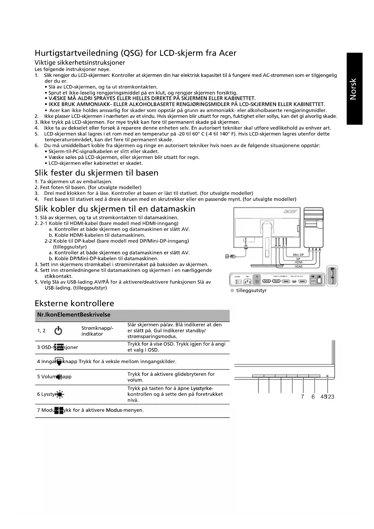 Slik kobler du skjermen til en datamaskin 1. Slå av skjermen, og ta ut strømkontakten til datamaskinen.2. 2-1 Koble til HDMI-kabel (bare modell med HDMI-inngang)a. Kontroller at både skjermen og datamaskinen er slått AV.b. Koble HDMI-kabelen til datamaskinen.2-2 Koble til DP-kabel (bare modell med DP/Mini-DP-inngang) (tilleggsutstyr)a. Kontroller at både skjermen og datamaskinen er slått AV.b. Koble DP/Mini-DP-kabelen til datamaskinen.3. Sett inn skjermens strømkabel i strøminntaket på baksiden av skjermen.4. Sett inn strømledningene til datamaskinen og skjermen i en nærliggende stikkontakt. 5. Velg Slå av USB-lading AV/PÅ for å aktivere/deaktivere funksjonen Slå av USB-lading. (tilleggsutstyr) Eksterne kontrollere Nr. Ikon Element Beskrivelse 1, 2 Strømknapp/-indikatorSlår skjermen på/av. Blå indikerer at den er slått på. Gul indikerer standby/strømsparingsmodus.3 OSD-funksjonerTrykk for å vise OSD. Trykk igjen for å angi et valg i OSD.4 Inngang-knapp Trykk for å veksle mellom inngangskilder.5 VolumknappTrykk for å aktivere glidebryteren for volum.6 LysstyrkeTrykk på tasten for å åpne Lysstyrke-kontrollen og å sette den på foretrukket nivå.7 Modus Trykk for å aktivere Modus-menyen. HDMI HDMI