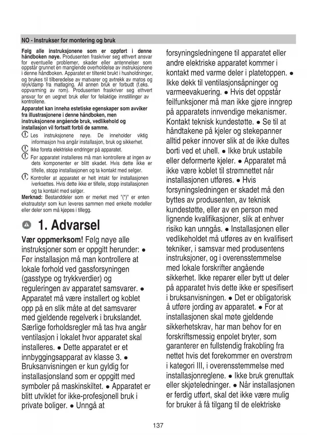 Vær oppmerksom! Følg nøye alle instruksjoner som er oppgitt herunder: ● Før installasjon må man kontrollere at lokale forhold ved gassforsyningen (gasstype og trykkverdier) og reguleringen av apparatet samsvarer. ● Apparatet må være installert og koblet opp på en slik måte at det samsvarer med gjeldende regelverk i brukslandet. Særlige forholdsregler må tas hva angår ventilasjon i lokalet hvor apparatet skal installeres. ● Dette apparatet er et innbyggingsapparat av klasse 3. ● Bruksanvisningen er kun gyldig for installasjonsland som er oppgitt med symboler på maskinskiltet. ● Apparatet er blitt utviklet for ikke-profesjonell bruk i private boliger. ● Unngå at forsyningsledningene til apparatet eller andre elektriske apparatet kommer i kontakt med varme deler i platetoppen. ● Ikke dekk til ventilasjonsåpninger og varmeevakuering. ● Hvis det oppstår feilfunksjoner må man ikke gjøre inngrep på apparatets innvendige mekanismer. Kontakt teknisk kundestøtte. ● Se til at håndtakene på kjeler og stekepanner alltid peker innover slik at de ikke dultes borti ved et uhell. ● Ikke bruk ustabile eller deformerte kjeler. ● Apparatet må ikke være koblet til strømnettet når installasjonen utføres. ● Hvis forsyningsledningen er skadet må den byttes av produsenten, av teknisk kundestøtte, eller av en person med lignende kvalifikasjoner, slik at enhver risiko kan unngås. ● Installasjonen eller vedlikeholdet må utføres av en kvalifisert tekniker, i samsvar med produsentens instruksjoner, og i overensstemmelse med lokale forskrifter angående sikkerhet. Ikke reparer eller bytt ut deler på apparatet hvis dette ikke er spesifisert i bruksanvisningen. ● Det er obligatorisk å utføre jording av apparatet. ● For at installasjonen skal møte gjeldende sikkerhetskrav, har man behov for en forskriftsmessig enpolet bryter, som garanterer en fullstendig frakobling fra nettet hvis det forekommer en overstrøm i kategori III, i overensstemmelse med installasjonreglene. ● Ikke bruk grenuttak eller skjøteledninger. ● Når installasjonen er ferdig utført, skal det ikke være mulig for bruker å få tilgang til de elektriske138 bestanddelene. ● Apparatet og de enkelte delene blir svært varme under bruk. Vær oppmerksom og pass på at ingen berører varmeelementene. ● Pass på at barn ikke leker med apparatet. Sørg for at de holder seg på god avstand, og hold dem under oppsyn hele tiden. Maskindeler kan bli svært varme under bruk. ● Ikke ta på apparatets varmeelementer under og etter bruk. ● Unngå kontakt med kluter eller andre brennbare materialer så lenge apparatets bestanddeler ikke har kjølt seg tilstrekkelig ned. ● Ikke plasser brennbare materialer på apparatet eller i nærheten av dette. ● Overopphetet fett eller olje kan lett ta fyr. Vær særlig oppmerksom når det tilberedes matretter med høyt fett- eller oljeinnhold. ● Hvis overflaten er sprukket, slå øyeblikkelig av apparatet for å unngå muligheten for elektrisk støt. ● Apparatet er ikke laget for å starte ved hjelp av en ekstern tidsinnstiller eller et system med fjernkontroll. ● Kokeprosessen bør overvåkes. ● Prøv ALDRI å slukke flammer med vann. Slå heller av apparatet og kvel flammene med for eksempel et lokk eller ett brannteppe. Brannfare: ikke plasser gjenstander på kokeplaten. ● Ikke bruk damprenser for å rengjøre. ● Før man kobler til produktet må man kontrollere merkeplaten (plassert nederst på apparatet) for å være sikker på at spenning og effekt tilsvarer strømnettets verdier og at også stikkontakten stemmer overens. Ta kontakt med en faglært elektriker hvis du er i tvil. Viktig: ● Etter at apparatet har vært i bruk må platetoppen slås av med den anviste betjeningbryteren. ● For å unngå væskelekkasjer kan man redusere varmeforsyningen. ● Ikke la varmeelementene stå på uten gryter eller med tomme gryter og panner. ● Slå av den aktuelle kokesonen når man er ferdig med å tilberede mat. ● Man må aldri sette tomme kjeler på varmeelementene når disse står på. ● Ikke bruk beholdere som stikker ut fra kantene på platetoppen. ● OBS! Hvis platetoppen i glass ryker: ● 1) Slå av alle brennere umiddelbart og isolere apparatet fra forsyningskildene. ● 2) Ikke ta på apparatets overflater. ● 3) Ikke bruk apparatet. ● OBS! Når gassbrennerne er i bruk skilles det ut varme, fuktighet og rester etter forbrenningen i rommet hvor apparatet er installert. Se til at lokalet er godt ventilert, særlig når apparatet er i bruk. Hold alle ventilasjonsåpninger åpne eller installer en mekanisk ventilasjonsinnretning. ● Hvis apparatet brukes svært intensivt kan det være behov for ekstra ventilasjon (for eksempel ved å åpne vinduet) eller mer effektiv ventilasjon (for eksempel ved å øke mekanisk ventilasjonsnivå der hvor dette er mulig). ● OBS! Apparatet er kun laget for vanlig matlaging i private boliger. All annen bruk er forbudt (f.eks. oppvarming av rom). ● Ikke varm opp en boks eller en blikkboks med mat uten å ha åpnet den først. Disse kan eksplodere! ● Beholderne må settes direkte på platetoppen og midt på kokeplaten. Plasser aldri noe mellom139 gryten og kokeplaten. ● Når gassbrennerne er i bruk skilles det ut varme og fuktighet i lokalet hvor apparatet er blitt installert. Se til at kjøkkenet er tilstrekkelig ventilert. Hold alle ventilasjonsåpninger åpne som påkrevet av gjeldende lovgivning. ● Hvis apparatet brukes over lengre tid kan det være behov for ekstra ventilasjon, for eksempel ved å åpne vinduet. ● Hvis brenneren ikke slår seg å i løpet av 15 sekunder må man åpne vinduet i rommet og vente minst et minutt før man forsøker på nytt. ● For platetopper uten sikkerhetsinnretning må man lukke kranen og ikke forsøke å tenne brenneren igjen før det er gått et minutt. ● Etter steking er det fortsatt god skikk å lukke hovedkranen til røret og/eller flas