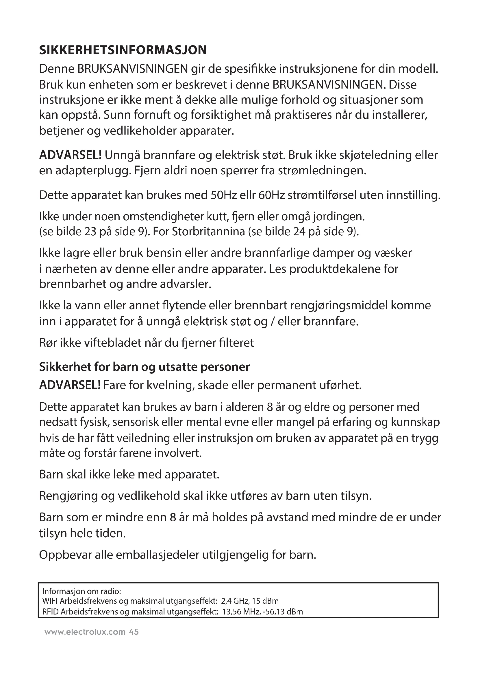CSwww.electrolux.com 45 SIKKERHETSINFORMASJON Denne BRUKSANVISNINGEN gir de spesikke instruksjonene for din modell. Bruk kun enheten som er beskrevet i denne BRUKSANVISNINGEN. Disse instruksjone er ikke ment å dekke alle mulige forhold og situasjoner som kan oppstå. Sunn fornuft og forsiktighet må praktiseres når du installerer, betjener og vedlikeholder apparater. ADVARSEL! Unngå brannfare og elektrisk støt. Bruk ikke skjøteledning eller en adapterplugg. Fjern aldri noen sperrer fra strømledningen. Dette apparatet kan brukes med 50Hz ellr 60Hz strømtilførsel uten innstilling. Ikke under noen omstendigheter kutt, ern eller omgå jordingen. (se bilde 23 på side 9). For Storbritannina (se bilde 24 på side 9). Ikke lagre eller bruk bensin eller andre brannfarlige damper og væsker i nærheten av denne eller andre apparater. Les produktdekalene for brennbarhet og andre advarsler. Ikke la vann eller annet ytende eller brennbart rengjøringsmiddel komme inn i apparatet for å unngå elektrisk støt og / eller brannfare. Rør ikke viftebladet når du erner lteret Sikkerhet for barn og utsatte personer ADVARSEL! Fare for kvelning, skade eller permanent uførhet. Dette apparatet kan brukes av barn i alderen 8 år og eldre og personer med nedsatt fysisk, sensorisk eller mental evne eller mangel på erfaring og kunnskap hvis de har fått veiledning eller instruksjon om bruken av apparatet på en trygg måte og forstår farene involvert. Barn skal ikke leke med apparatet. Rengjøring og vedlikehold skal ikke utføres av barn uten tilsyn. Barn som er mindre enn 8 år må holdes på avstand med mindre de er under tilsyn hele tiden. Oppbevar alle emballasjedeler utilgjengelig for barn. Informasjon om radio: WIFI Arbeidsfrekvens og maksimal utgangseffekt: 2,4 GHz, 15 dBm RFID Arbeidsfrekvens og maksimal utgangseffekt: 13,56 MHz, -56,13 dBmwww.electrolux.com46 Elektrisk montering ADVARSEL! Unngå brannfare og elektrisk støt Hvis du ikke er sikker på at stikkontakten er tilstrekkelig jordet eller beskyttet med en treg sikring eller strømbryter, må du installere en egnet stikkontakt i henhold til de gjeldende lokale elektriske forskrifter og bestemmelser. Bruk ikke en skjøteledning eller en adapterplugg. Trekk aldri ut støpslet med strømledningen. Ta alltid et godt grep på støpslet og trekk den rett ut av stikkontakten. Klyp, bøy eller knyt aldri strømledningen. Du må aldri kutte eller skade strømledningen. Hvis strømledningen er skadet må den kun byttes ut av en autorisert Electrolux serviceperson. Denne enheten inneholder ingen deler som kan repareres av brukeren. Tillkall alltid en autorisert serviceperson fra Electrolux. Dersom strømforsyningskabelen er skadet, må den skiftes av produsenten, serviceagenten eller et autorisert serviceverksted for å unngå fare. Sørg for at du trekker ut strømkontakten til enheten før rengjøringen slik at du unngår risiko for støt eller brann. Sikkerhetsmessige forholdsregler FORSIKTIGHET! Unngå alvorlig skade eller dødsfall. Stikk ikke ngre eller gjenstander i luftutslippsområdet eller frontgitteret på enheten. Ikke start eller stopp enheten ved å trekke ut strømledningen eller slå av strømmen i sikringsskapet. Ved funksjonsfeil (gnister, brennende lukt osv.), må apparatet umiddelbart slås av, koble fra strømledningen og ringe en autorisert Electrolux serviceperson. Ikke betjen enheten med våte hender. Trekk ikke i strømledningen. FORSIKTIG! Unngå personskade eller skade på enhten eller annen eiendom. Ikke led luftstrømmen mot peis eller andre varme relaterte kilder, da dette kan forårsake at ild ammer opp. Du må ikke klatre eller plassere ting på enheten. Heng ikke ting på enheten. Plasser ikke væskebeholdere på enheten. Slå av strømtilførselen når den ikke skal brukes over et lengre tidsrom. Bruk enheten med lteret på plass. Ikke blokkér eller dekk inntaksgitteret, utblåsingsområdet og utløpsportene. AVHENDING Dette symbolet på produktet eller på emballasjen indikerer at produktet ikke kan behandles som husholdningsavfall. NORSK Takk igjen for at du velger PURE A9 40/PURE A9 60 luftrenser fra Electrolux. Bruk alltid originalt tilbehør og reservedeler for å oppnå de beste resultatene. Dette produktet er utviklet med tanke på miljøet. Alle plastdeler er merket for gjenvinningsformål.