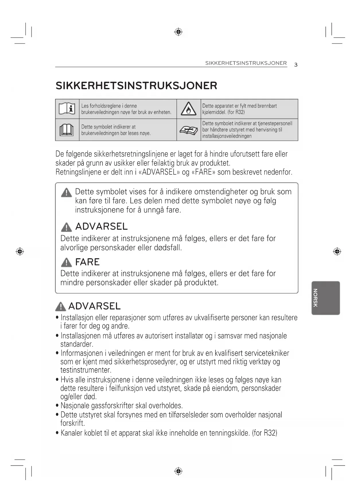 Les forholdsreglene i denne brukerveiledningen nøye før bruk av enheten. Dette apparatet er fylt med brennbart kjølemiddel. (for R32) Dette symbolet indikerer at brukerveiledningen bør leses nøye. Dette symbolet indikerer at tjenestepersonell bør håndtere utstyret med henvisning til installasjonsveiledningen SIKKERHETSINSTRUKSJONER De følgende sikkerhetsretningslinjene er laget for å hindre uforutsett fare eller skader på grunn av usikker eller feilaktig bruk av produktet. Retningslinjene er delt inn i «ADVARSEL» og «FARE» som beskrevet nedenfor. ADVARSEL Dette indikerer at instruksjonene må følges, ellers er det fare for alvorlige personskader eller dødsfall. FARE Dette indikerer at instruksjonene må følges, ellers er det fare for mindre personskader eller skader på produktet. Dette symbolet vises for å indikere omstendigheter og bruk som kan føre til fare. Les delen med dette symbolet nøye og følg instruksjonene for å unngå fare.