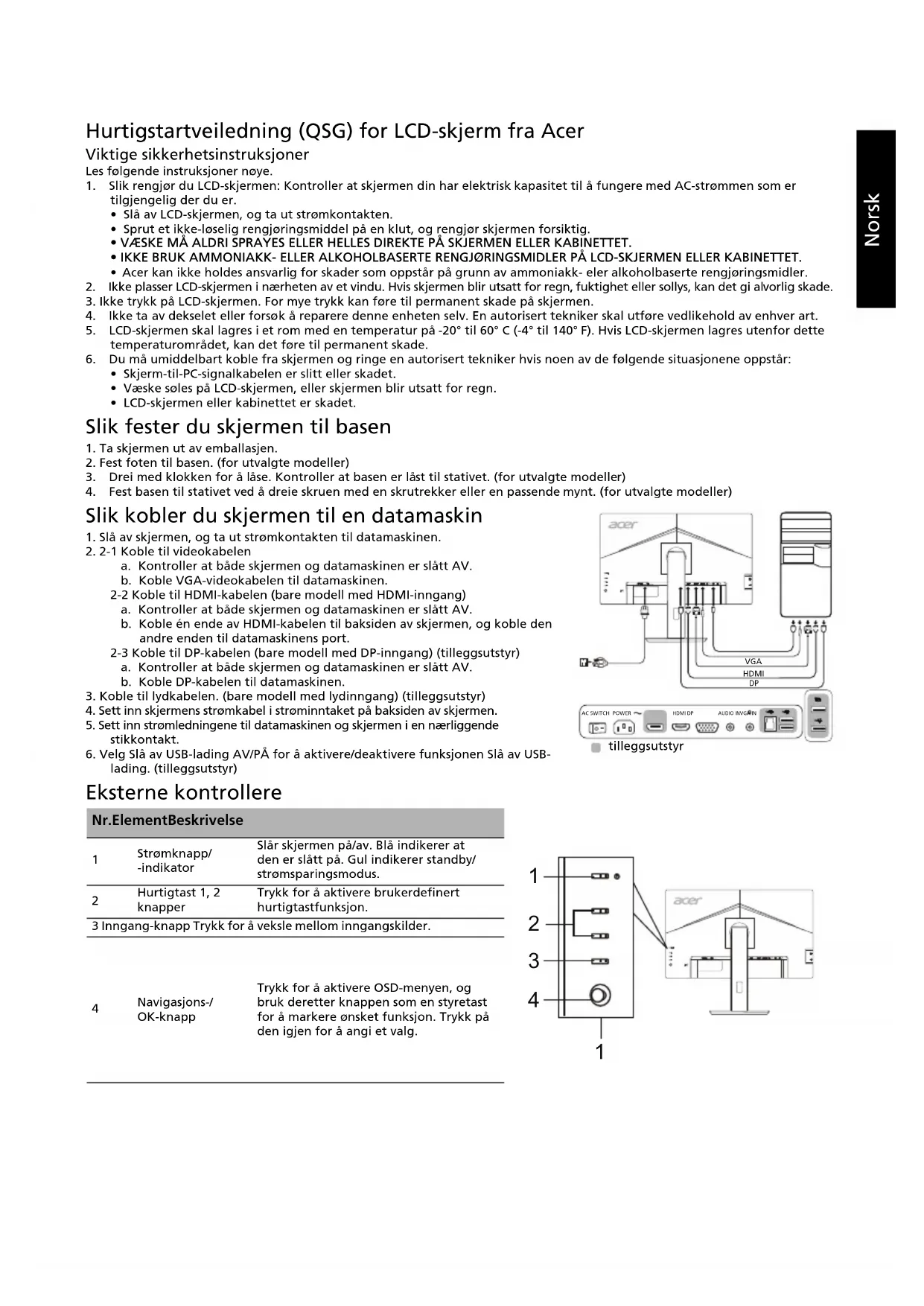 Slik kobler du skjermen til en datamaskin 1. Slå av skjermen, og ta ut strømkontakten til datamaskinen.2. 2-1 Koble til videokabelena. Kontroller at både skjermen og datamaskinen er slått AV.b. Koble VGA-videokabelen til datamaskinen. 2-2 Koble til HDMI-kabelen (bare modell med HDMI-inngang)a. Kontroller at både skjermen og datamaskinen er slått AV. b. Koble én ende av HDMI-kabelen til baksiden av skjermen, og koble den andre enden til datamaskinens port.2-3 Koble til DP-kabelen (bare modell med DP-inngang) (tilleggsutstyr)a. Kontroller at både skjermen og datamaskinen er slått AV.b. Koble DP-kabelen til datamaskinen.3. Koble til lydkabelen. (bare modell med lydinngang) (tilleggsutstyr)4. Sett inn skjermens strømkabel i strøminntaket på baksiden av skjermen.5. Sett inn strømledningene til datamaskinen og skjermen i en nærliggende stikkontakt. 6. Velg Slå av USB-lading AV/PÅ for å aktivere/deaktivere funksjonen Slå av USB-lading. (tilleggsutstyr) Eksterne kontrollere Nr. Element Beskrivelse