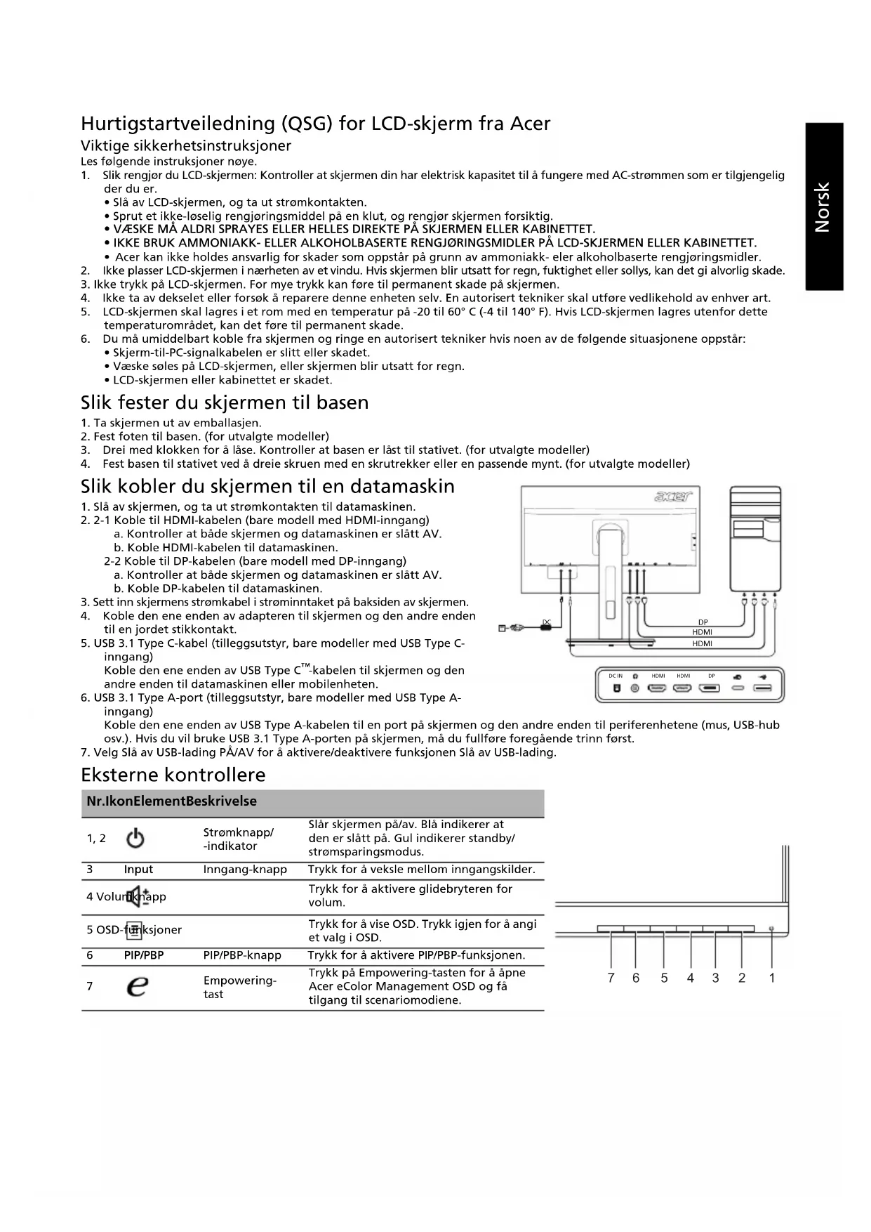 DC IN 1234567Norsk Forskrifter og sikkerhetsmerknader FCC-merknad Denne enheten er testet og funnet i samsvar med grensene for klasse B, digital enhet ifølge del 15 av FCC-reglene. Disse grensene er utformet for å gi rimelig beskyttelse mot skadelige forstyrrelser i en boliginstallasjon. Denne enheten lager, bruker og kan utstråle radiofrekvensenergi, og hvis den ikke installeres og brukes i samsvar med instruksjonene, kan den forårsake skadelig forstyrrelse på radiokommunikasjon. Det er imidlertid ingen garanti for at forstyrrelse ikke vil oppstå i en bestemt installasjon. Hvis denne enheten forårsaker skadelig forstyrrelser for radio- eller TV-mottak, som kan fastslås ved å slå enheten av og på, oppfordres brukeren til å prøve å korrigere forstyrrelsen med ett eller flere av følgende tiltak: Snu eller flytt mottakerantennen. Øk avstanden mellom enhet og mottaker. Koble enheten til en stikkontakt på en annen krets enn den mottakeren er koblet til. Ta kontakt med forhandleren eller en erfaren radio-/TV-tekniker for å få hjelp. CE-erklæring om samsvar Herved erklærer Acer Inc. at denne LCD-skjermen er i samsvar med de grunnleggende krav og øvrige relevante krav i EMC-direktiv 2014/30/EU, lavspenningsdirektivet 2014/35/EU og RoHS-direktiv 2011/65/EU og direktiv 2009/125/EF med hensyn til etablering av et rammeverk for fastsettelse av krav til miljøvennlig utforming av energirelatert produkt. Merknad: For å forhindre skade på skjermen må du ikke løfte den etter skjermfoten. Merknad: Skjermede kabler Alle tilkoblinger til andre databehandlingsenheter må skje med skjermede kabler for å opprettholde samsvar med EMC-forskriftene. Merknad: Perifere enheter Bare periferutstyr (enheter for inngang/utgang, terminaler, skrivere osv.) som er sertifisert i samsvar med klasse B-grensene, kan kobles til dette utstyret. Drift med ikke-sertifisert periferutstyr vil sannsynligvis føre til forstyrrelse i radio- og TV-mottak. Advarsel Endringer eller modifikasjoner som ikke uttrykkelig er godkjent av produsenten, kan annullere brukerens autorisasjon, som er tildelt av Federal Communications Commission, til å bruke dette produktet. Driftsbetingelser Denne enheten er i samsvar med del 15 av FCC-reglene. Driften er underlagt følgende to betingelser: (1) denne enheten kan ikke forårsake skadelig forstyrrelse, og (2) denne enheten må godta eventuell mottatt forstyrrelse, inkludert forstyrrelse som kan forårsake uønsket drift. Merknad: Kanadiske brukere Dette digitale apparatet i klasse B er i samsvar med kanadiske ICES-003. Remarque à l'intention des utilisateurs canadiens Cet appareil numérique de la classe B est conforme à la norme NMB-003 du Canada. Avhending av brukt utstyr fra brukere i private husholdninger i EU Dette symbolet på produktet eller på emballasjen viser at dette produktet ikke må kastes sammen med annet husholdningsavfall. I stedet er det ditt ansvar å avhende utstyret ved å levere det til et innsamlingspunkt for resirkulering av elektrisk og elektronisk utstyr. Separat innsamling og gjenvinning av brukt utstyr på tidspunktet for avhending vil bidra til å bevare naturressurser og sikre at det resirkuleres på en måte som beskytter helse og miljø. Hvis du vil ha mer informasjon om hvor du kan levere utstyret til resirkulering, kan du kontakte lokale myndigheter, renovasjonstjenesten eller butikken der du kjøpte produktet. Advarselsmelding for magnet Enkelte elektroniske enheter som harddisker, USB-enheter, nettbrett, bærbare datamaskiner, mobiltelefoner, klokker, øretelefoner, høyttalere, kredittkort, magnetiske ID-kort osv. er følsomme for magnetfelt og kan skades permanent eller bli midlertidig deaktivert hvis de utsettes for et magnetfelt som er for sterkt. Elektroniske enheter bør ikke settes nær eller direkte på den magnetiske delen av skjermbasen. MagnetNorsk SPESIFIKASJON Finn håndbøker og andre dokumenter for Acer-produktet ditt på den offisielle supportnettsiden for Acer.