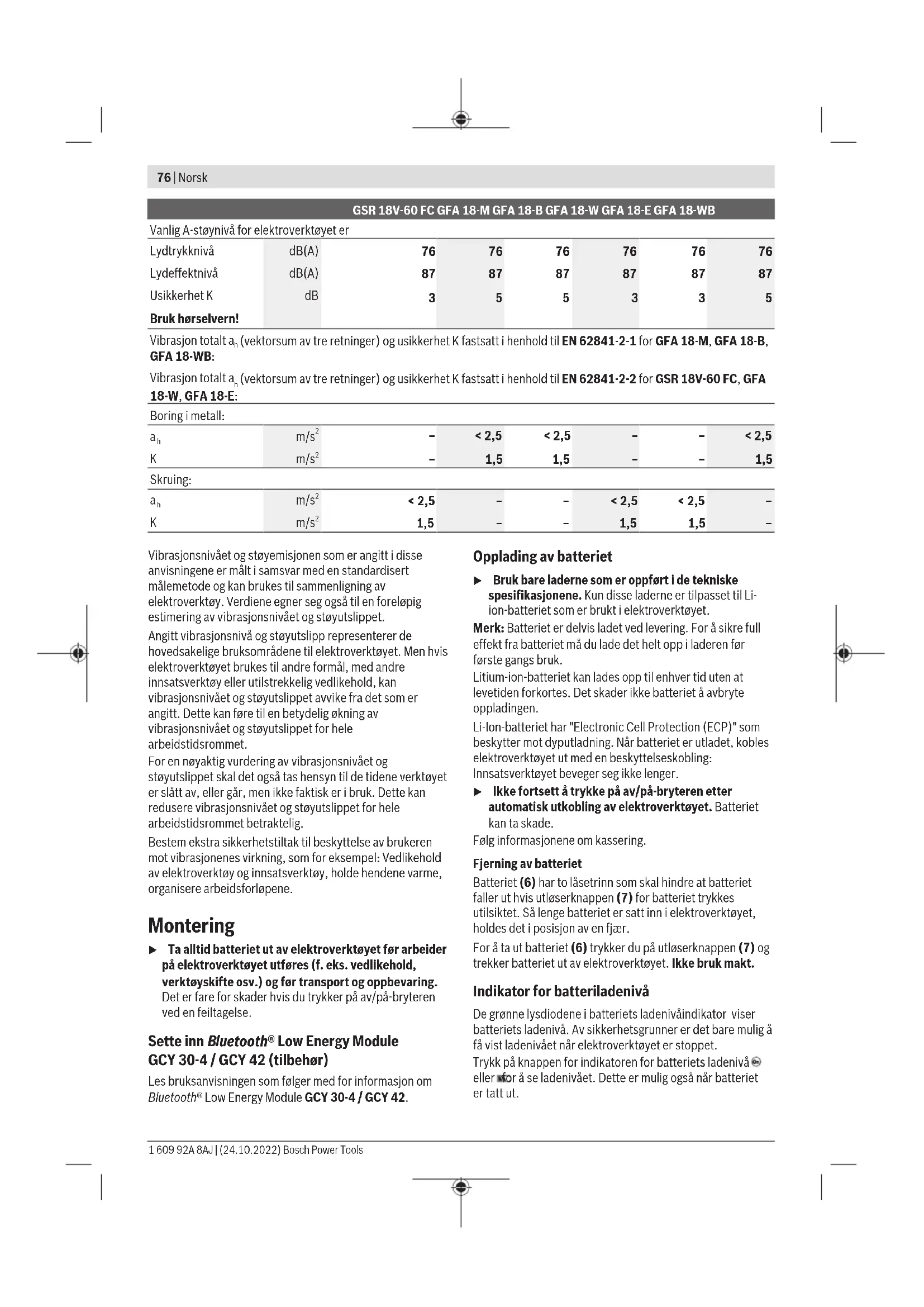 Vibrasjonsnivået og støyemisjonen som er angitt i disse anvisningene er målt i samsvar med en standardisert målemetode og kan brukes til sammenligning av elektroverktøy. Verdiene egner seg også til en foreløpig estimering av vibrasjonsnivået og støyutslippet. Angitt vibrasjonsnivå og støyutslipp representerer de hovedsakelige bruksområdene til elektroverktøyet. Men hvis elektroverktøyet brukes til andre formål, med andre innsatsverktøy eller utilstrekkelig vedlikehold, kan vibrasjonsnivået og støyutslippet avvike fra det som er angitt. Dette kan føre til en betydelig økning av vibrasjonsnivået og støyutslippet for hele arbeidstidsrommet. For en nøyaktig vurdering av vibrasjonsnivået og støyutslippet skal det også tas hensyn til de tidene verktøyet er slått av, eller går, men ikke faktisk er i bruk. Dette kan redusere vibrasjonsnivået og støyutslippet for hele arbeidstidsrommet betraktelig. Bestem ekstra sikkerhetstiltak til beskyttelse av brukeren mot vibrasjonenes virkning, som for eksempel: Vedlikehold av elektroverktøy og innsatsverktøy, holde hendene varme, organisere arbeidsforløpene. Montering u Ta alltid batteriet ut av elektroverktøyet før arbeider på elektroverktøyet utføres (f.eks. vedlikehold, verktøyskifte osv.) og før transport og oppbevaring. Det er fare for skader hvis du trykker på av/på-bryteren ved en feiltagelse. Sette inn Bluetooth® Low Energy Module GCY30-4 / GCY 42 (tilbehør) Les bruksanvisningen som følger med for informasjon om Bluetooth® Low Energy Module GCY30-4 / GCY 42. Opplading av batteriet u Bruk bare laderne som er oppført i de tekniske spesifikasjonene. Kun disse laderne er tilpasset til Li- ion-batteriet som er brukt i elektroverktøyet. Merk: Batteriet er delvis ladet ved levering. For å sikre full effekt fra batteriet må du lade det helt opp i laderen før første gangs bruk. Litium-ion-batteriet kan lades opp til enhver tid uten at levetiden forkortes. Det skader ikke batteriet å avbryte oppladingen. Li-Ion-batteriet har "Electronic Cell Protection (ECP)" som beskytter mot dyputladning. Når batteriet er utladet, kobles elektroverktøyet ut med en beskyttelseskobling: Innsatsverktøyet beveger seg ikke lenger. u Ikke fortsett å trykke på av/på-bryteren etter automatisk utkobling av elektroverktøyet. Batteriet kan ta skade. Følg informasjonene om kassering. Fjerning av batteriet Batteriet (6) har to låsetrinn som skal hindre at batteriet faller ut hvis utløserknappen (7) for batteriet trykkes utilsiktet. Så lenge batteriet er satt inn i elektroverktøyet, holdes det i posisjon av en fjær. For å ta ut batteriet (6) trykker du på utløserknappen (7) og trekker batteriet ut av elektroverktøyet. Ikke bruk makt. Indikator for batteriladenivå De grønne lysdiodene i batteriets ladenivåindikator viser batteriets ladenivå. Av sikkerhetsgrunner er det bare mulig å få vist ladenivået når elektroverktøyet er stoppet. Trykk på knappen for indikatoren for batteriets ladenivå eller for å se ladenivået. Dette er mulig også når batteriet er tatt ut. 1 609 92A 8AJ | (24.10.2022) Bosch Power ToolsNorsk | 77 Hvis ingen lysdiode lyser etter at knappen for indikatoren for batteriets ladenivå er trykt inn, er batteriet defekt og må skiftes ut. Batteritype GBA 18V... Lysdioder Kapasitet Kontinuerlig lys 3× grønt 60−100% Kontinuerlig lys 2× grønt 30−60% Kontinuerlig lys 1× grønt 5−30% Blinker 1× grønt 0−5% Batteritype ProCORE18V... Lysdioder Kapasitet Kontinuerlig lys 5× grønt 80−100 % Kontinuerlig lys 4× grønt 60−80 % Kontinuerlig lys 3× grønt 40−60 % Kontinuerlig lys 2× grønt 20−40 % Kontinuerlig lys 1× grønt 5−20 % Blinker 1× grønt 0−5 % Verktøyskifte Feste innsatsverktøy (se bilde A) Skyv låsehylsen (2) bakover, og sett innsatsverktøyet i holderen (1) ved å dreie det. Slipp låsehylsen (2) igjen for å låse innsatsverktøyet Ta ut innsatsverktøyet Skyv låsehylsen (2) bakover, og trekk innsatsverktøyet ut av holderen (1). Montere forsats (se bilde B) Fjern innsatsverktøyet. Sett forsatsen i holderen (1). Drei låseringen (16) til det høres at den går i inngrep. Sette innsatsverktøyet i forsatsen GFA18-E/GFA18-W (se bilde C): Skyv låsehylsen (2) bakover, og sett innsatsverktøyet i holderen (1) ved å dreie det. Slipp låsehylsen (2) igjen for å låse innsatsverktøyet GFA 18-M/GFA 18-B/GFA 18-WB (se bilde D): Åpne chuckforsatsen ved må dreie i dreieretningen ❶ til innsatsverktøyet kan settes inn. Sett inn innsatsverktøyet. Drei hylsen til chuckforsatsen for hånd i dreieretningen ❷ til den sitter godt fast. Chucken blir da automatisk låst. Dreie forsatsen (se bilde E) Trekk den låste forsatsen ca. 5 mm fra elektroverktøyet. Drei forsatsen til ønsket posisjon, og slipp den igjen. Demontere forsatsen (se bilde F) Fjern innsatsverktøyet. Løsne forsatsen i retningen , og trekk den ut av holderen (1). Støv-/sponavsuging Støv fra materialer som blyholdig maling, noen tresorter, mineraler og metall kan være helsefarlige. Berøring eller innånding av støv kan utløse allergiske reaksjoner og/eller åndedrettssykdommer hos brukeren eller personer som befinner seg i nærheten. Visse typer støv som eik- eller bøkstøv gjelder som kreftfremkallende, spesielt i kombinasjon med tilsetningsstoffer til trebearbeidelse (kromat, trebeskyttelsesmidler). Asbestholdig materiale må kun bearbeides av fagfolk. – Sørg for god ventilasjon av arbeidsplassen. – Det anbefales å bruke en støvmaske med filterklasse P2. Følg ditt lands gyldige forskrifter for de materialene som skal bearbeides. u Unngå støv på arbeidsplassen. Støv kan lett antennes. Bruk Igangsetting Innsetting av batteriet Merknad: Bruk av batterier som ikke passer til elektroverktøyet kan føre til funksjonsfeil eller skade på elektroverktøyet. Still dreieretningsomkobleren (9) på midten for å hindre utilsiktet innkobling. Sett det ladede batteriet (6) i håndtaket 