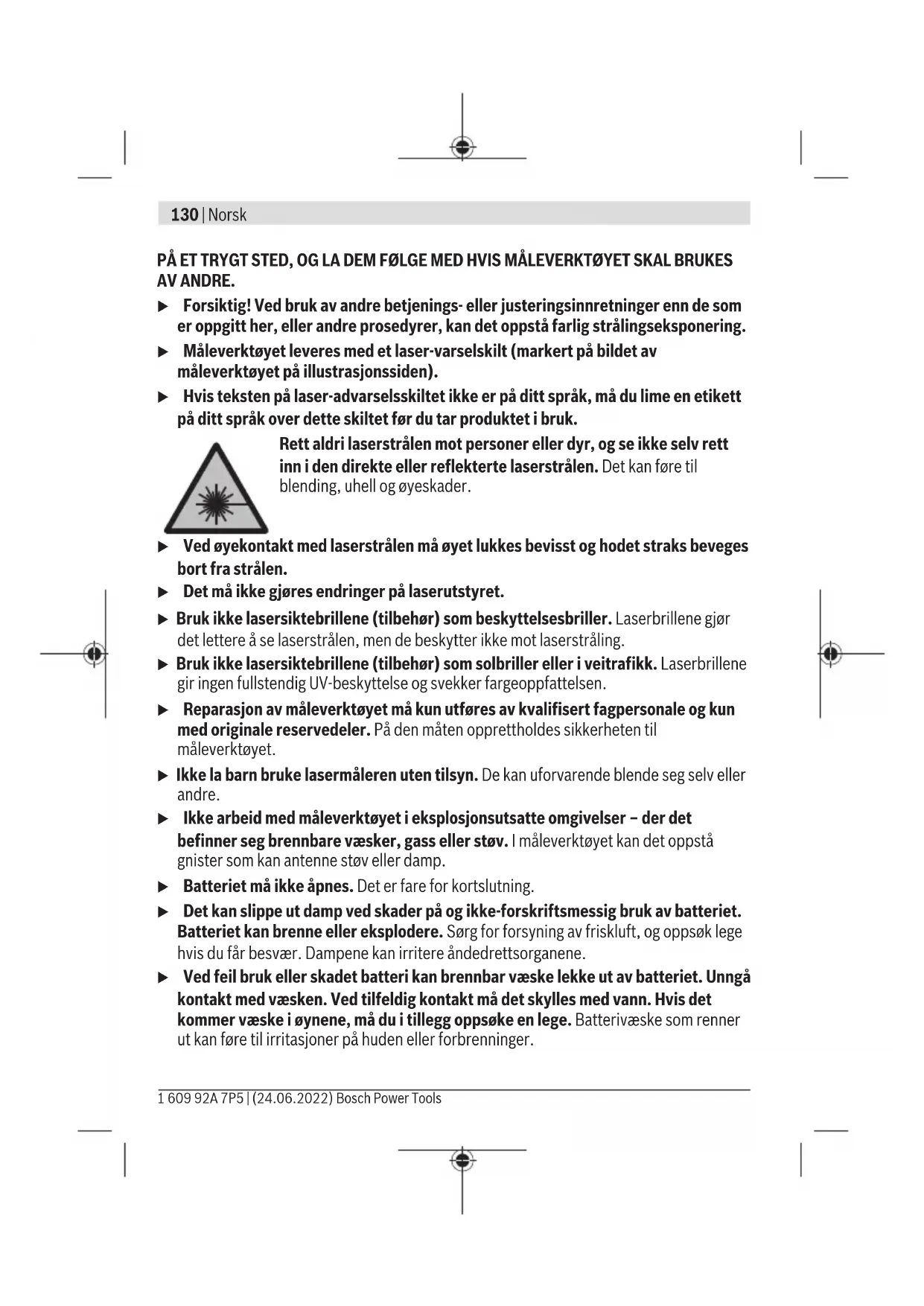2609120713 (EU) 1 609 92A 7P5 | (24.06.2022) Bosch Power ToolsNorsk | 135 Digital lasermåler GLM 50-22 GLM 50-23 G GLM 50-25 G 2609120718 (UK) 1600A013A0 (ARG) 1600A013A1 (MEX) 1600A013A2 (BRL) A) Ved måling fra forkanten på måleverktøyet, gjelder for mål med høy refleksjonsevne (for eksempel en hvitmalt vegg), svakt bakgrunnslys og driftstemperatur på 25°C; i tillegg må det påregnes et avstandsavhengig avvik på ±0,05mm/m. B) Ved måling fra forkanten på måleverktøyet, gjelder for mål med høy refleksjonsevne (for eksempel en hvitmalt vegg), sterkt bakgrunnslys, en driftstemperatur på 25°C og i høyden. Det må i tillegg påregnes et avstandsavhengig avvik på ±0,15mm/m. C) I funksjonen kontinuerlig måling er maks. driftstemperatur +40 °C. D) Det oppstår bare ikke-ledende smuss, men det forventes nå og da forbigående ledeevne forårsaket av kondens. E) Du finner flere tekniske data på https://www.bosch-professional.com/ecodesign Måleverktøyet ditt identifiseres entydig med serienummeret (11) på typeskiltet. Sette inn / bytte batteri Skift alltid ut alle de oppladbare batteriene eller engangsbatteriene samtidig. Bruk bare batterier fra én produsent og med samme kapasitet. Pass på riktig polaritet, som vist på innsiden av batterirommet. u Ta batteriene, enten du bruker engangsbatterier eller oppladbare, ut av måleverktøyet når du ikke skal bruke det på lengre tid. Ved langvarig lagring kan batteriene korrodere og selvutlades. Lagre aldri måleverktøyet uten påsatt batterideksel(13) eller li-ion- batteripakke(19) (tilbehør), særlig i støvete eller fuktige omgivelser. Li-ion-batteripakke (tilbehør) Sette inn/bytte li-ion-batteripakke (tilbehør) Sett inn li-ion-batteripakken(19) (tilbehør). Bosch Power Tools 1 609 92A 7P5 | (24.06.2022)136 | Norsk For å ta ut li-ion-batteripakken(19) (tilbehør) trykker du på låsen(20) og tar li-ion- batteripakken ut. (se Fig. A, Side5) Lade li-ion-batteripakken (tilbehør) u Bruk en USB-strømadapter til opplading, med tekniske data (spenning og ladestrøm) som stemmer med den anbefalte strømadapteren. Se bruksanvisningen for USB- strømadapteren. Anbefalt strømadapter: se tekniske data. u Vær oppmerksom på nettspenningen! Spenningen til strømkilden må stemme overens med angivelsene på strømadapterens typeskilt. Strømadaptere som er merket med 230V kan også brukes med 220V. Litium-ion-batterier leveres delvis ladet på grunn av internasjonale transportforskrifter. For å sikre full effekt fra batteriet må du lade det helt opp før første gangs bruk. Se nettversjonen av bruksanvisningen hvis du ønsker mer informasjon: www.bosch-pt.com/manuals Bruk Igangsetting u Ikke gå fra måleverktøyet når det er slått på, og slå alltid av måleverktøyet etter bruk. Andre personer kan bli blendet av laserstrålen. u Beskytt måleverktøyet mot fuktighet og direkte sollys.u Måleverktøyet må ikke utsettes for ekstreme temperaturer eller temperatursvingninger. La det for eksempel ikke ligge lenge i bilen. Ved store temperatursvingninger bør måleverktøyet tempereres før det brukes. Ved ekstreme temperaturer eller temperatursvingninger kan målevertøyets presisjon svekkes. u Pass på at måleverktøyet ikke utsettes for harde slag eller fall. Etter sterk ytre påvirkning på måleverktøyet bør du alltid kontrollere nøyaktigheten (se „Kontrollere nøyaktigheten“, Side140) før du fortsetter arbeidet. Slå på/av Trykk på knappen for å slå på måleverktøyet og laseren. Du kan også slå på måleverktøyet uten laseren ved å trykke på knappen . 1 609 92A 7P5 | (24.06.2022) Bosch Power ToolsNorsk | 137 Hold knappen inntrykt for å slå av måleverktøyet. Verdiene i minnet og enhetsinnstillingene beholdes. Måling Etter at det er slått på for første gang, er måleverktøyet i funksjonen lengdemåling. Når måleverktøyet slås på igjen senere, er det alltid i den sist brukte målefunksjonen. Verktøyet har tre innstillinger for referanseplan for målingen. (se „Valg av referanseplan“, Side137) Legg måleverktøyet inntil det ønskede startpunktet for målingen (for eksempel en vegg). Når du har slått på måleverktøyet med knappen , trykker du kort på knappen for å slå på laseren. Trykk på knappen for å utløse målingen. Etter målingen slås laserstrålen av. For flere målinger gjentar du denne prosedyren. Måleverdier eller sluttresultater kan adderes eller subtraheres. Se nettversjonen av bruksanvisningen hvis du ønsker mer informasjon: www.bosch-pt.com/manuals Måleverktøyet skal ikke beveges under en måling (med unntak av funksjonen kontinuerlig måling). Legg derfor måleverktøyet helst på et fast underlag. Mottakerlinsen(15) og laseråpningen(16) må ikke være tildekket under måling. Valg av referanseplan Du kan velge mellom forskjellige referanseplan for målingen: bakkanten på måleverktøyet (for eksempel når det legges inntil vegger) midten av stativgjengene (14) (for eksempel ved måling med stativ) forkanten på måleverktøyet (for eksempel ved måling fra en bordkant) Bosch Power Tools 1 609 92A 7P5 | (24.06.2022)138 | Norsk Se nettversjonen av bruksanvisningen hvis du ønsker mer informasjon: www.bosch-pt.com/manuals Meny Grunnleggende innstillinger I menyen Grunnleggende innstillinger finner du følgende grunnleggende innstillinger: – Favoritt-funksjon – Skifte referanseplan (se „Valg av referanseplan“, Side137) – Slå lydsignaler på/av – Slå displaylyset på/av – Slå på/av batterisparemodus – Bytte måleenhet – Slå på/av vibrasjon (GLM 50-25 G) – Stille inn språk – Åpne informasjonen om verktøyet – Fabrikkinnstilling – Internt minne – Kalibrering helningsmåling (se „Kontrollere nøyaktigheten“, Side140) (GLM 50-23